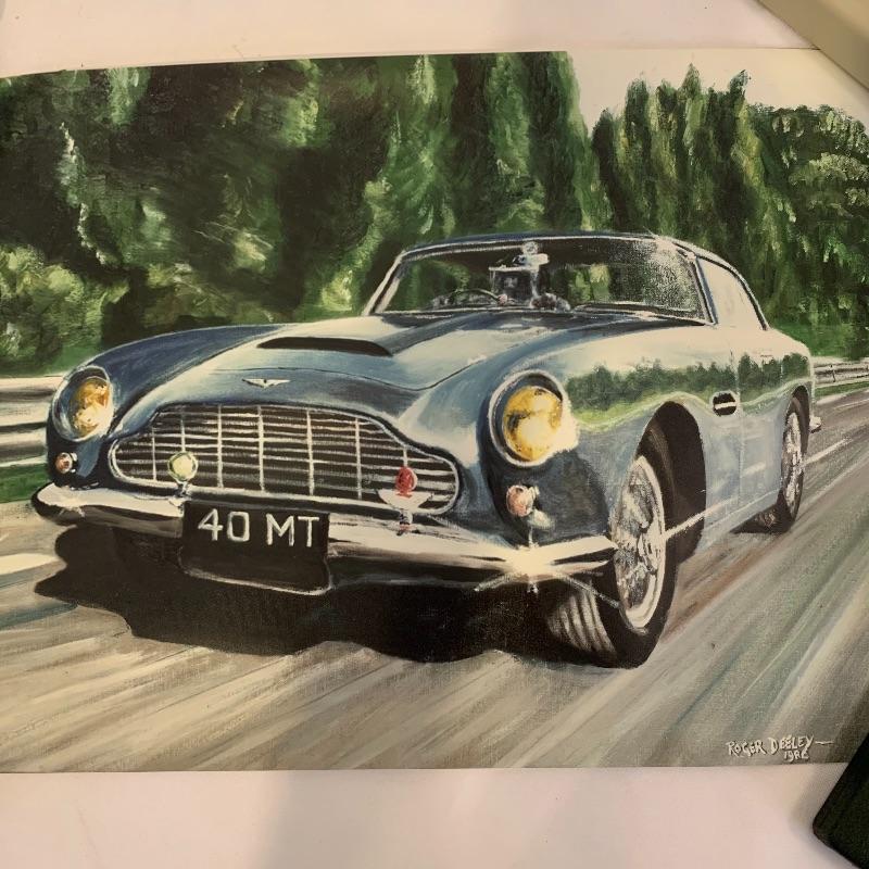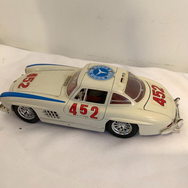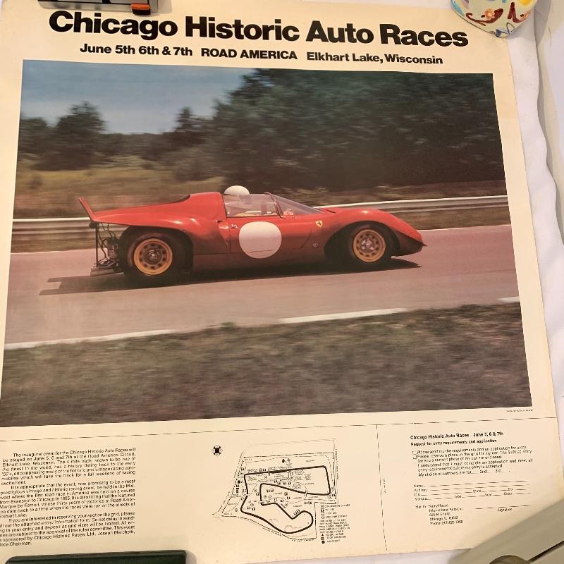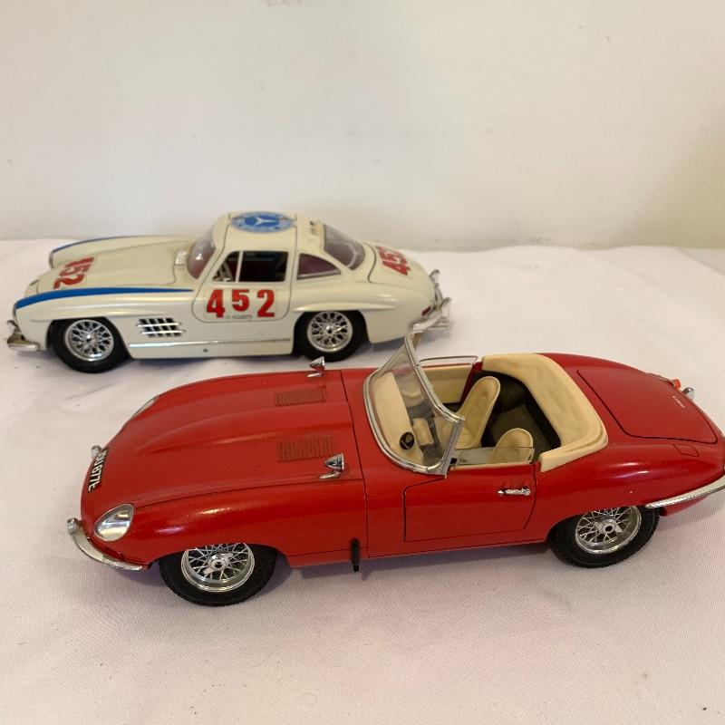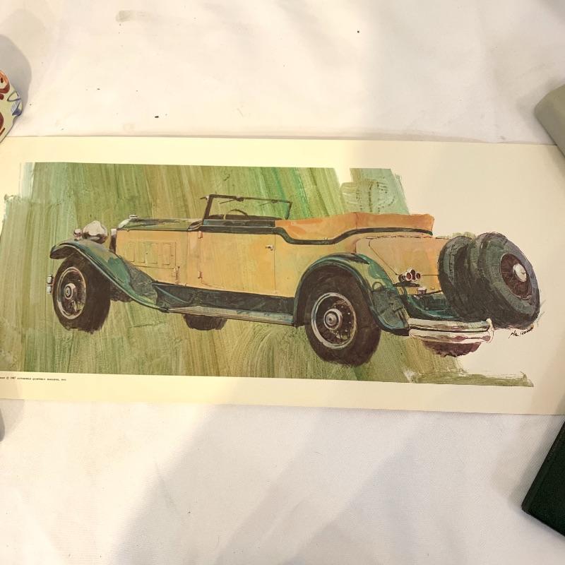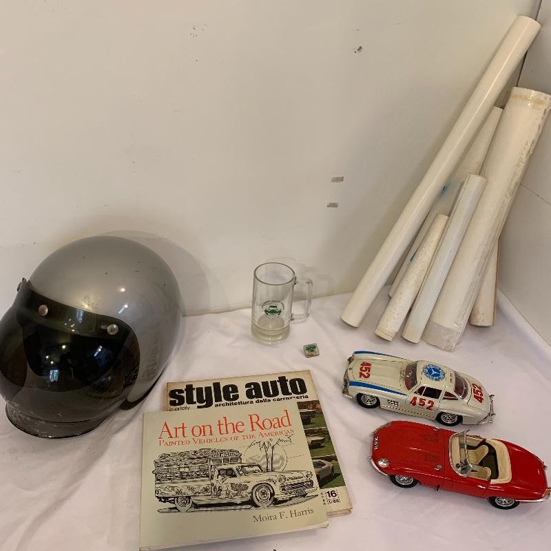 This lot contains a red (10” x 4” x 2”) and a white (10” x 4” x 3”) model car. The red is a Jaguar, and the white is a Mercedes. Also included is a racing helmet, two auto books (“Art on the Road” & “Style Auto”), several posters of varying sizes, a glass mug, and a pin. Lastly, there are two books about Ferrari’s and two pictures (20” x 17”) of red Ferraris. Local pickup only.
