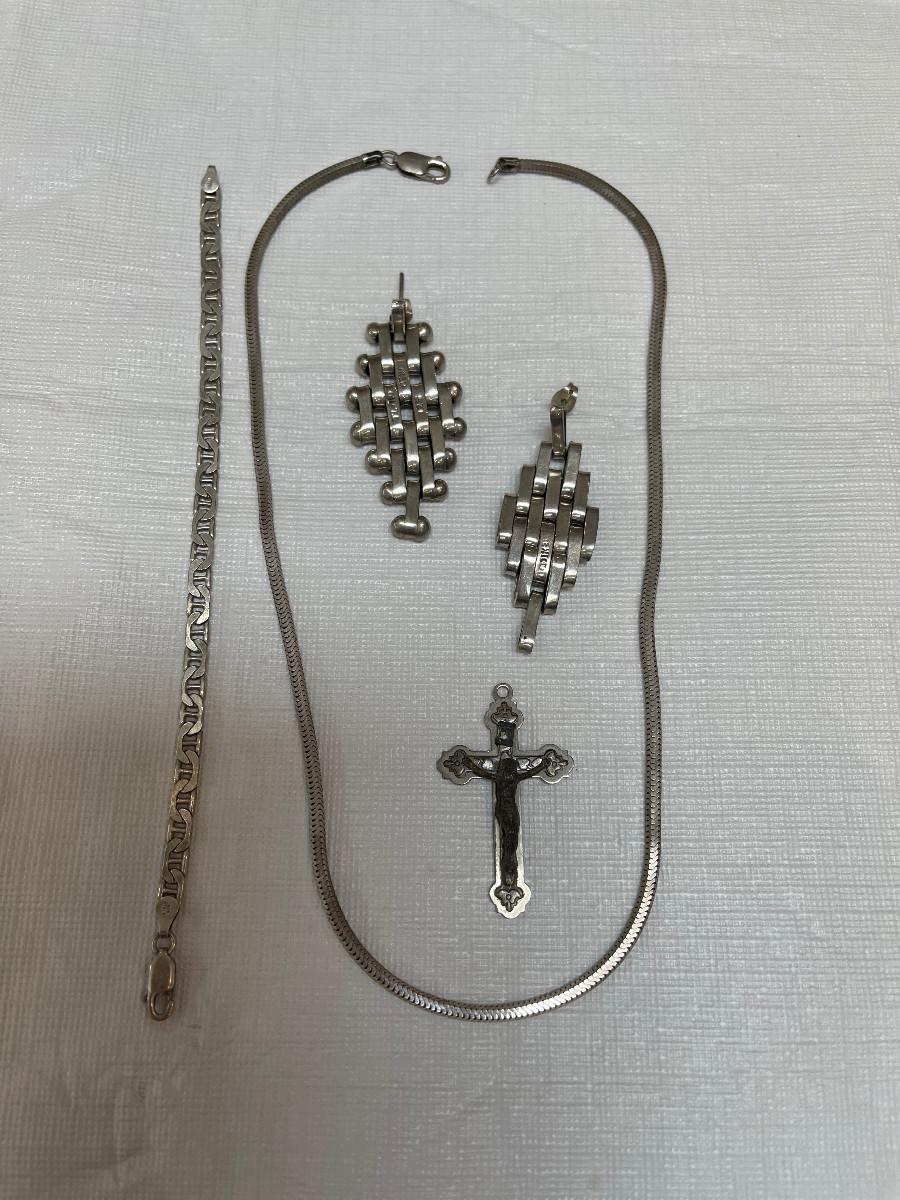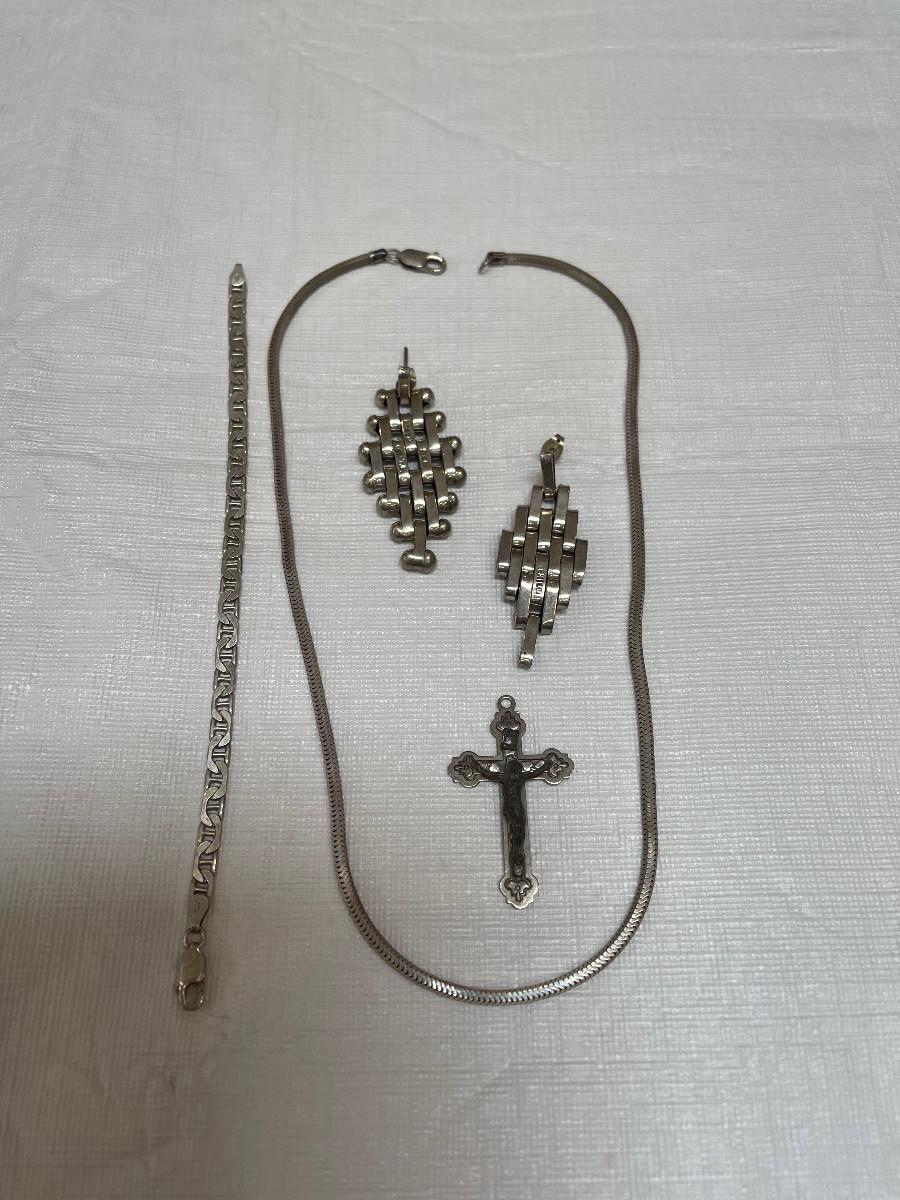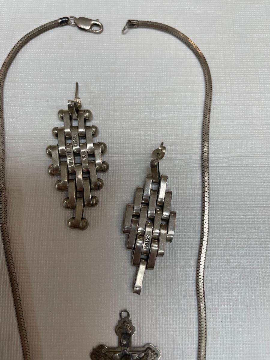 Sterling Silver Necklace 18", Earrings, Bracelet 7"and Silver Colored Cross