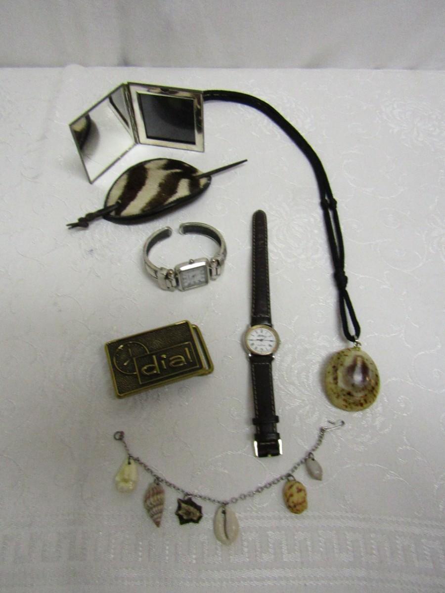 MIRROR & FRAME COMPACT, HAIR CLIP, 2 LADIES WATCHES BOTH NEED NEW BATTERIES, SEASHELL BRACELET AND NECKLACE