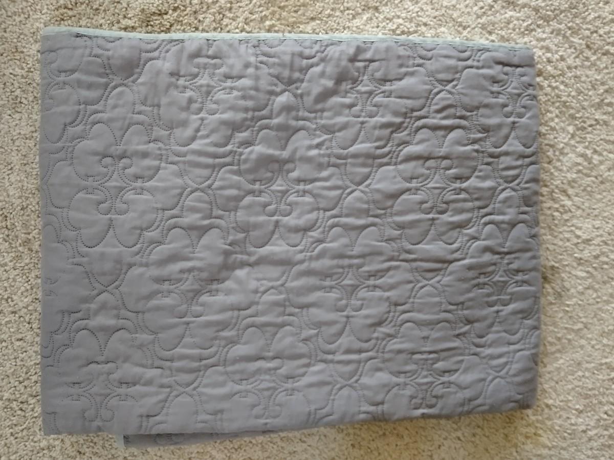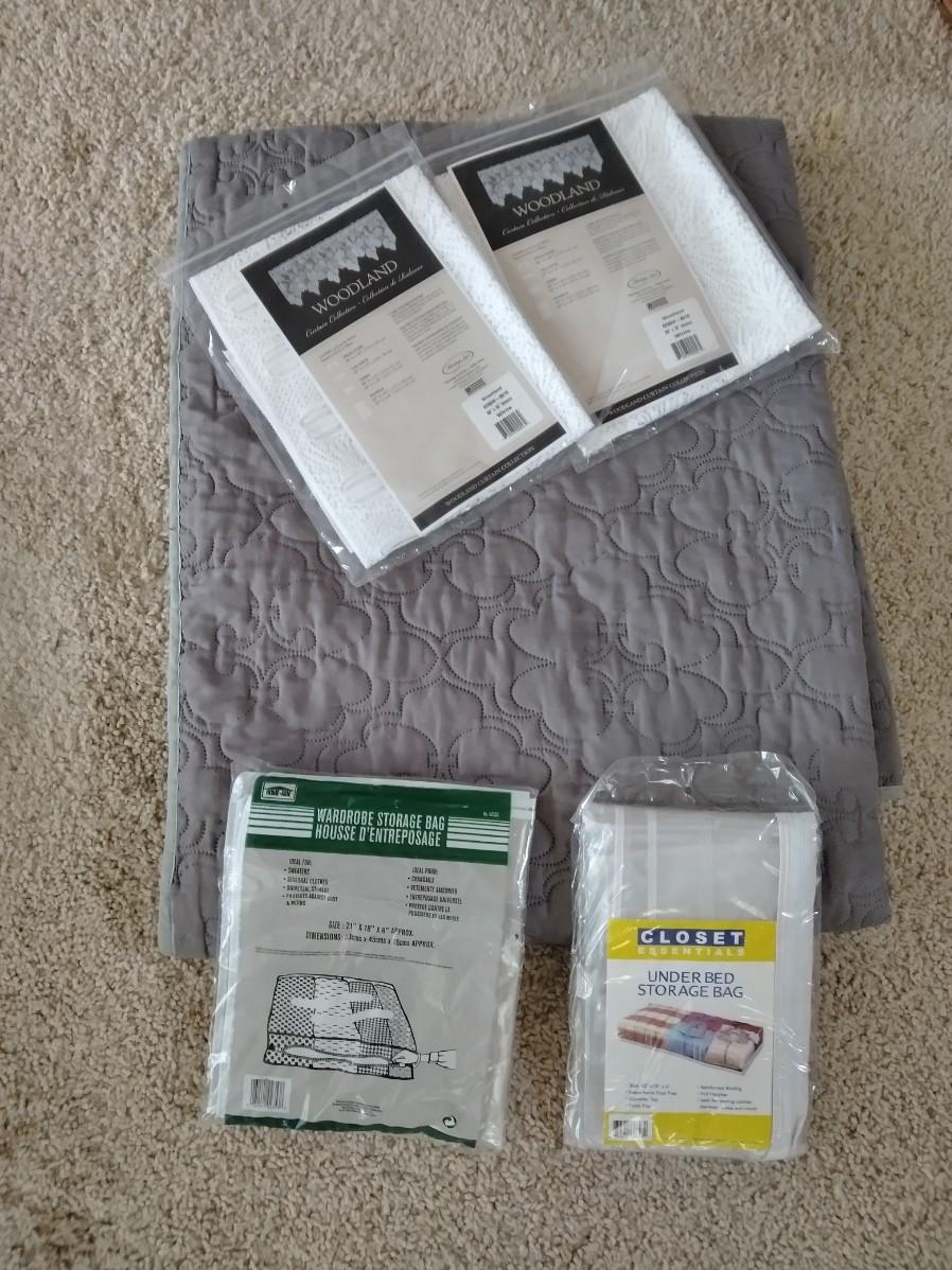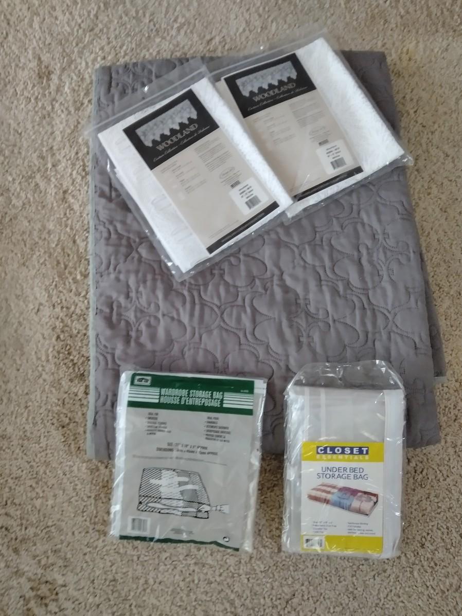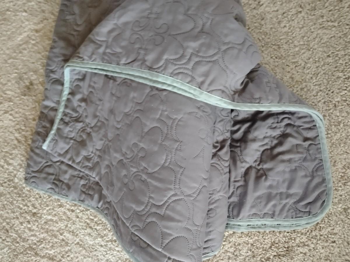 GREY AND MINT COLORED BLANKET, TWO WOODLANDS VALANCES, STORAGE BAG AND BLANKET STORAGE BAG