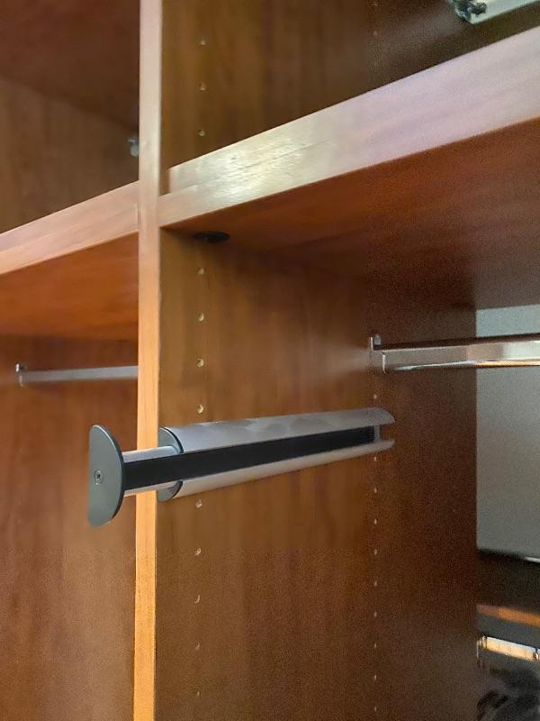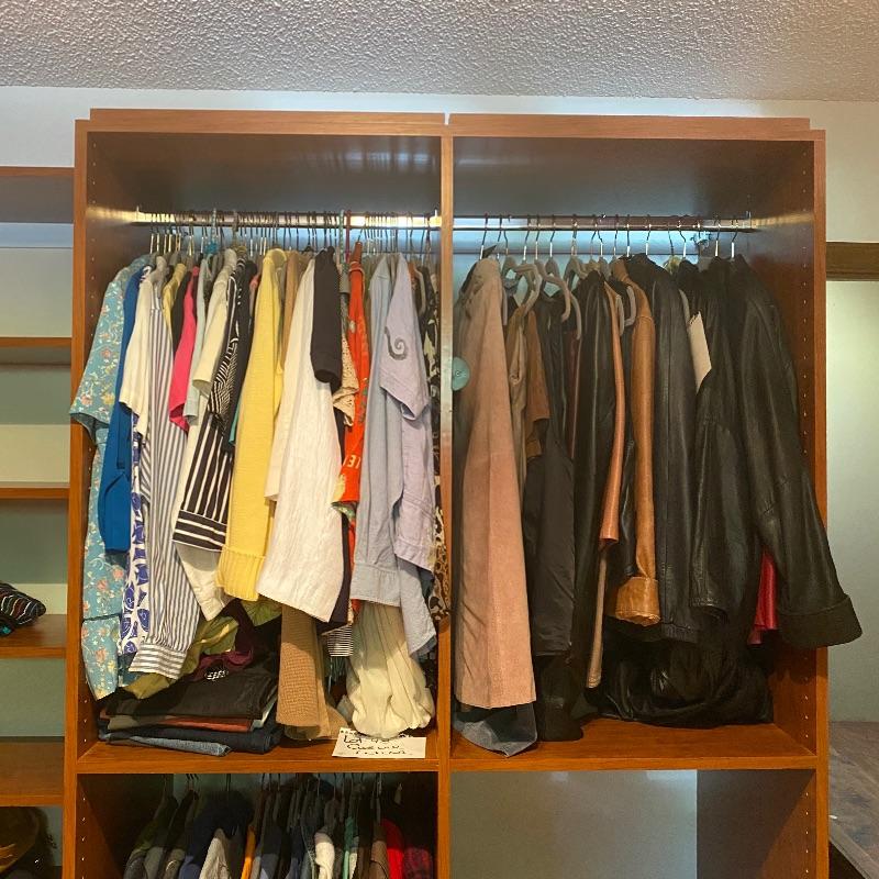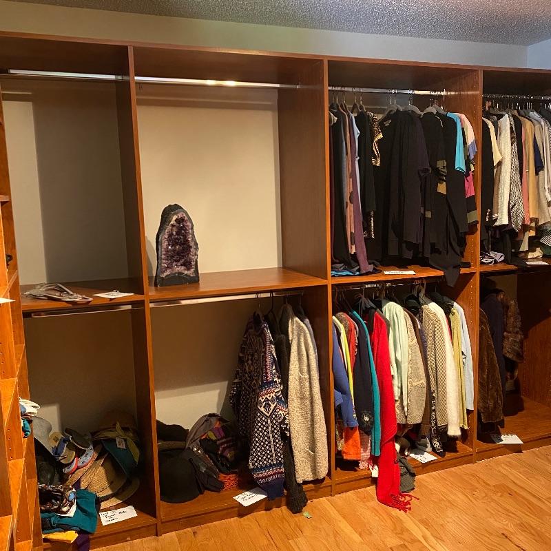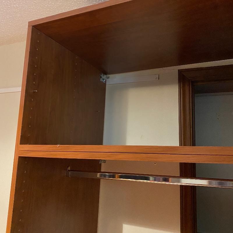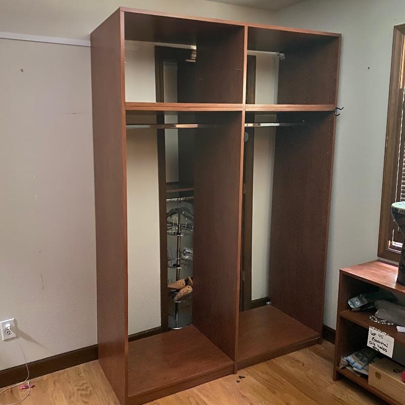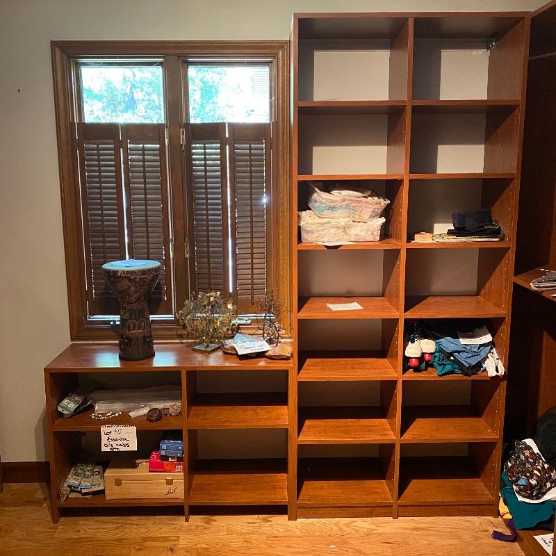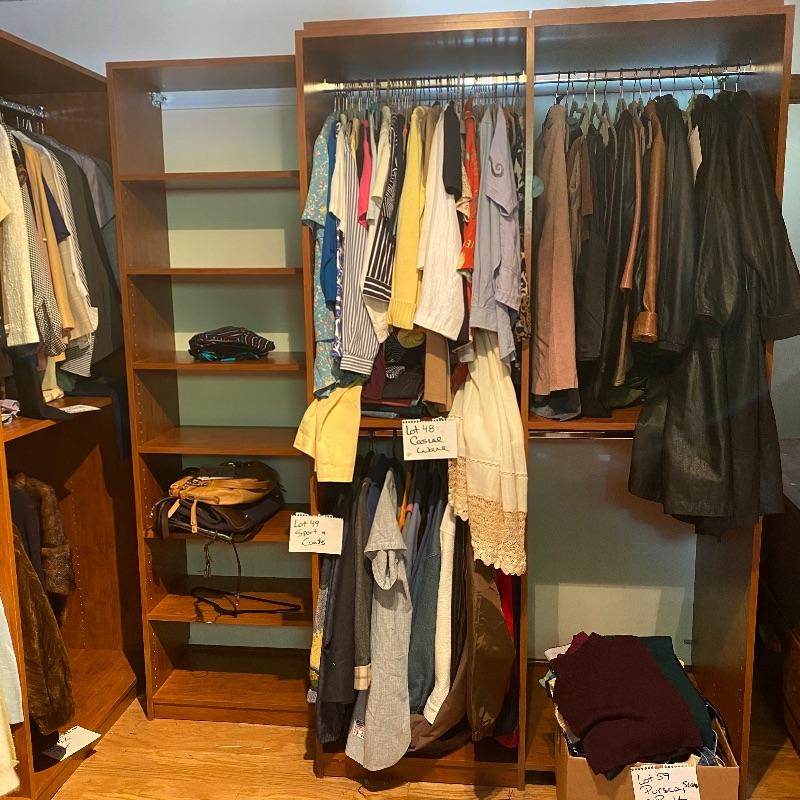 Here’s your chance to make the closet of your dreams as Mrs. Fraser did. She converted an extra bedroom into her closet! Be ready with tools to take this apart and rebuild at home. Use some of it or all of it to configure with your needs. As it is photographed , there are four sections. I’ve taken photos of the connections so you bring the right tools. All items in storage are not included in this lot, just the actual storage units that are mounted to the wall. Measurements are as follows. Tall shelving unit (36.5” x 14” x 85”) with smaller shelving unit (42” x 14” x 28.5”). Can make two units. In photo - One screw is attaching the two units and the other attaches to the wall. All shelves are adjustable. Next unit is hanging storage with a shelf above that measures 58.25” x 24” x 85”. There is an extra shelf and pegs on both top parts. Next piece is two hanging storage units attached to a shelving unit. The hanging storage is for shorter storage and has a shelf in middle. Hanging side measures 49” x 24” x 85”. Shelves measure 25.5” x 14” x 85”. Lastly is a long four compartment hanging storage piece that goes the length of the wall. It measures approximately 137” long by 24” deep by 85” tall. These pieces will need to be fully dismantled as they are not sturdy free standing. Best bet is to come to preview and check it out in person! No shipping.