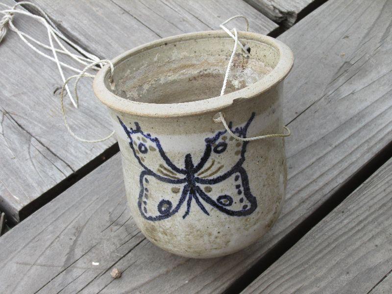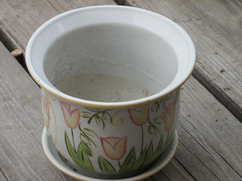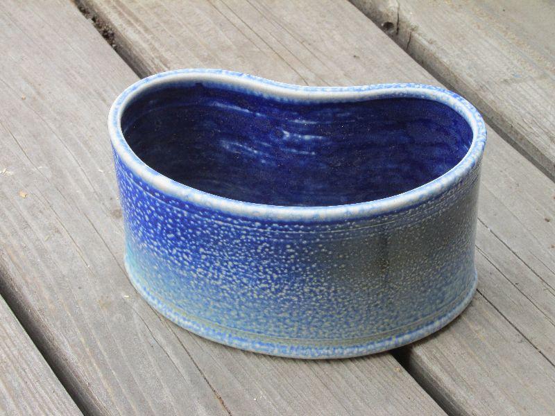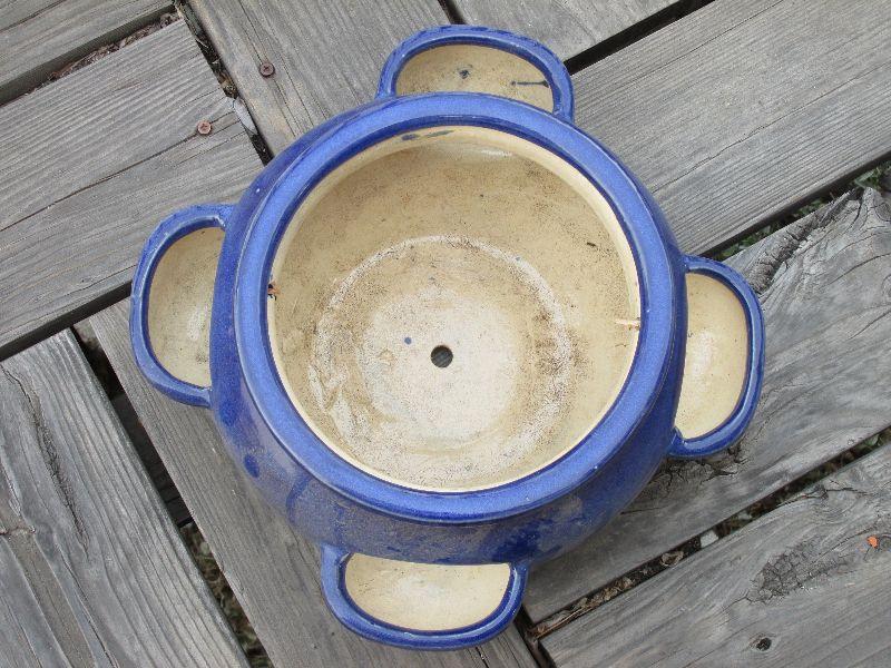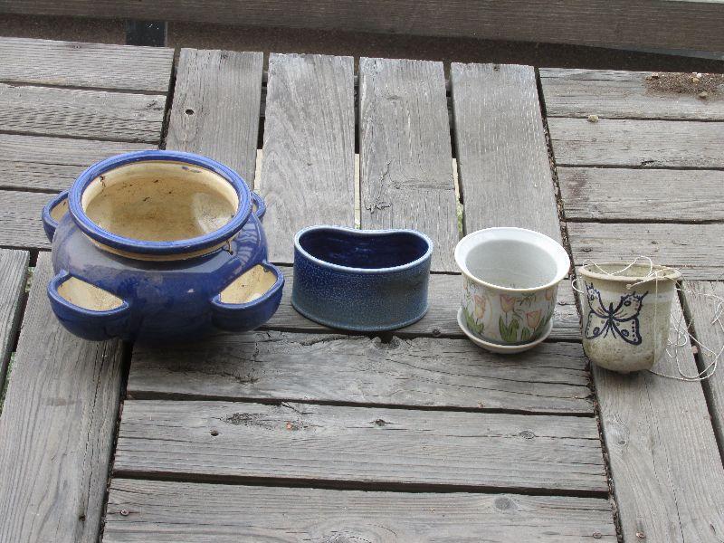 Set of four ceramic pots. One very nice multi area blue pot. All pots have been used.