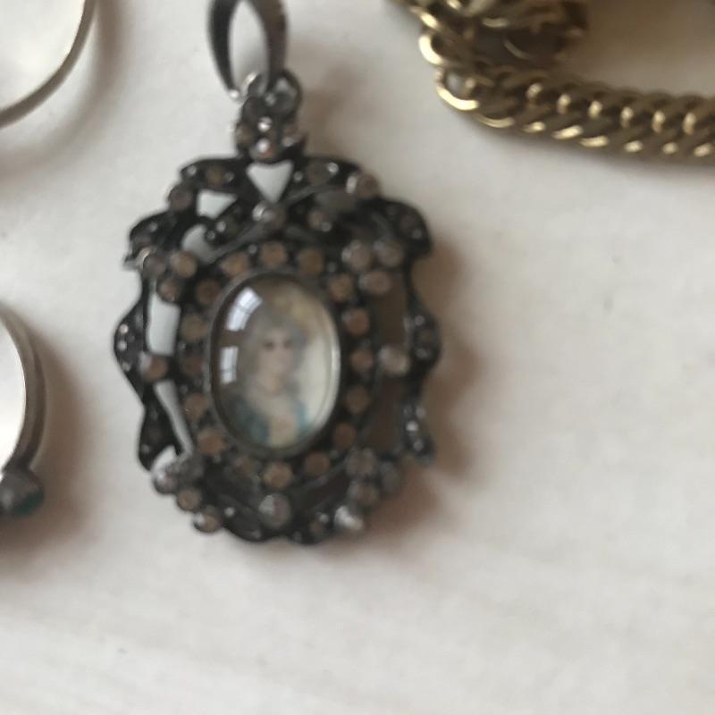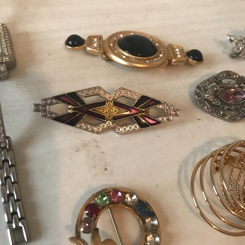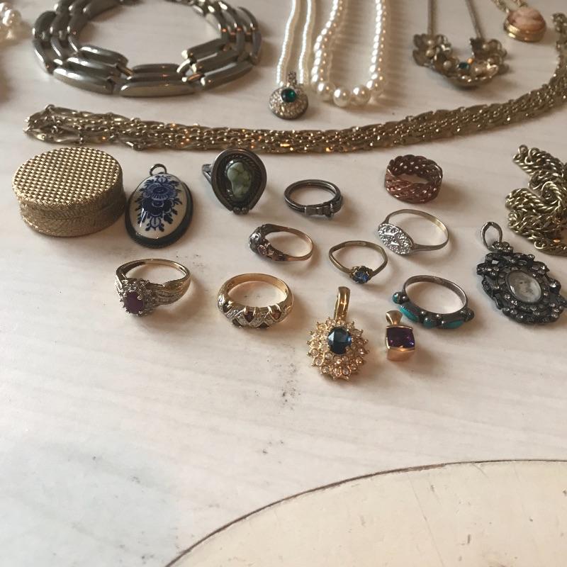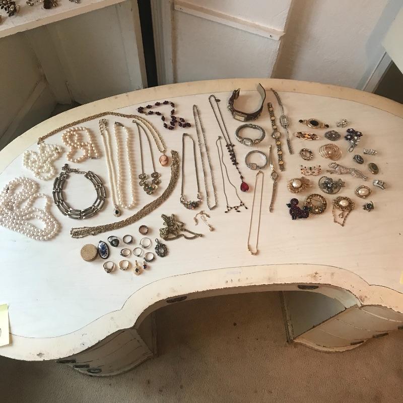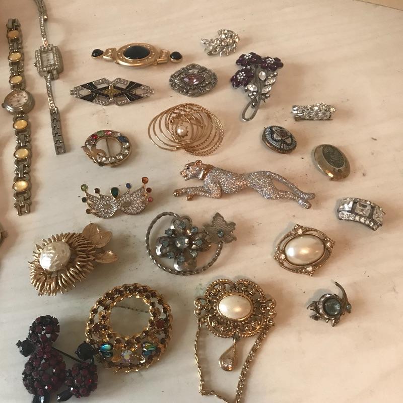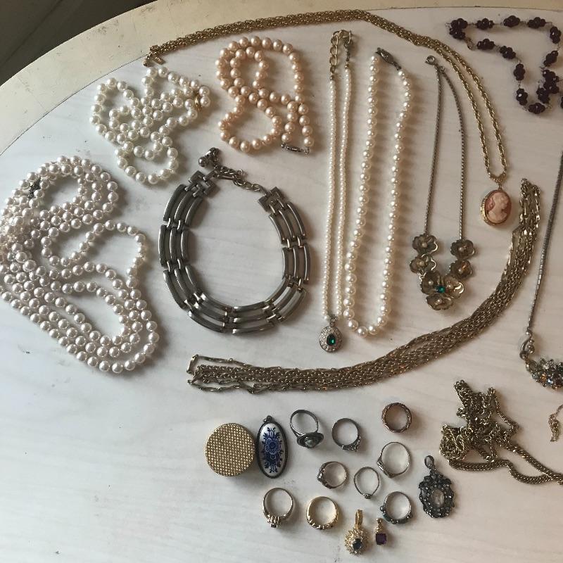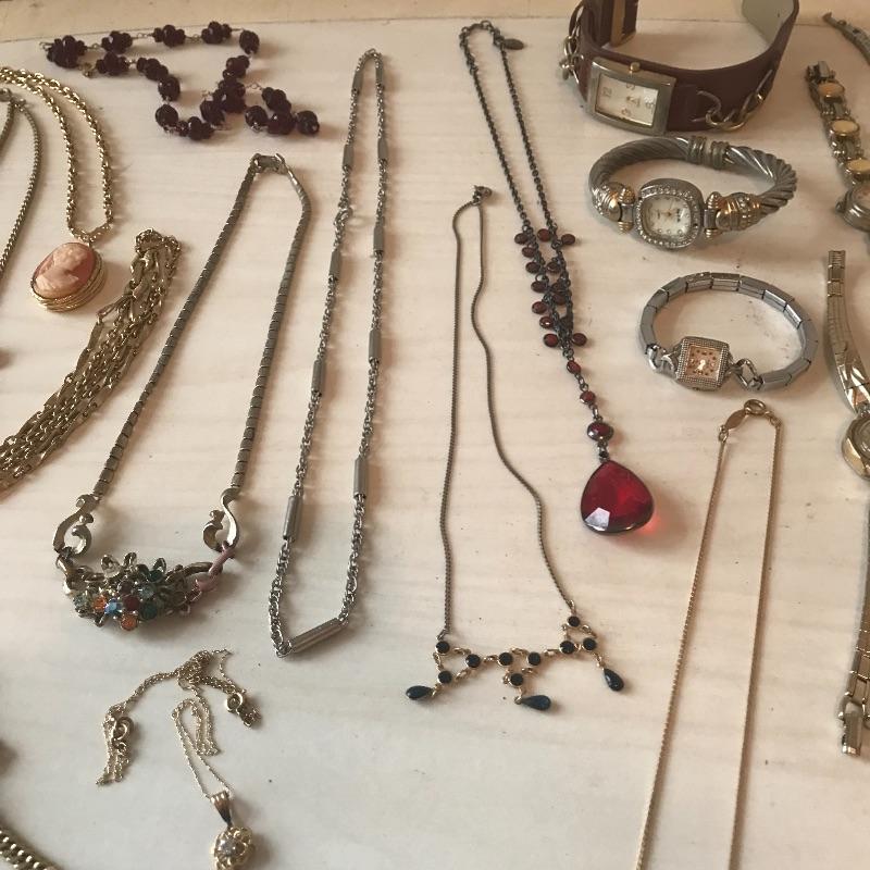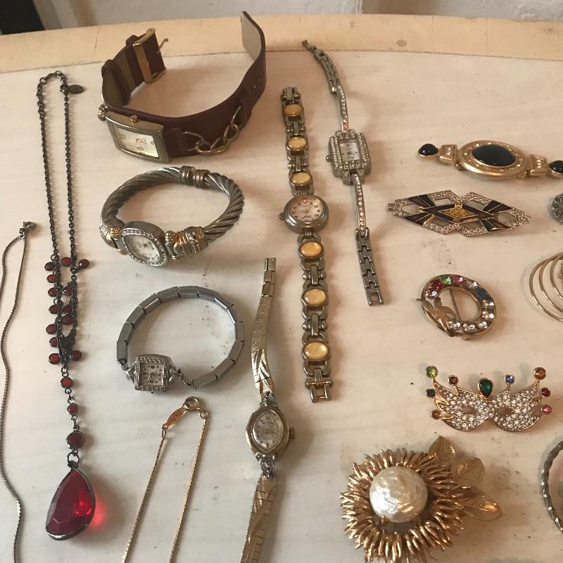 Necklaces, rings, pins, watches and pendants make up this eclectic lot of jewelry. All but one watch are quartz watches, five strands of pearls, eight rings of varying sizes, four pendants, twenty pins, twelve necklaces with one thin gold colored one being a bit knotted up. Shipping available.