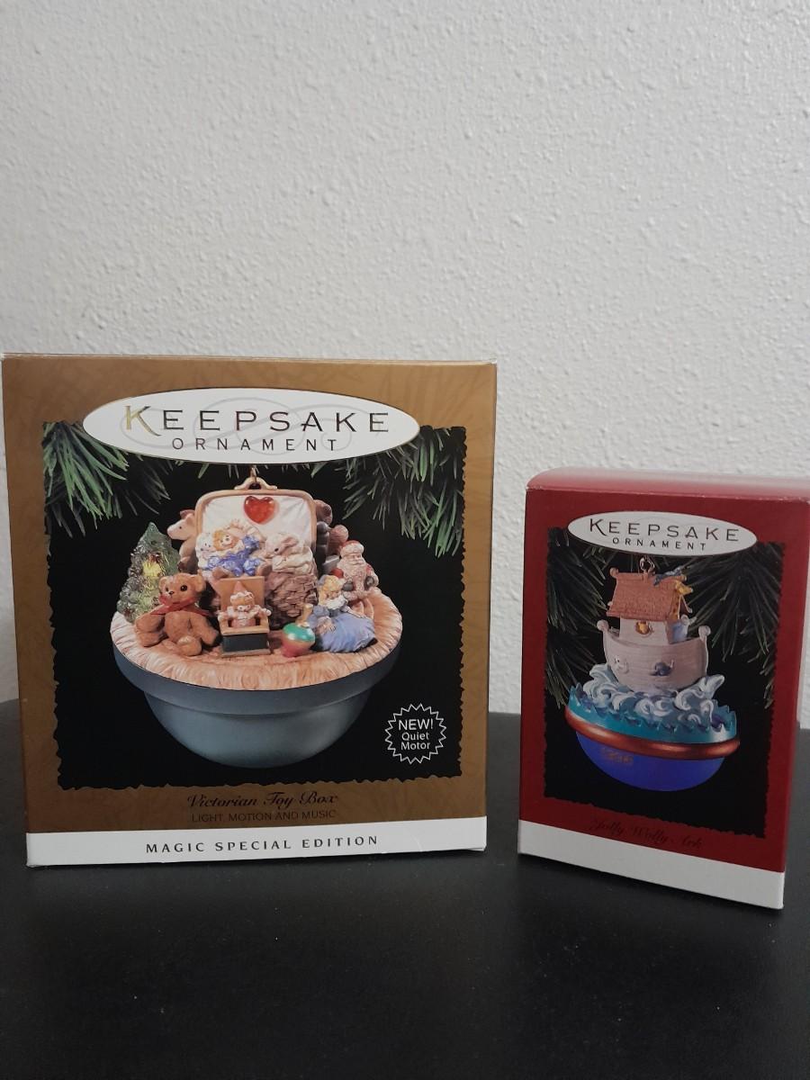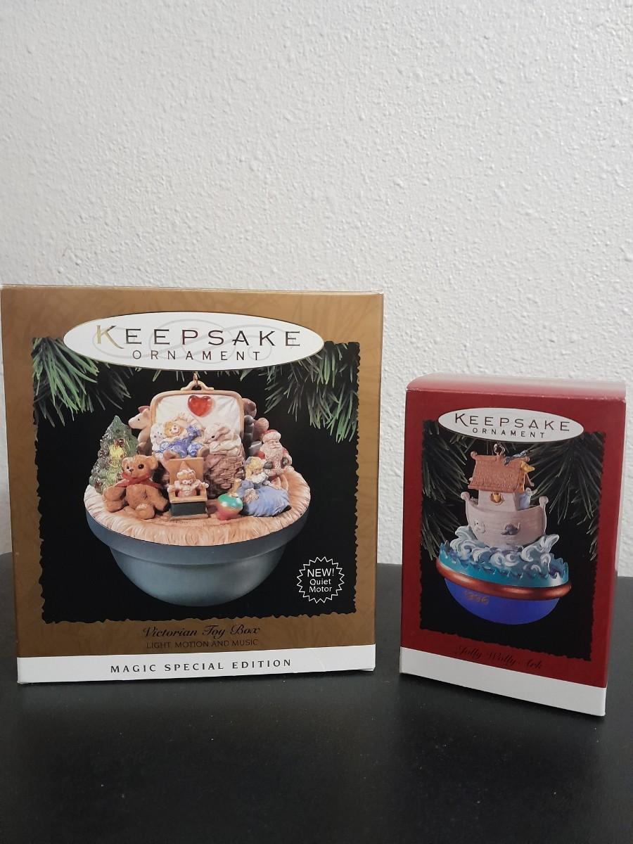 HALLMARK CHRISTMAS ORNAMENTS ANIMATED TOY BOX & JOLLY WOLLY ARK