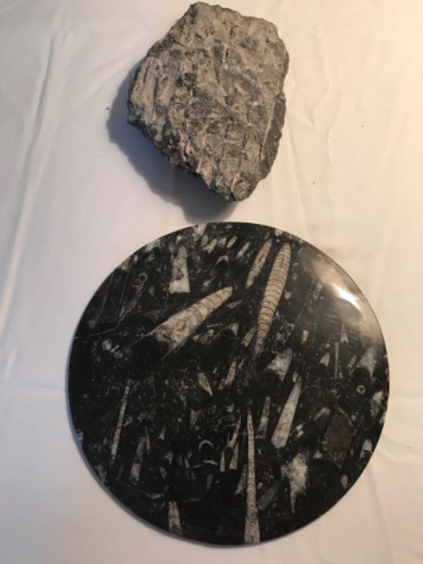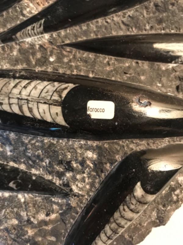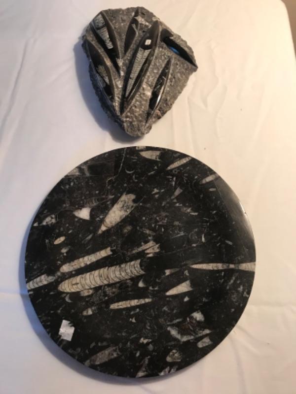 Sculpture is made of stone and polished stone and includes a matching polished stone charger. Sculpture measures 10-1/2” long 7” wide and 1” thick and has a sticker that says Morocco. Charger measures 11-3/4”