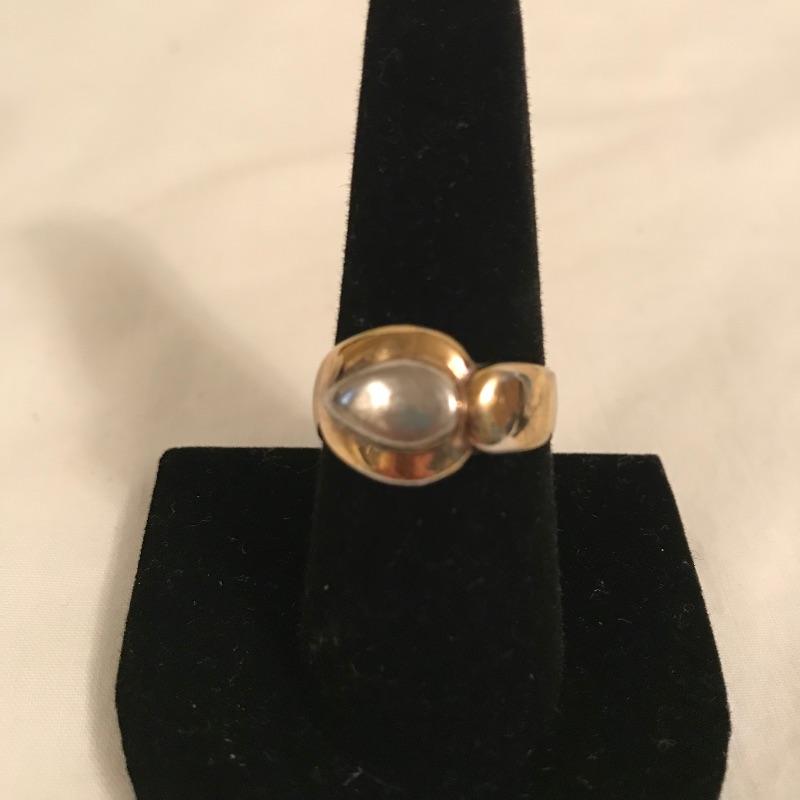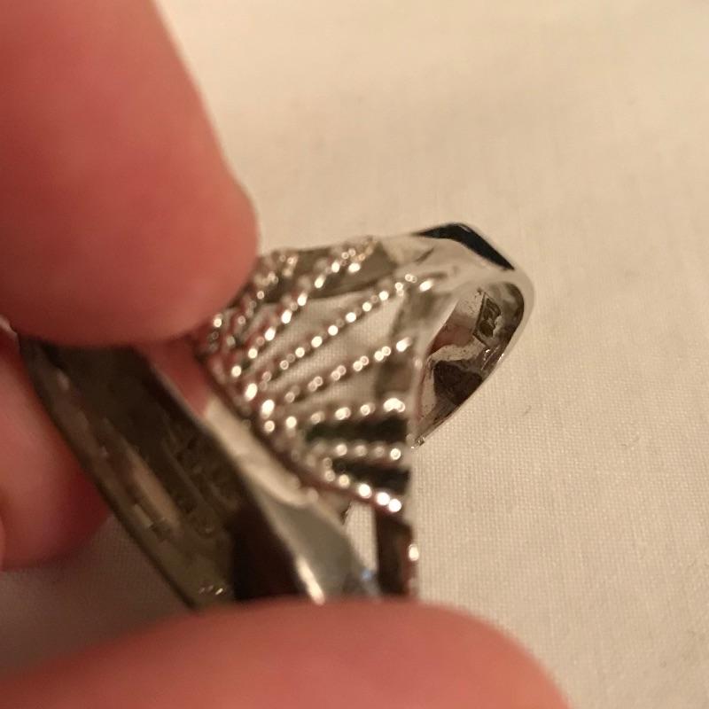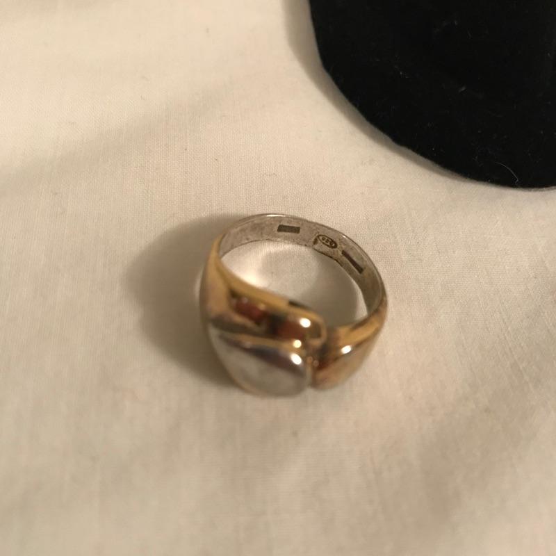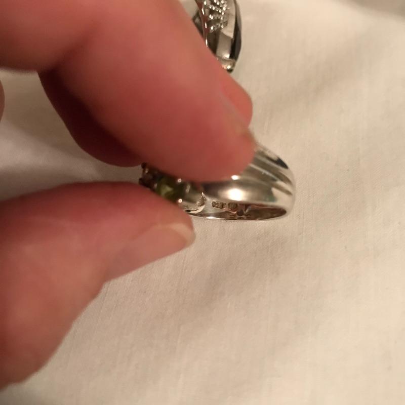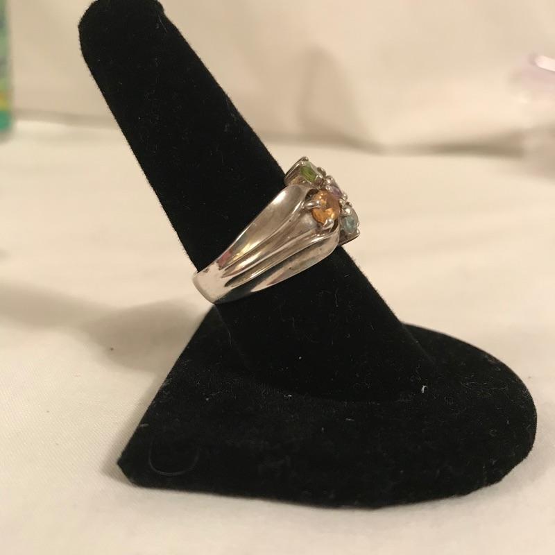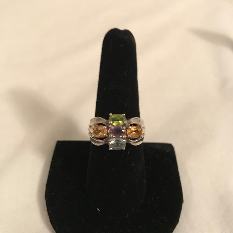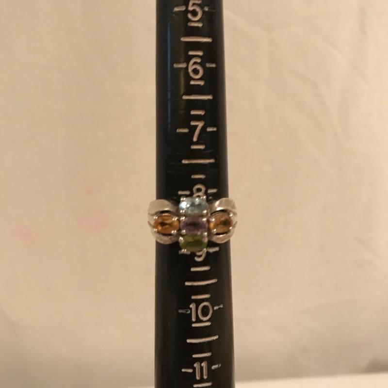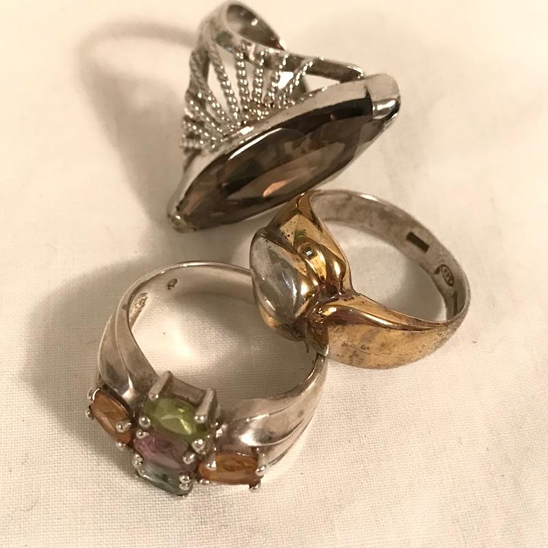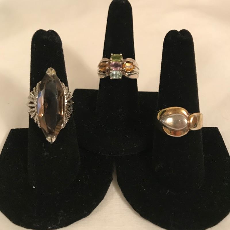 Three lovely rings all marked 925. Some have more markings, although specifics are undetermined at this point. Two rings possess a bright silver finish and colorful jewels and the third ring is a gold-silver color duo. Sizes shown in photos. Shipping available.