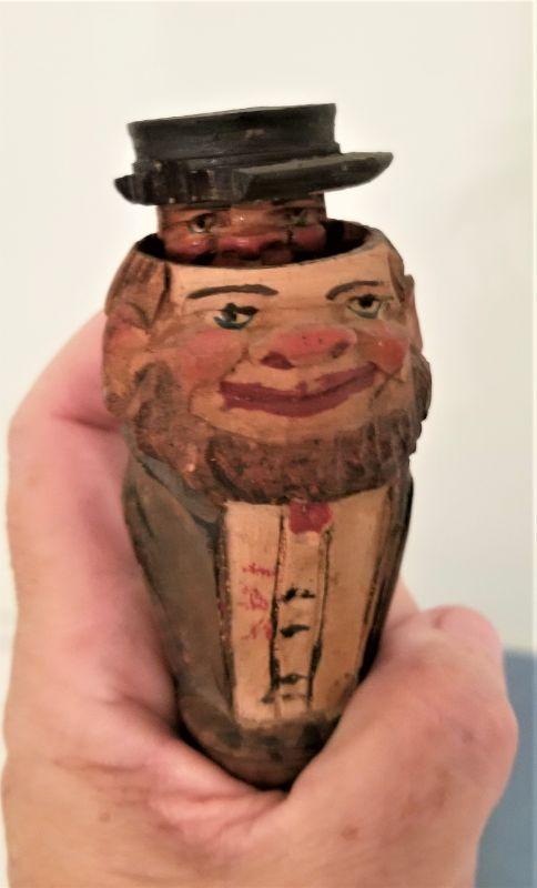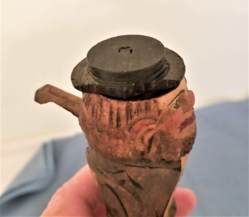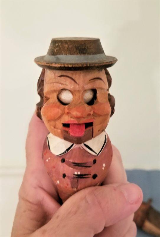 Lot of 2 vintage mechanical carved Black Forest (Germany) wine stoppers. Each is about 5" tall. Press the lever on the back and eyes roll back and tongue sticks out. On the other, press the lever and another head appears out of the top of his hat. Notice there is some damage to the hat on that one.