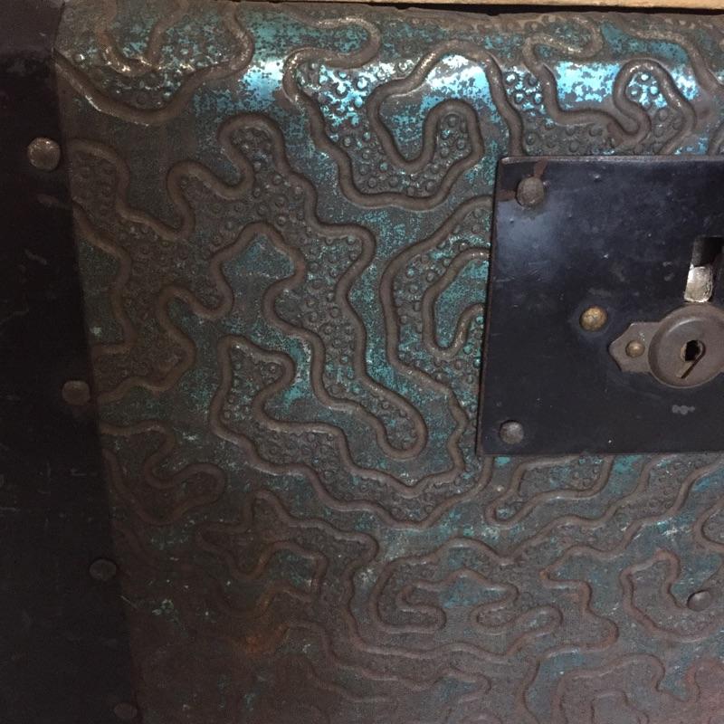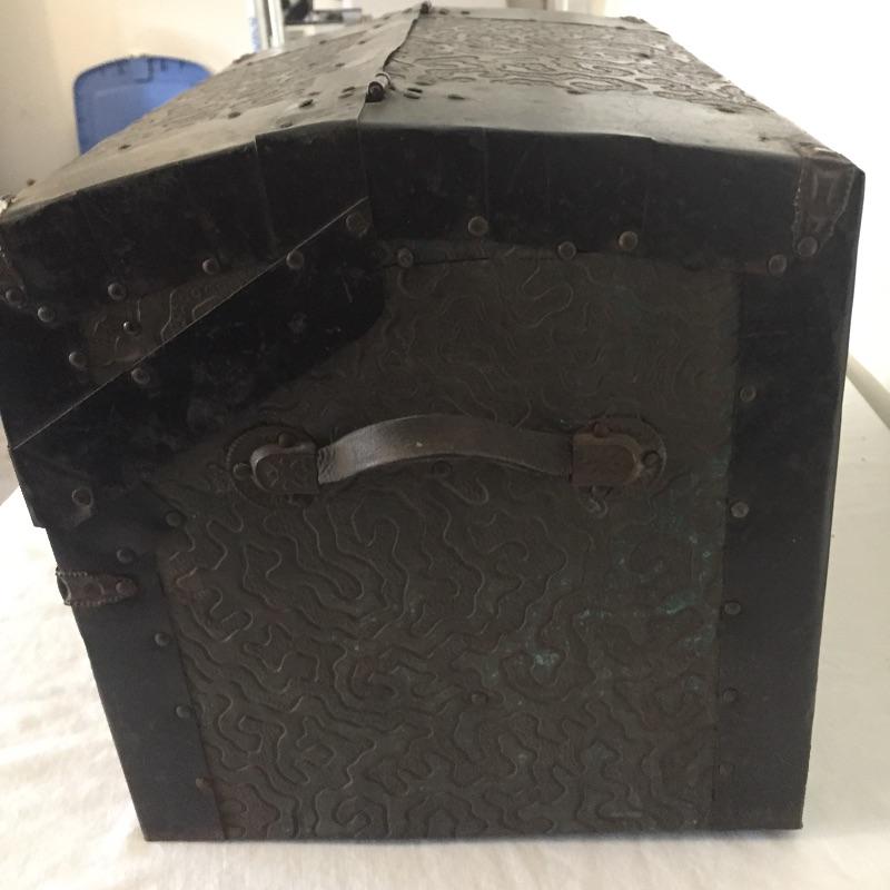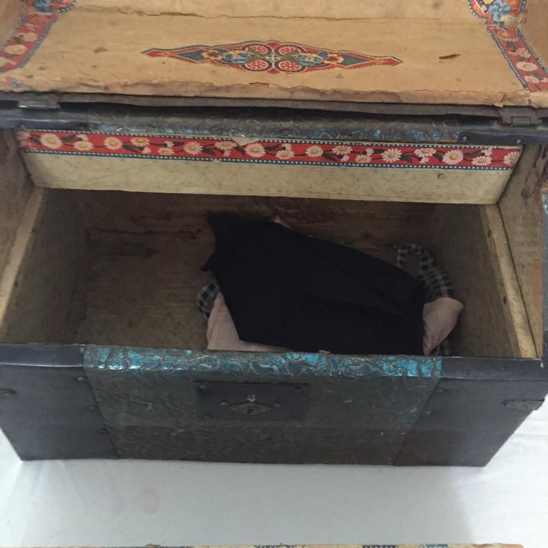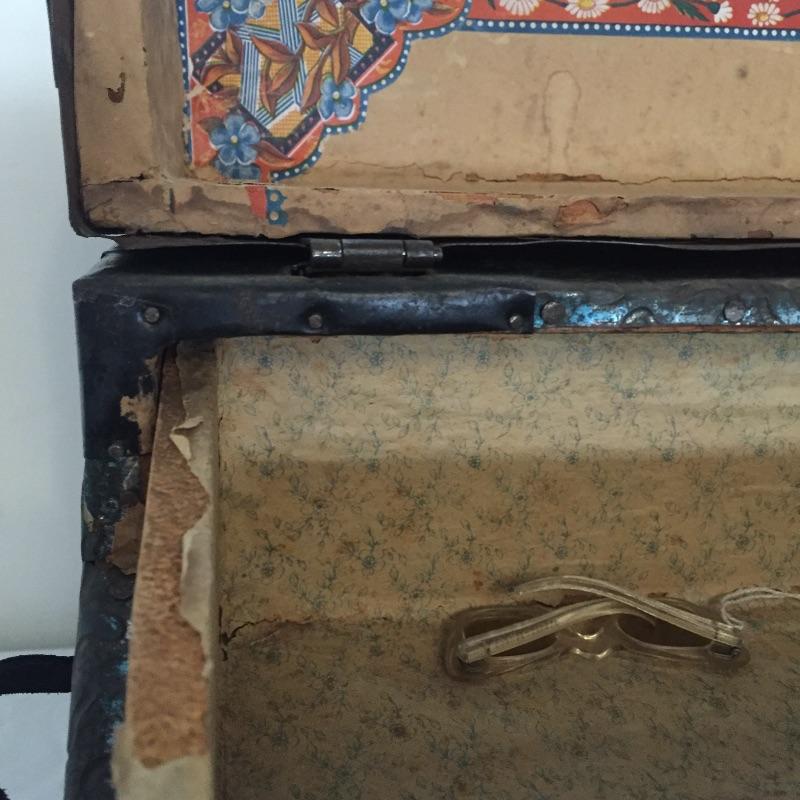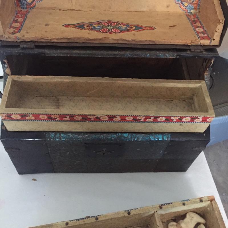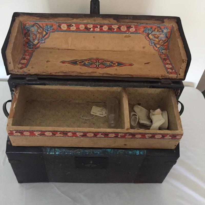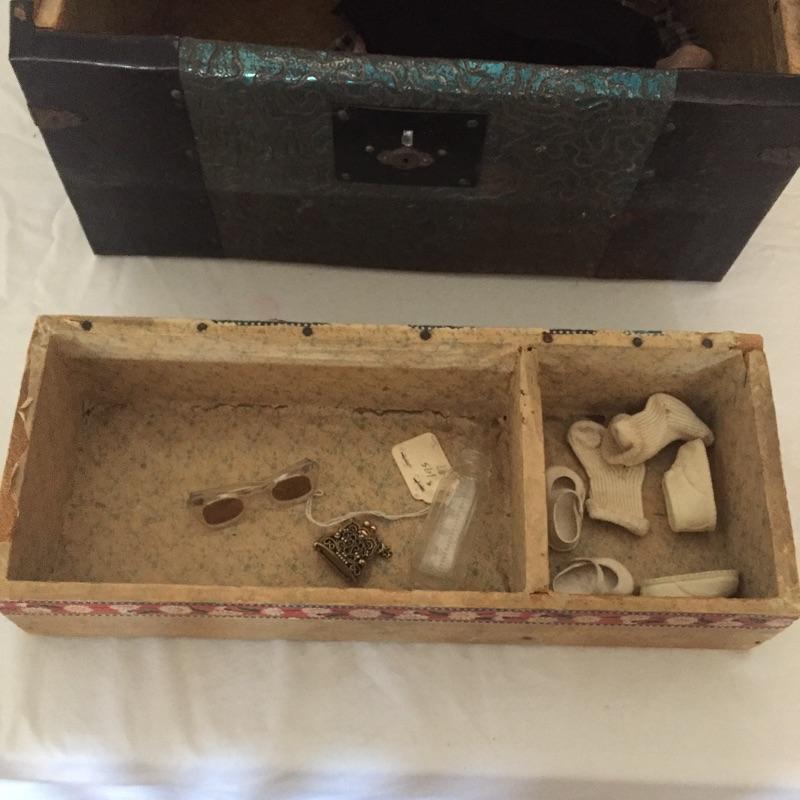 Enchanting vintage doll trunk. Trunk has two trays on top and storage underneath. Great craftsmanship on this trunk - see pictures. Also includes contents. Great gift for the collector or your kids. Trunk measures 10.5” x 16.25” x 11.5”.
