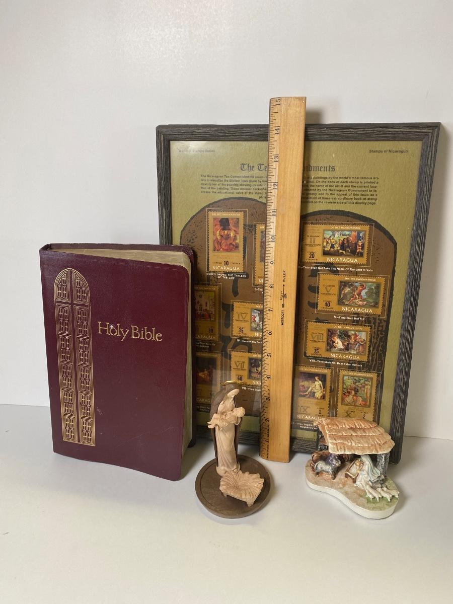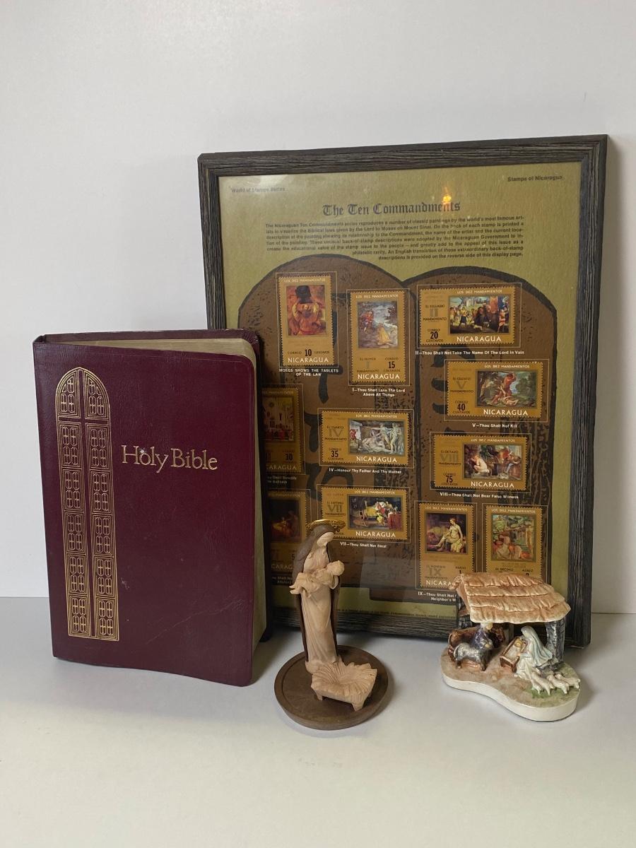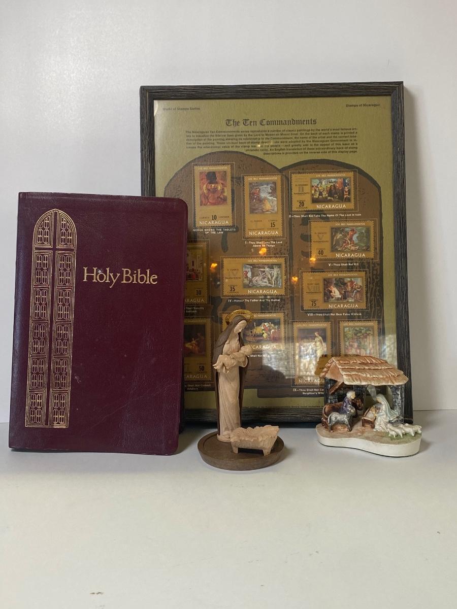 Framed Nicaraguan Ten Commandments Stamps, used King James bible, a statue of Mary holding Jesus and a statue of the nativity scene.