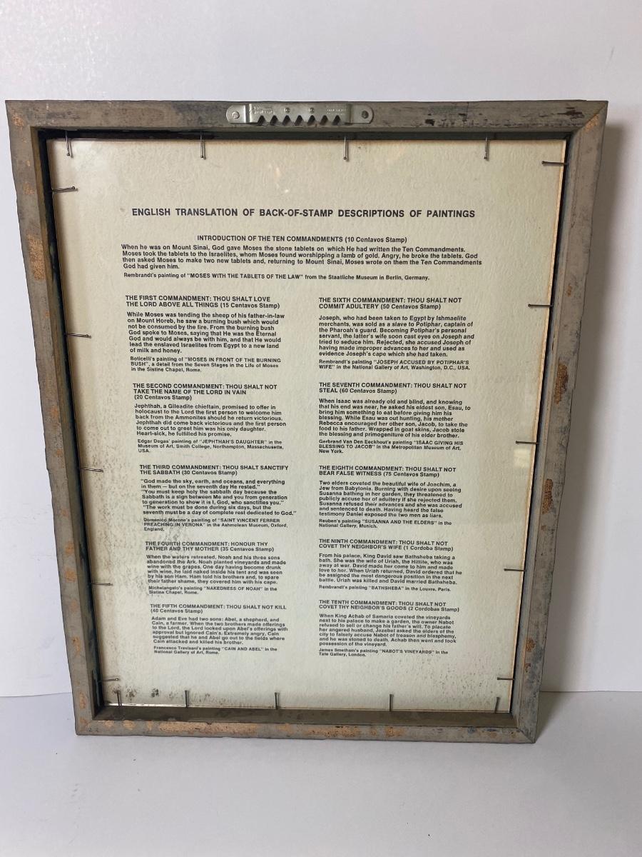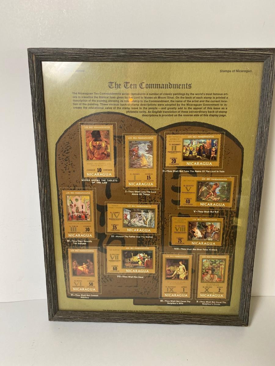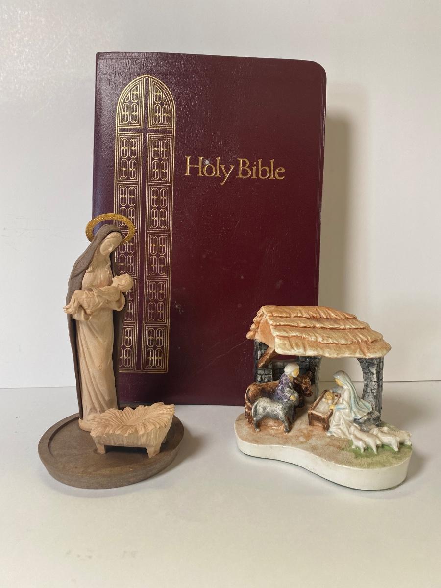 Framed Nicaraguan Ten Commandments Stamps, used King James bible, a statue of Mary holding Jesus and a statue of the nativity scene.