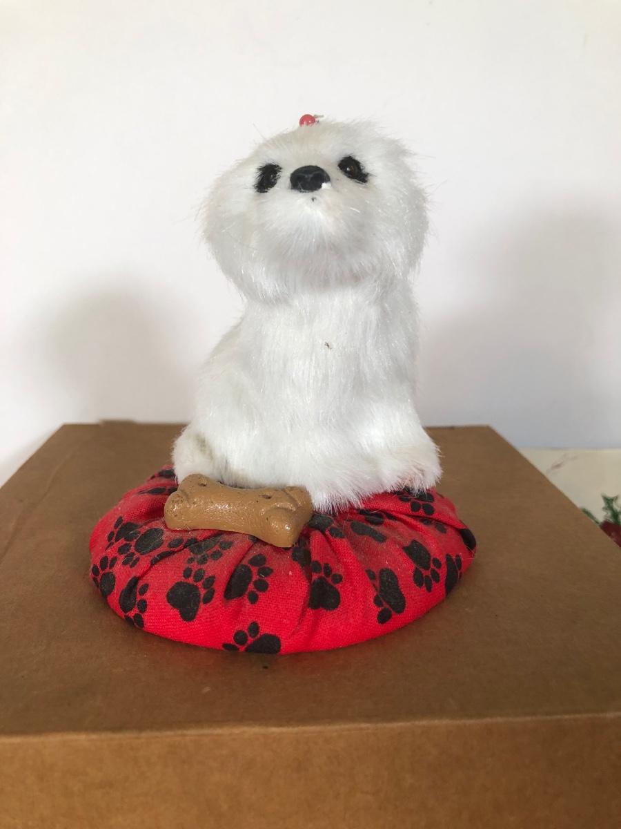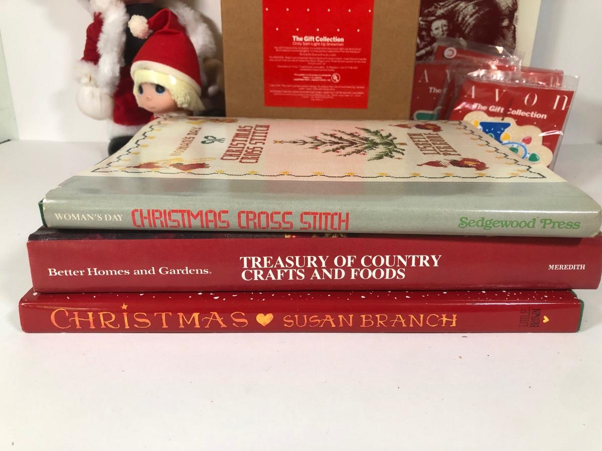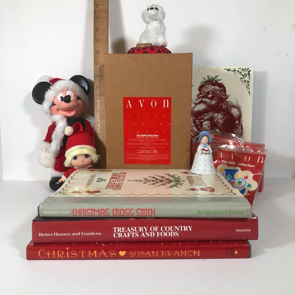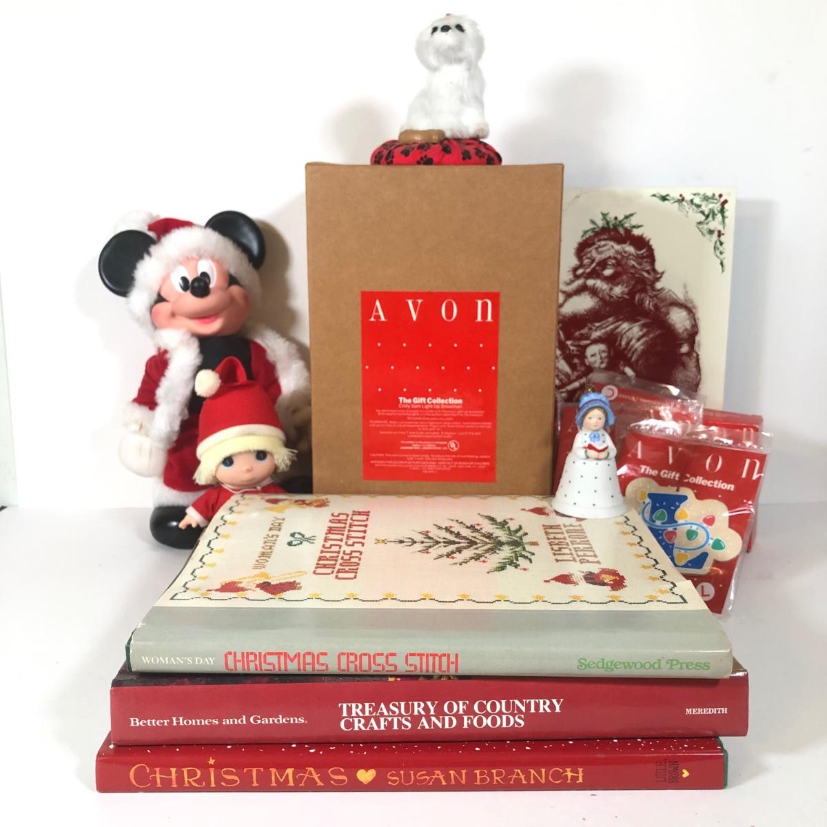 LOT 262L: Kiddie Christmas Collection - Avon Light Up Snowman in Box, Byer's Choice White Dog, Santa Mickey Mouse, Avon Ornaments, Books, Hollie Hobbie Ornament & More