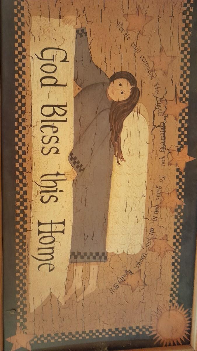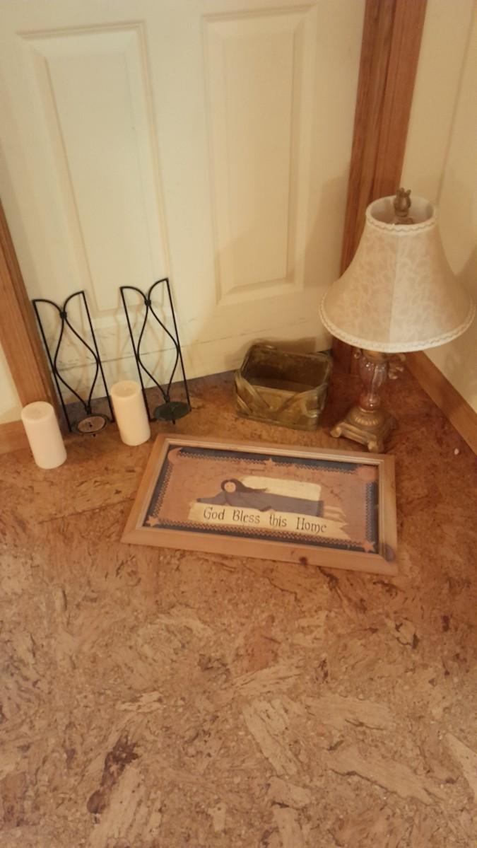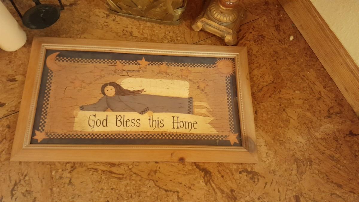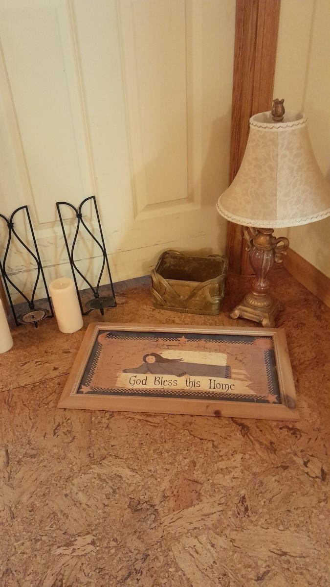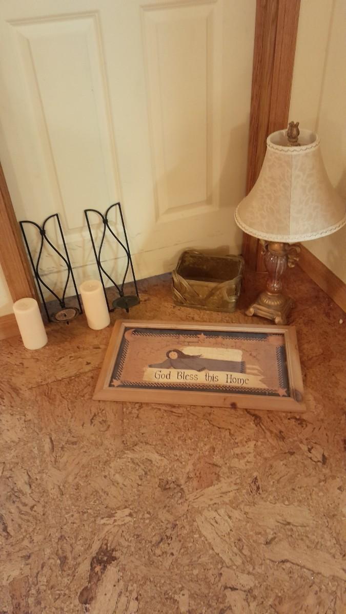 BEAUTIFUL CERAMIC LAMP, WITH SHADE, CANDLE SCONCES, GOD BLESS THIS HOME FRAMED PICTURE, AND A GOLD COLORED BASKET.