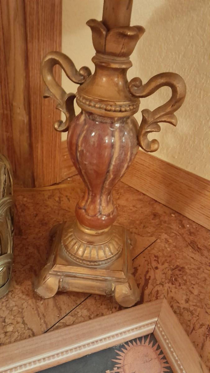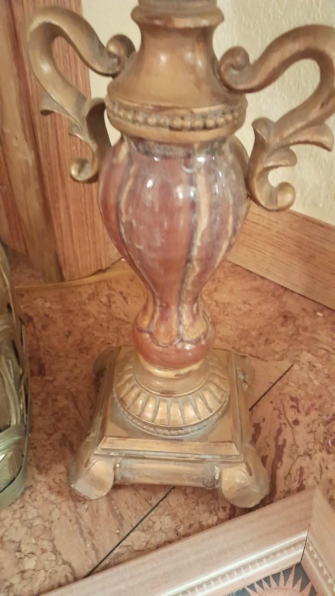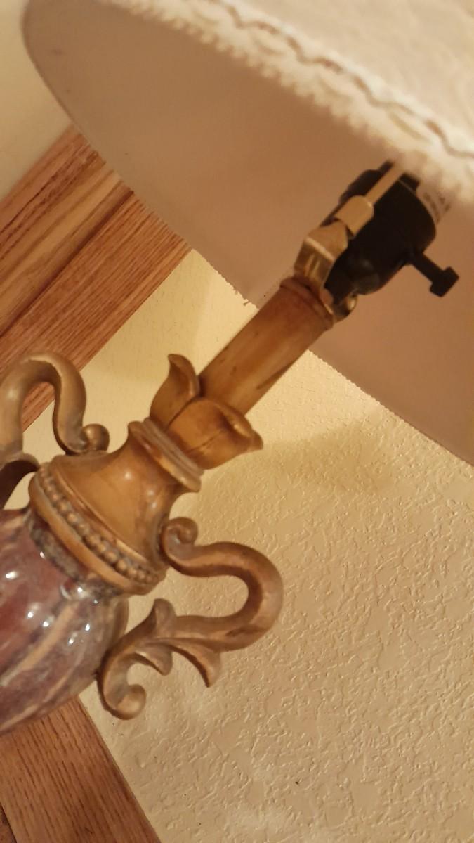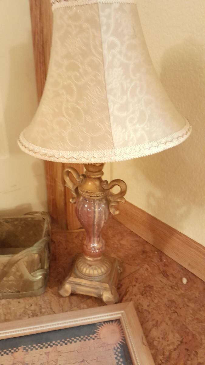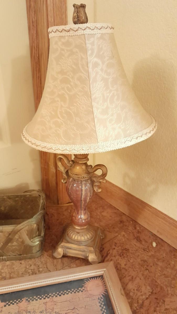 BEAUTIFUL CERAMIC LAMP, WITH SHADE, CANDLE SCONCES, GOD BLESS THIS HOME FRAMED PICTURE, AND A GOLD COLORED BASKET.