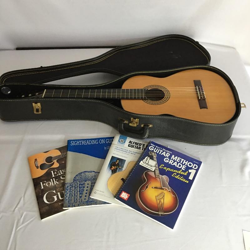 Carlos Acoustic guitar model #228 and case with Snark tuner and four books on guitars. Get in the groove with your own guitar. Guitar measures 14.5” x 39” x 4”.