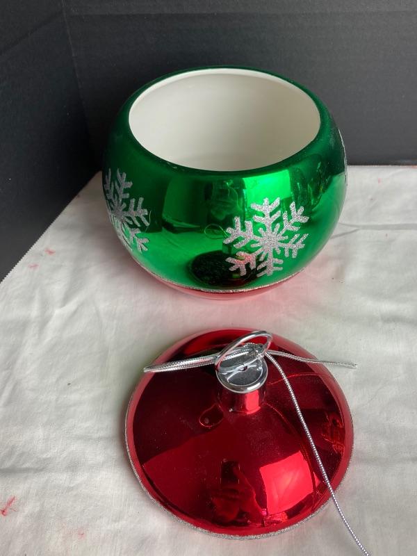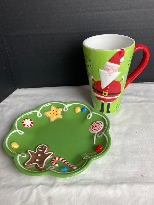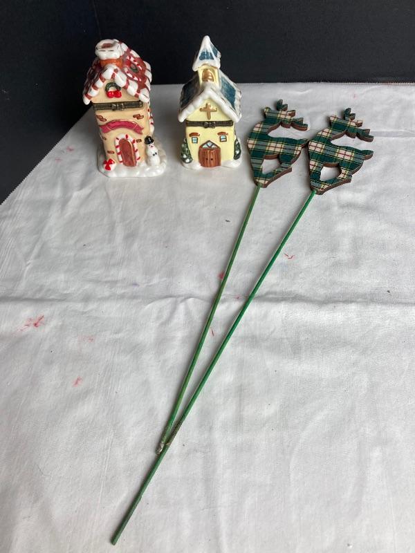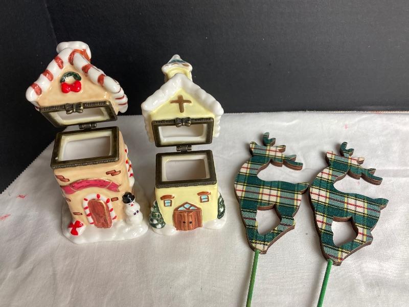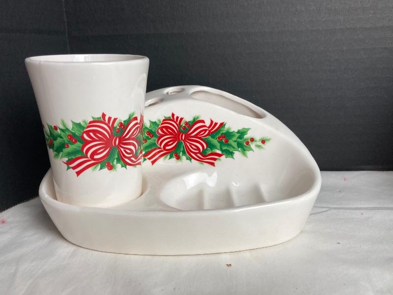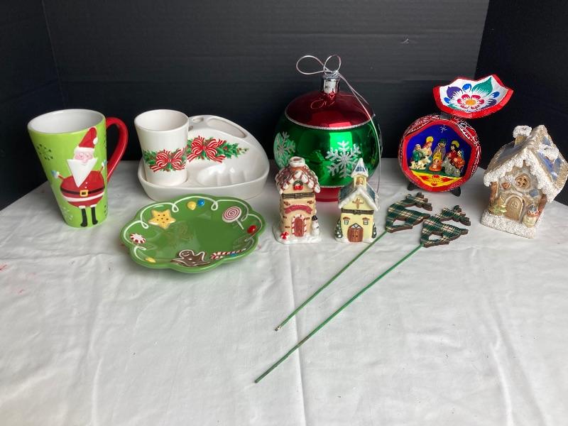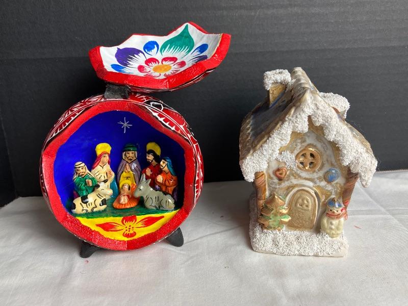 Two piece ceramic bathroom set, Ornament treat jar, two surprise boxes, plaid reindeer, Wooden carved nativity scene, tea light candle holder and small plate with mug