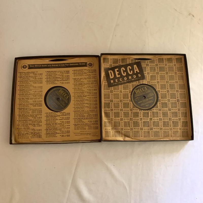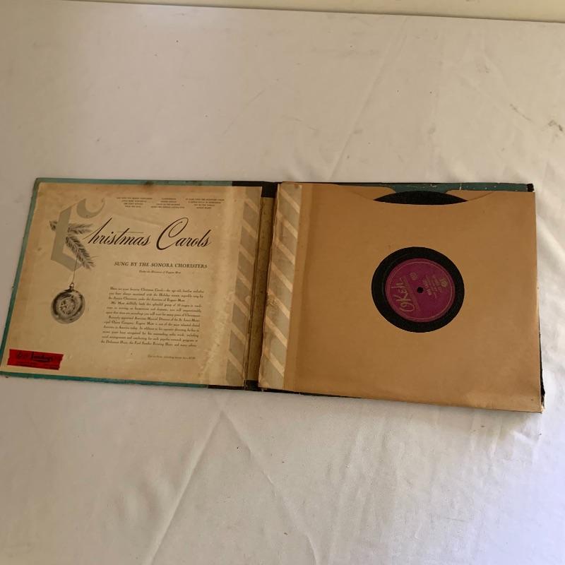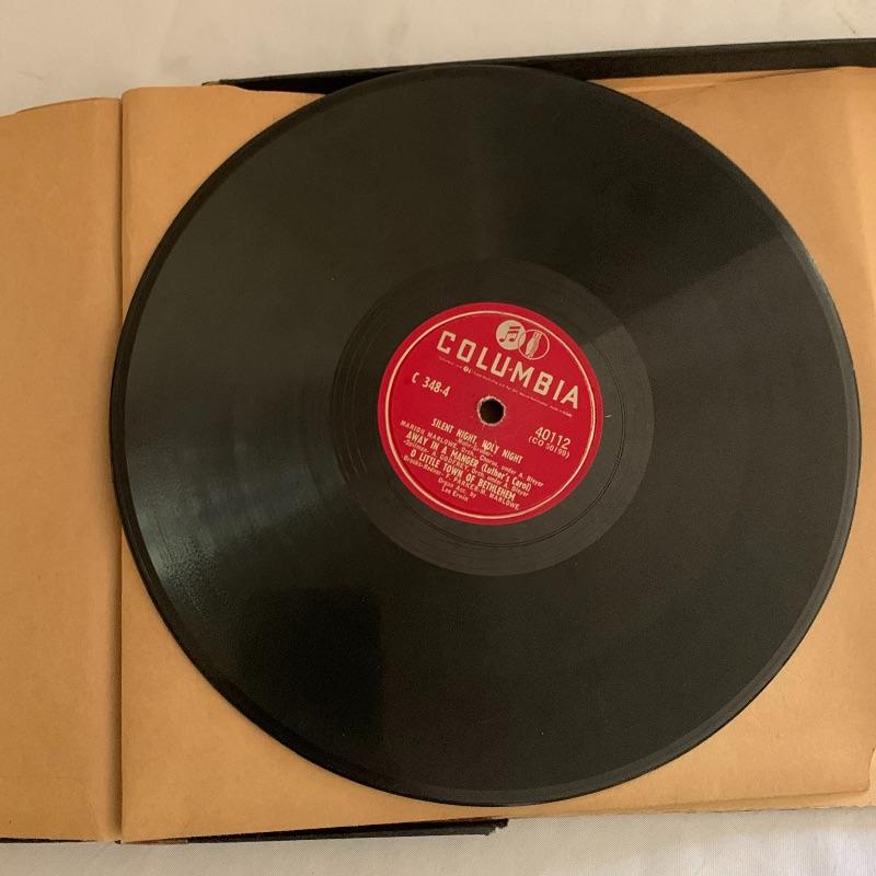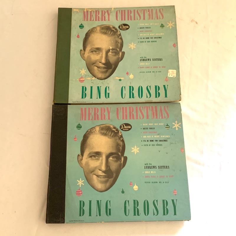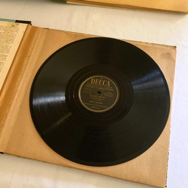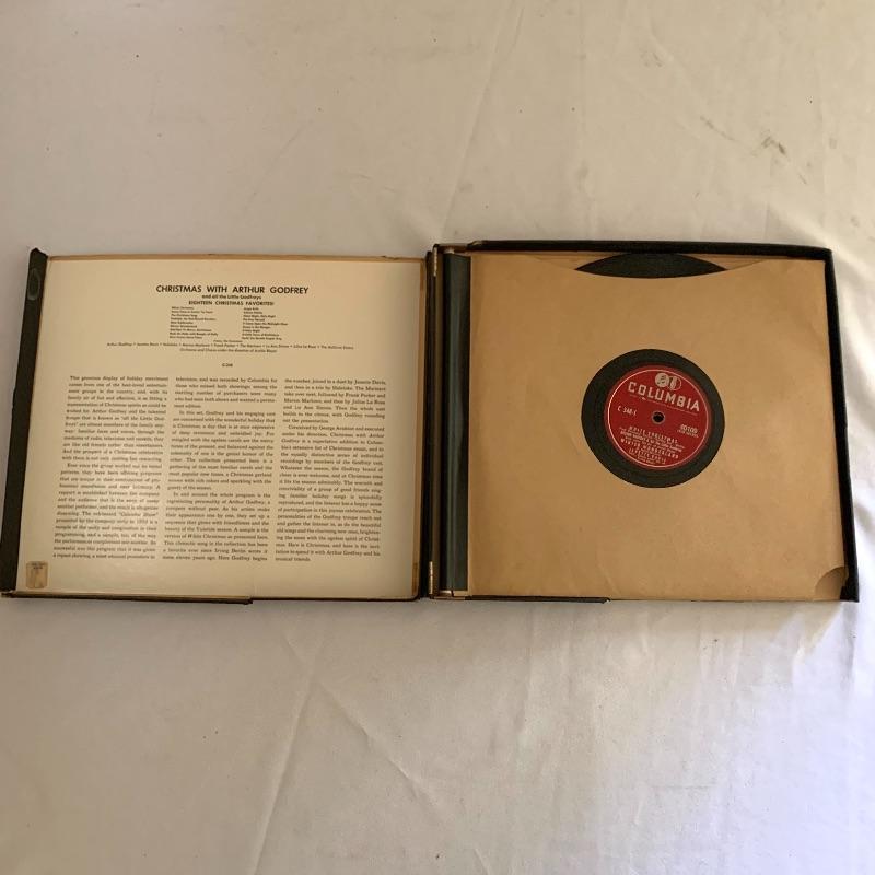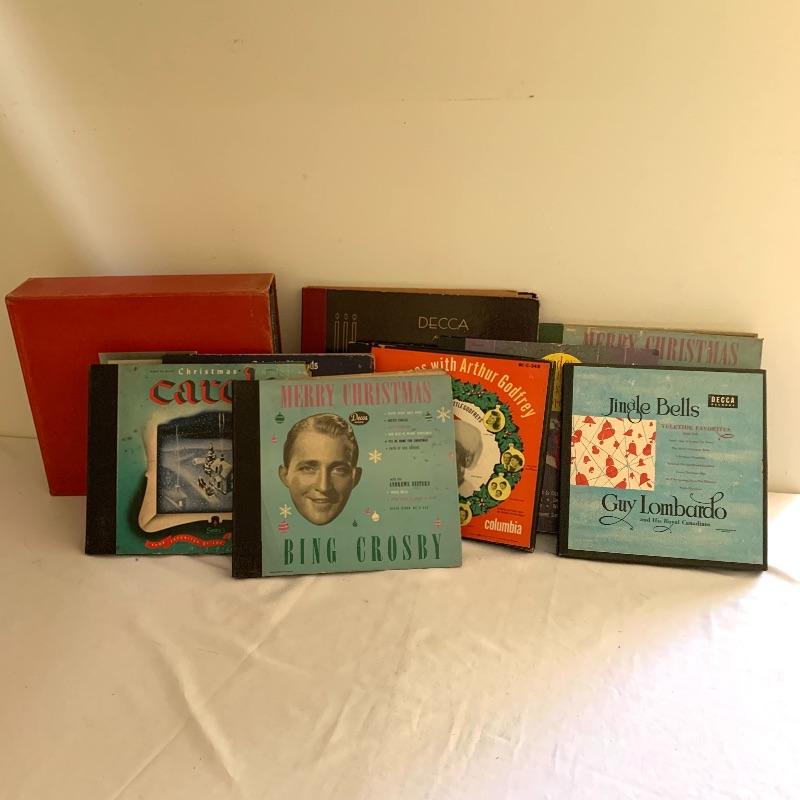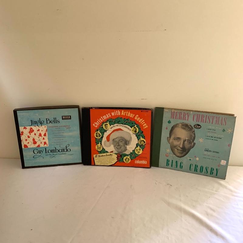 This lot includes various Christmas album sets. Including: Christmas with Arthur Godfrey, Merry Christmas by Bing Crosby, Jingle Bells by Guy Lombardo, and more. Most are 10” 78s vinyl records. Charles Dickens “A Christmas Carol” and Handel’s “The Messiah” are 12” 78s. The Under the Christmas Tree set by Jan Garner is missing a record and the ones that are included have some chips.