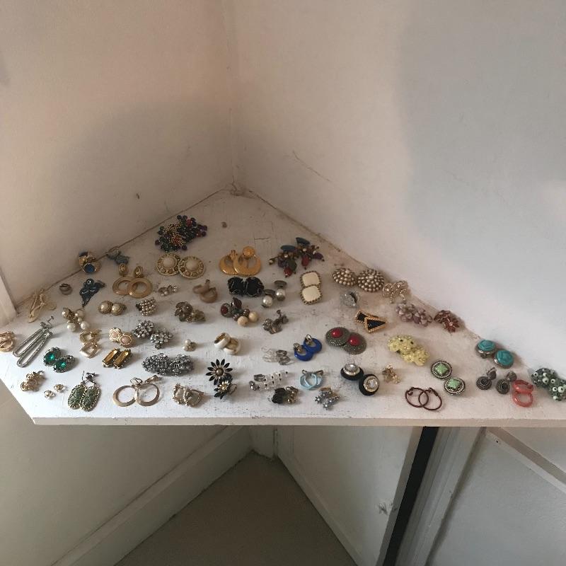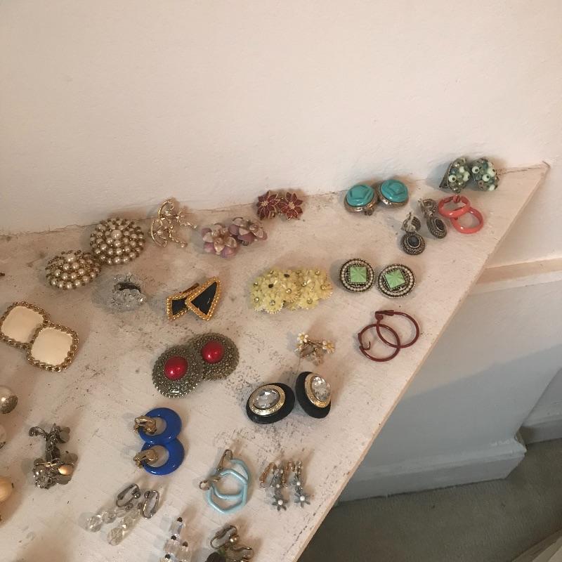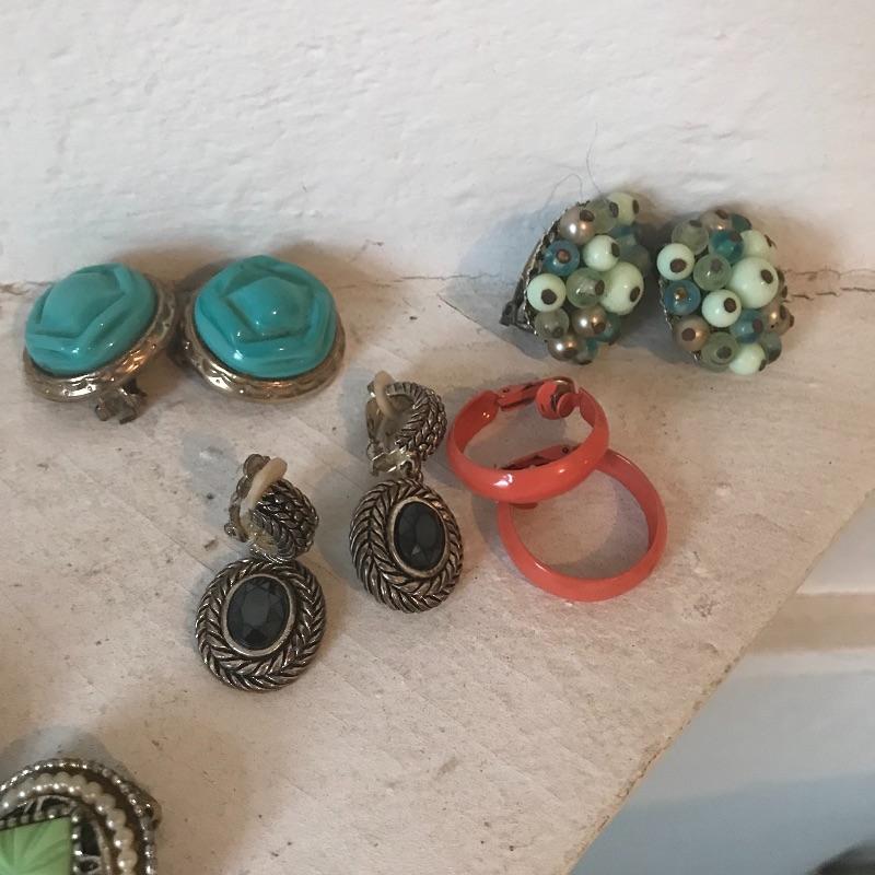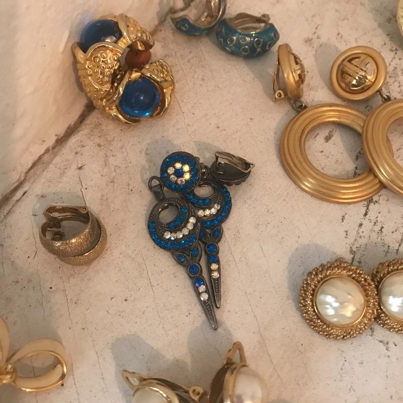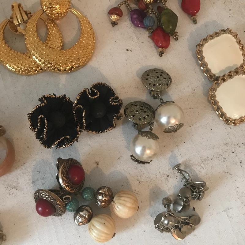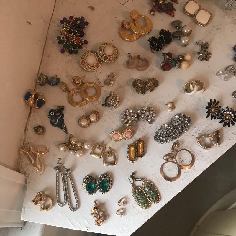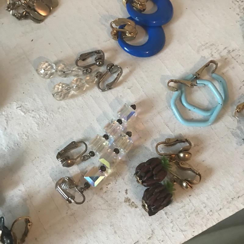 Fifty-nine pairs of clip earrings that range from basic costume to vintage glass. Another array of jewelry to accommodate all styles. Shipping available.