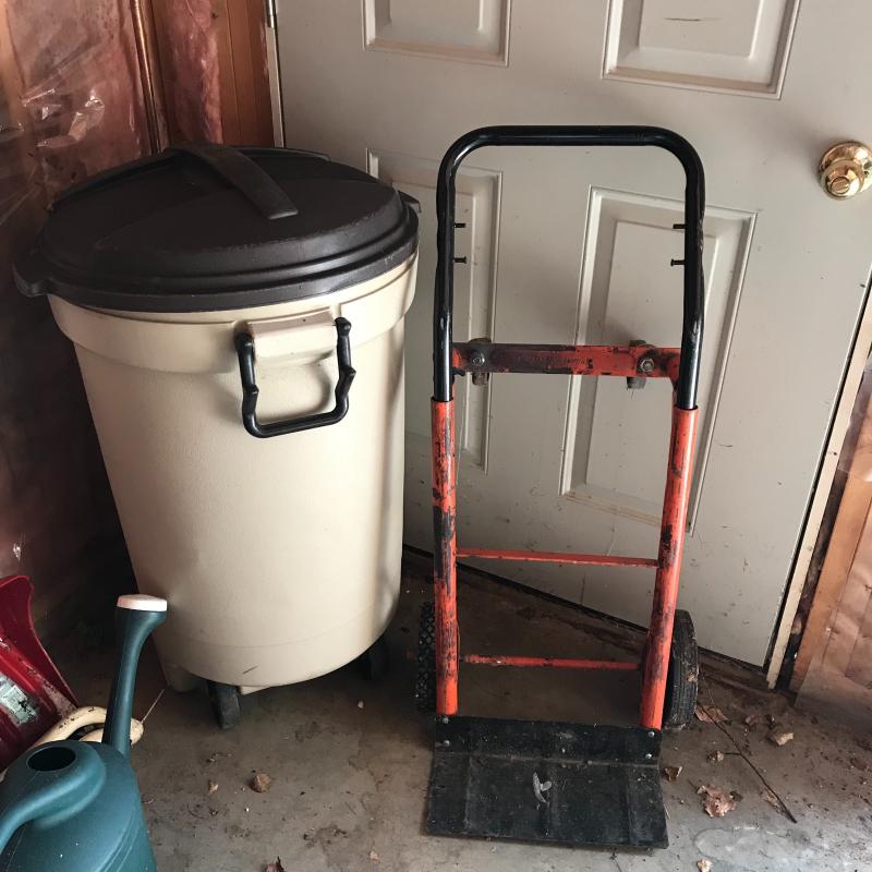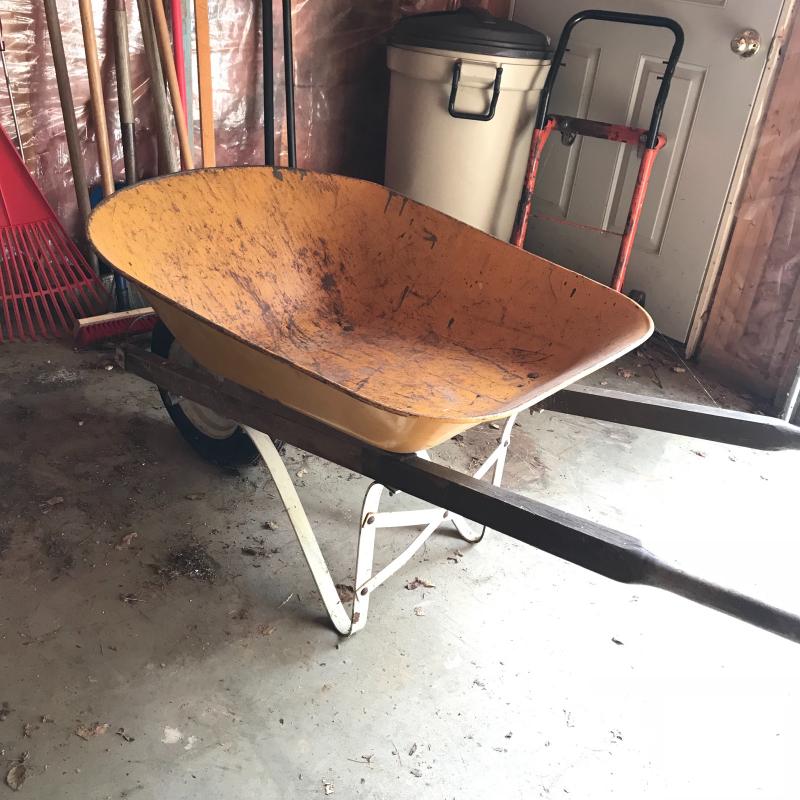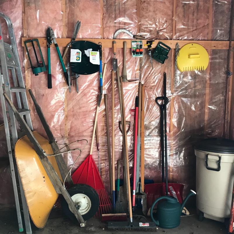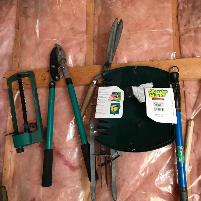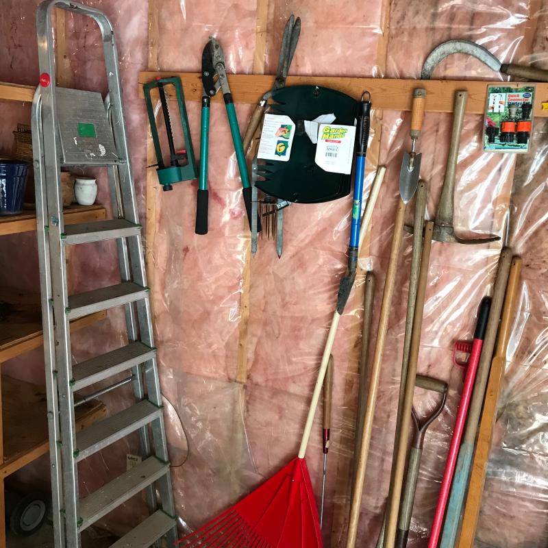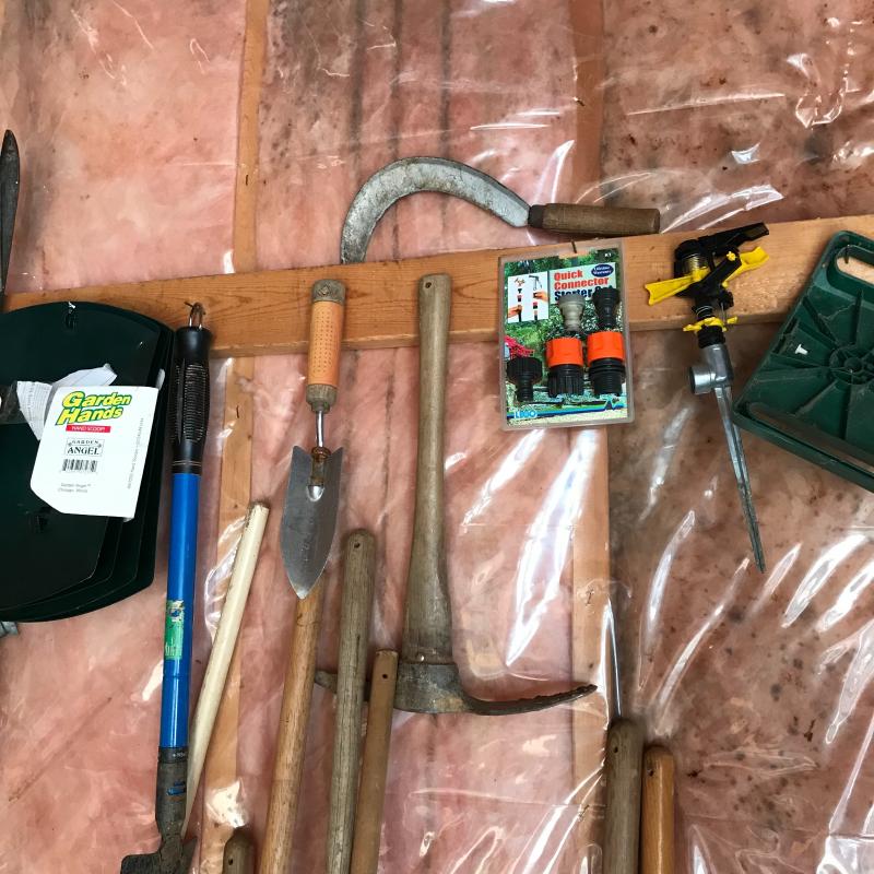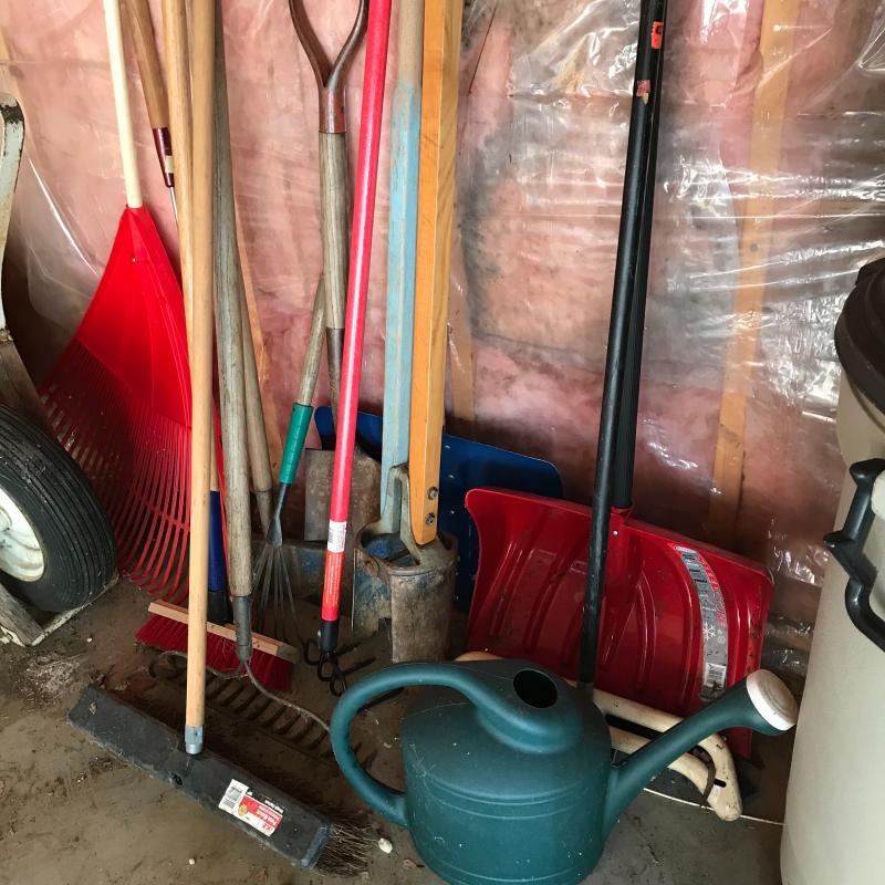 Large collection of household and yard tools from shears to ladders and sprinklers to brooms. Lot includes a large trash can with lid, wheelbarrow (tire needs air), an aluminum and simple wooden ladders. See photos for entire lot inventory. No shipping.