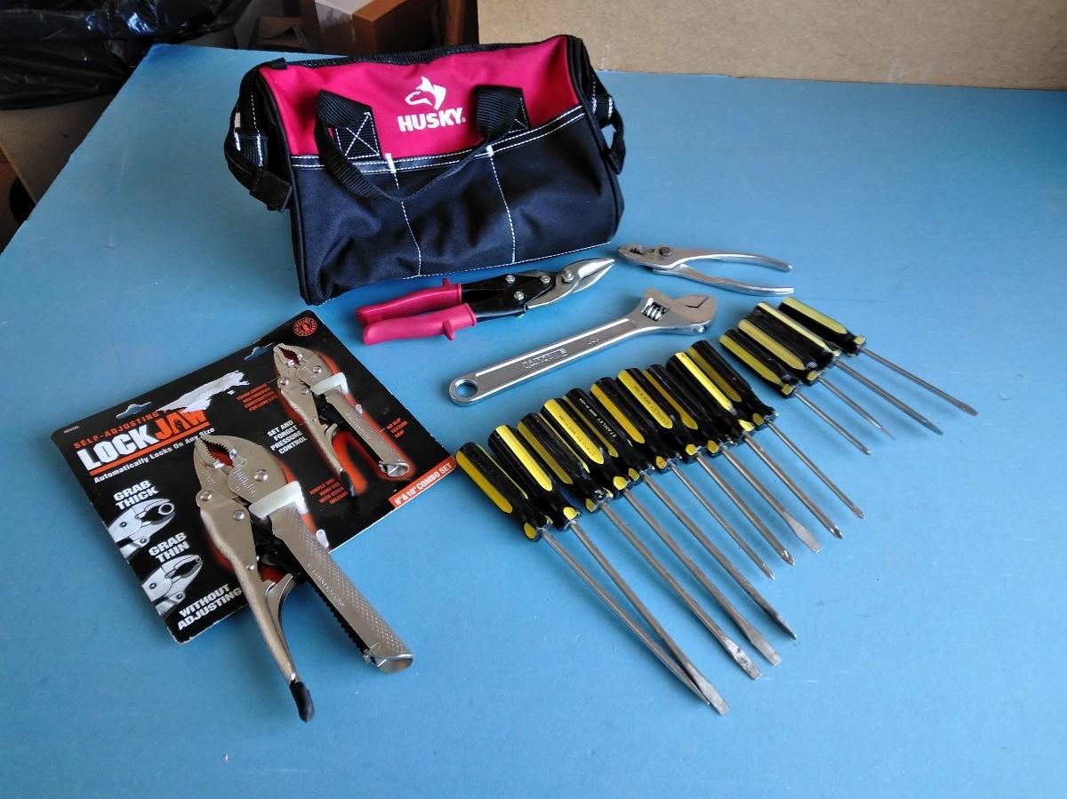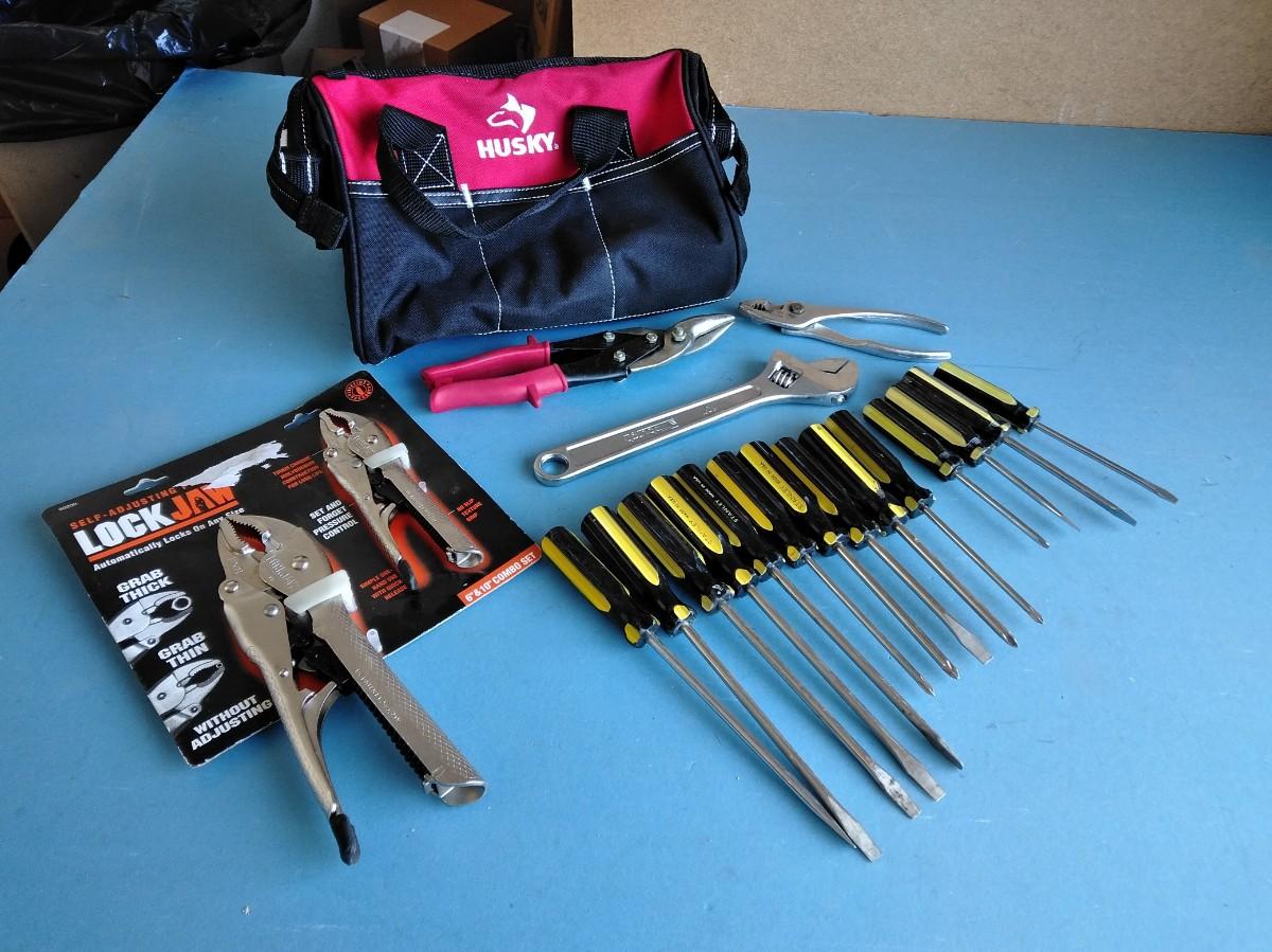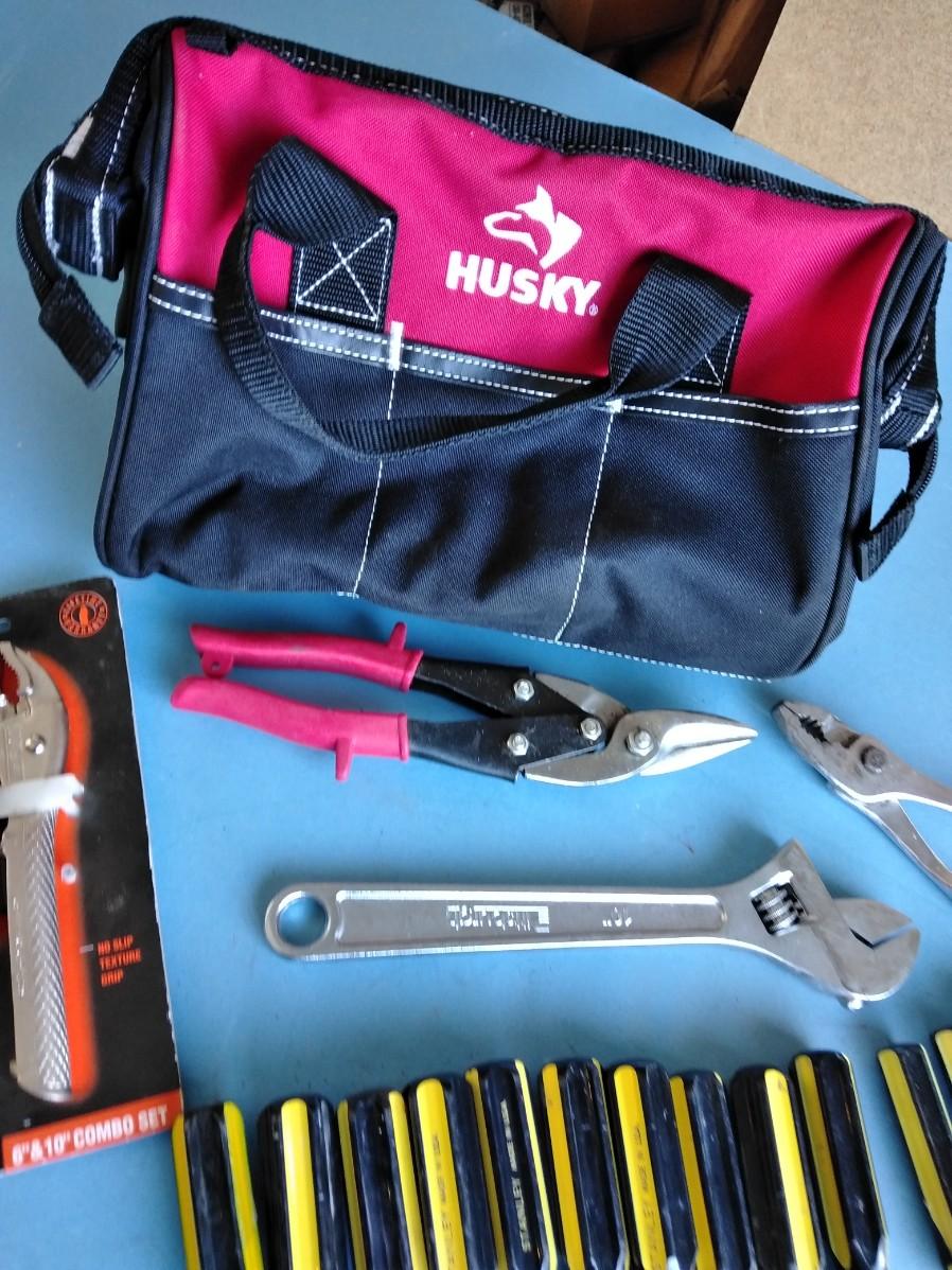 HUSKY TOOLBAG WITH AN ASSORTMENT OF HANDTOOLS.