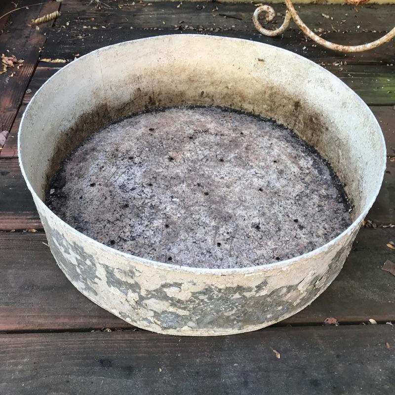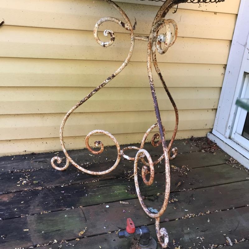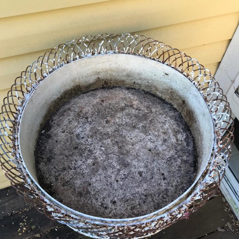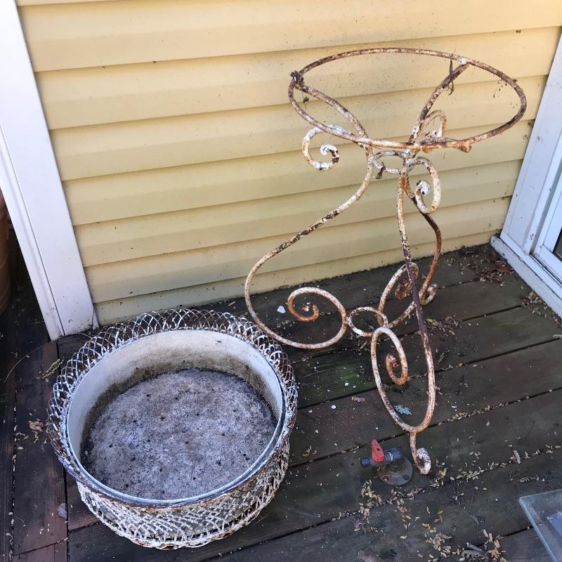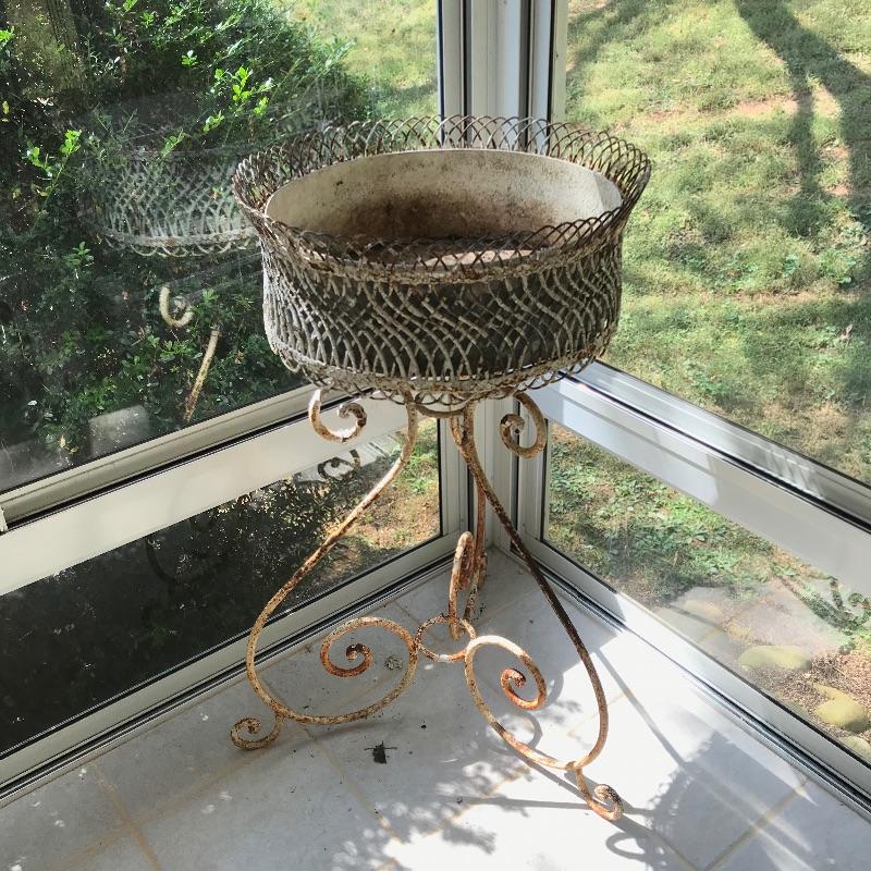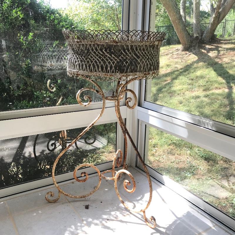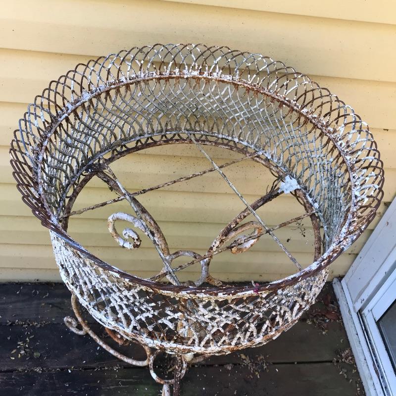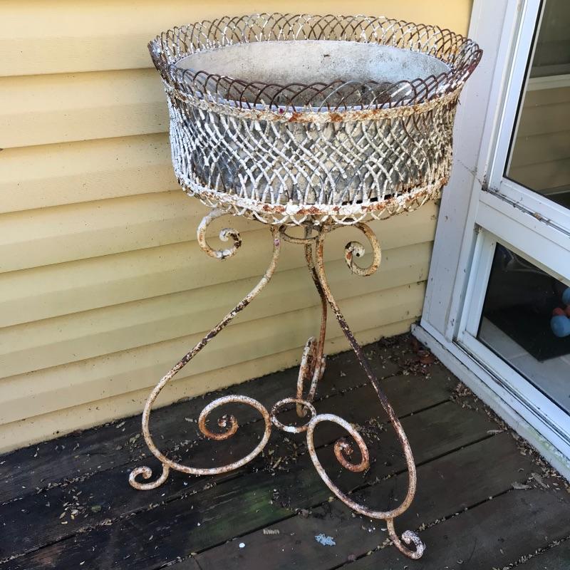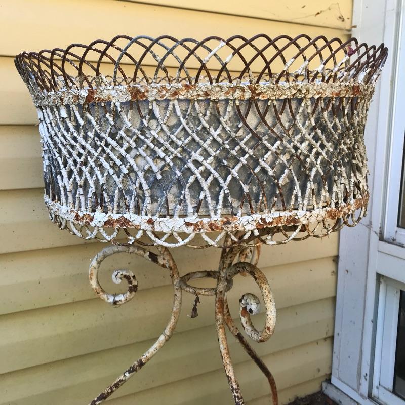 A superb vintage find here with this ultimate in shabby chic planter. The white paint is pretty flaky, but it can be perfect as is or with some refurbishing depending on your taste. Rust is found throughout and piece is 20” diameter and just over three feet tall. There is a metal basin with drainage holes for your next plant. See photos. No shipping.