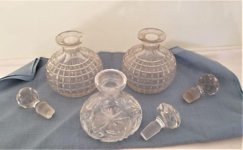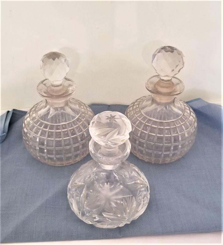 Three antique pressed glass scent bottles - lift the stoppers and you can still smell the perfume. Early 20th century. One stopper has a chip to the base. Matching pair are 6" tall - the other is 5.5" tall. Antique condition.