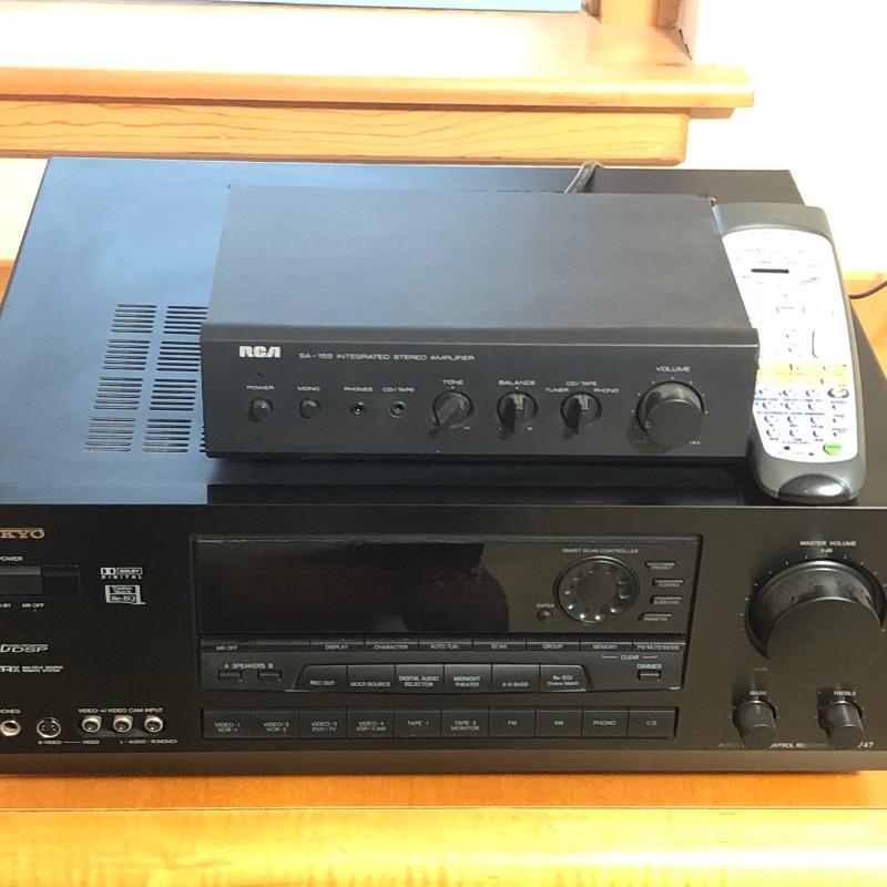 Super Sweet Onkyo audio video control receiver model # TX-DS747. RCA SA-155 Integrated stereo amplifier. Both units come on when plugged in however remote has dead batteries and could not be tested. Shipping available.