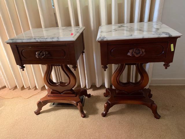 Pair reproduction Victorian Lyre Tables with authentic Carrera Marble Tops.