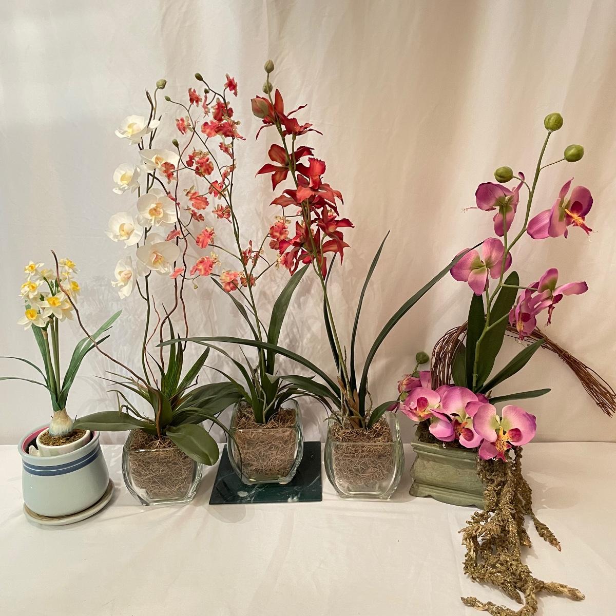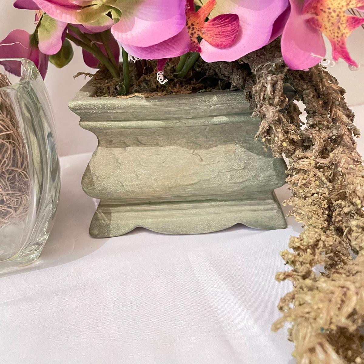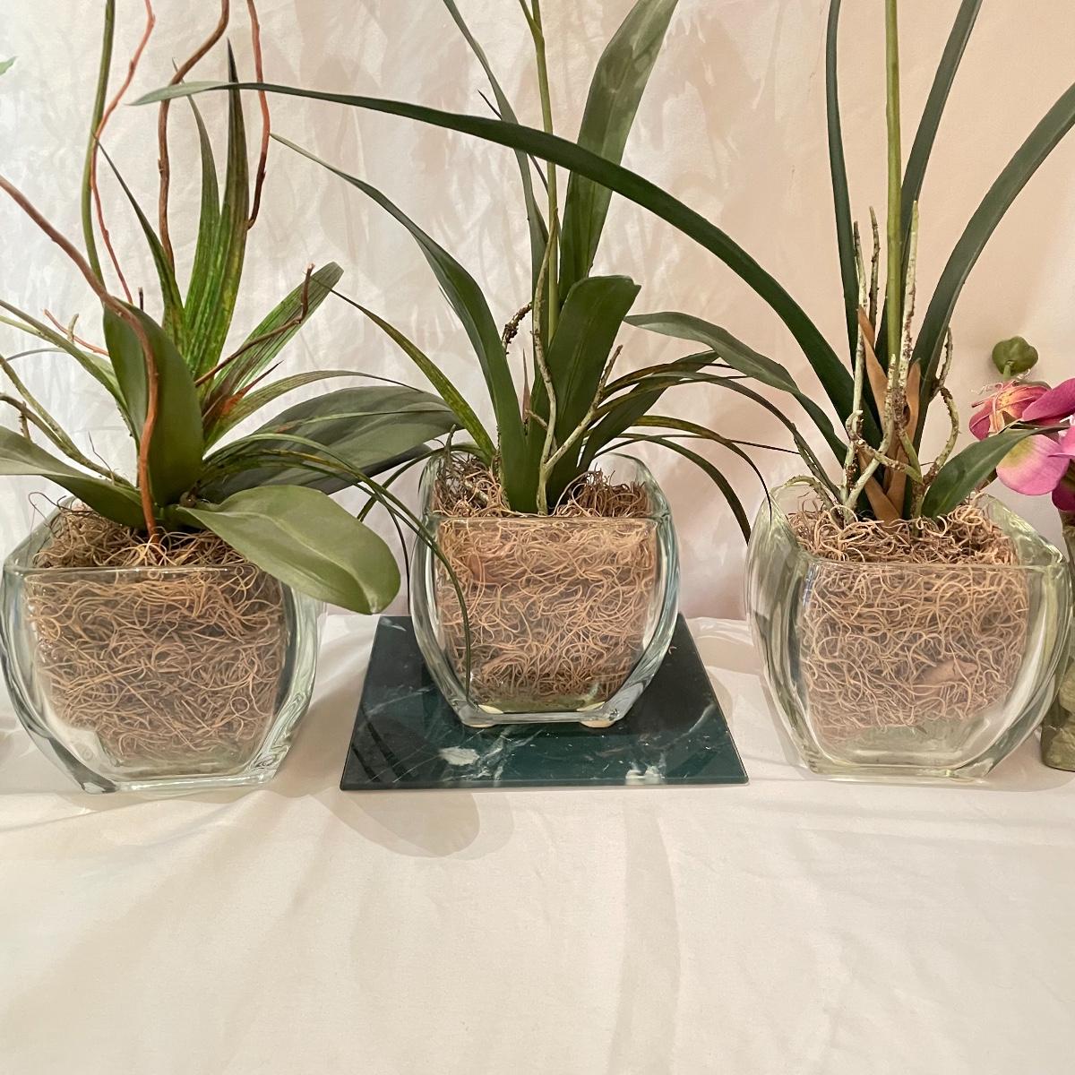 Lovely year round floral decor to brighten up your home or work space. Lot includes three matching 4.5”sq x 4.5” tall glass pots with orchids and more. Lot also features two ceramic roses on faux floral stems, these are lovely, but have some chips you can see if you’re seeking them out, see images. Another set of faux roses look exactly like real dried roses, but these ones won’t fall apart any time soon. The Terracotta pot holding the carnations is about 6” tall. One square emerald marble colored glass tile is included with floral. See images. Local pick up only.