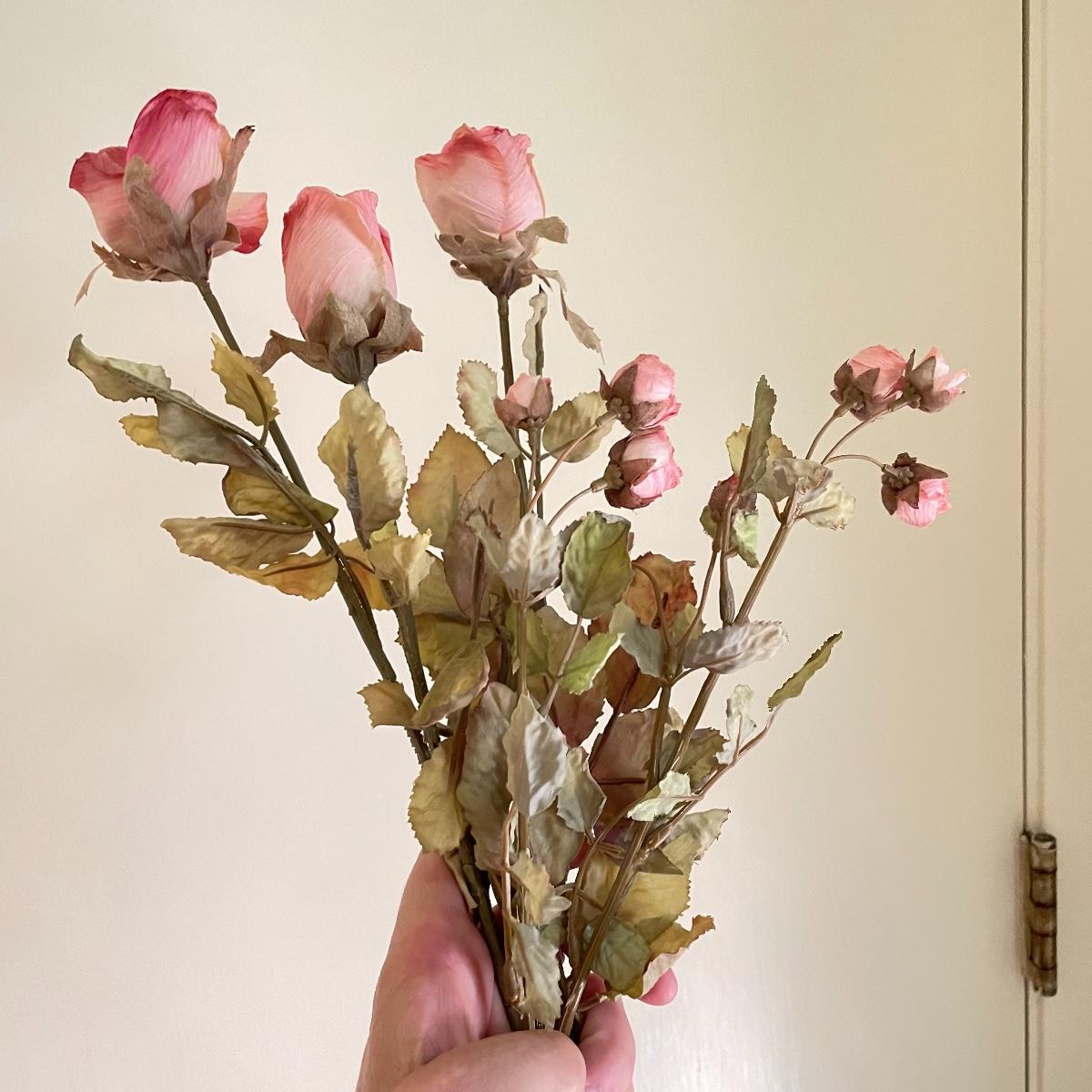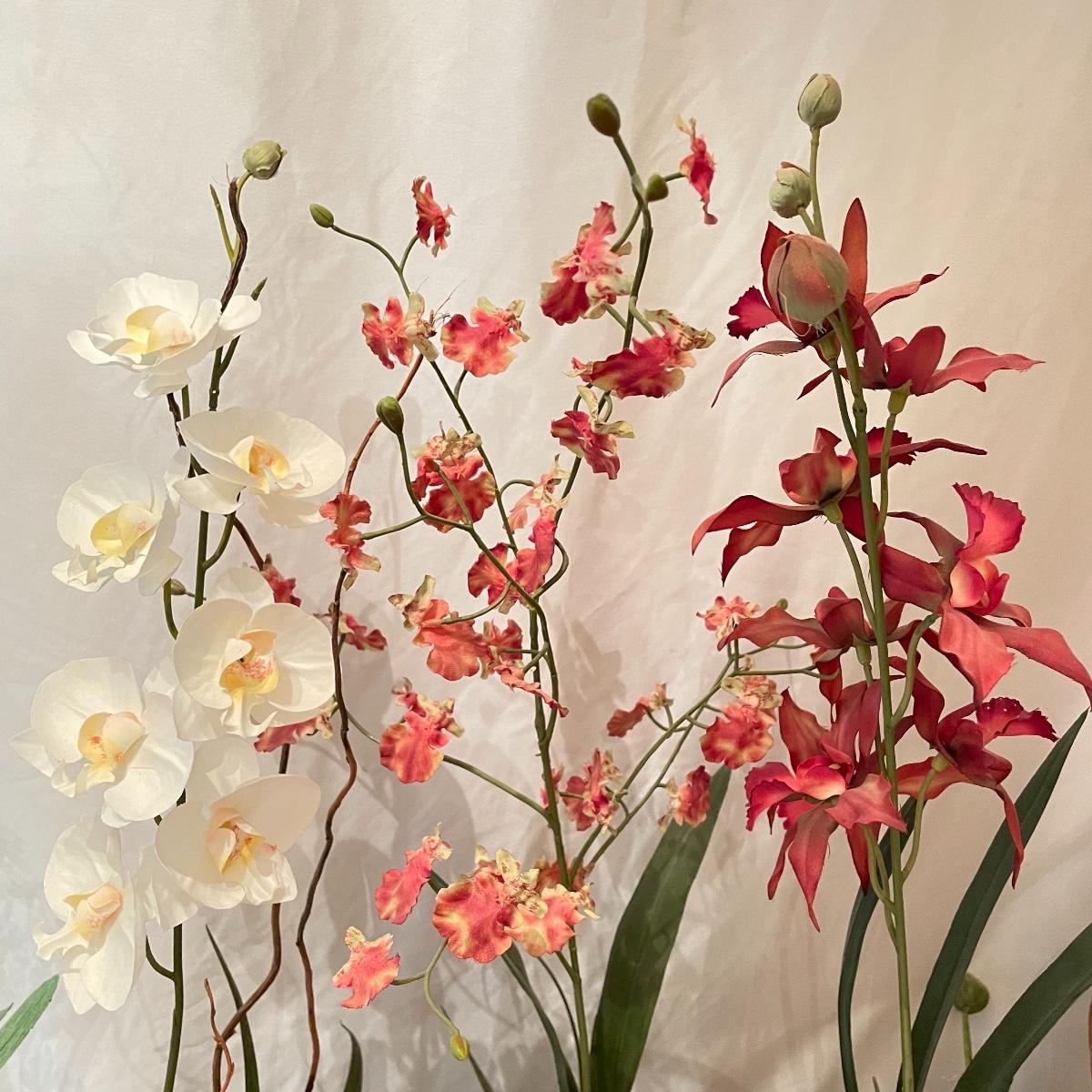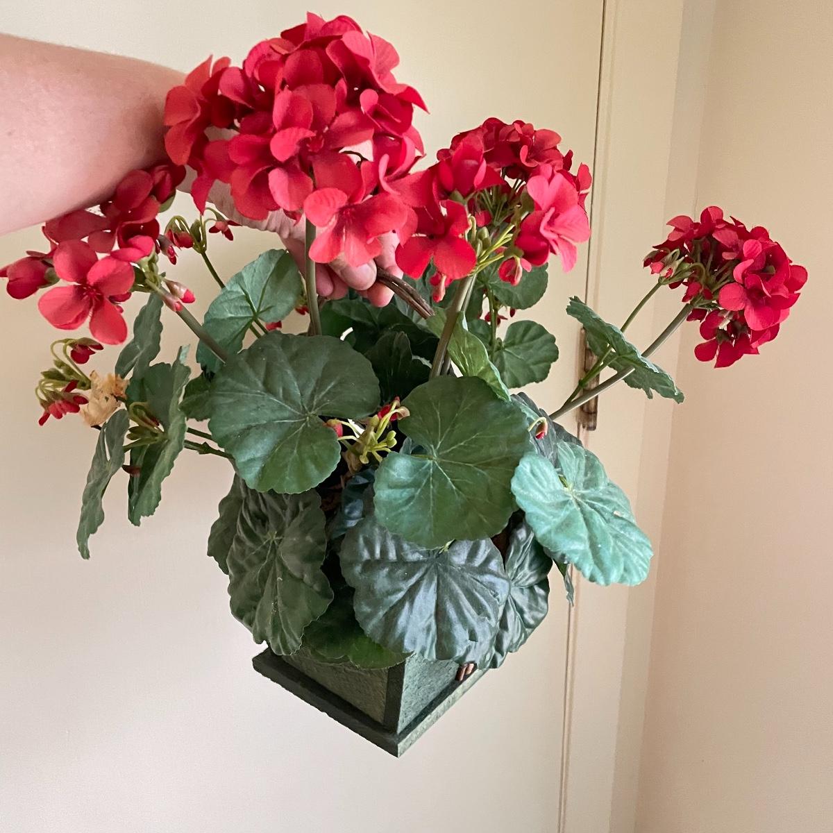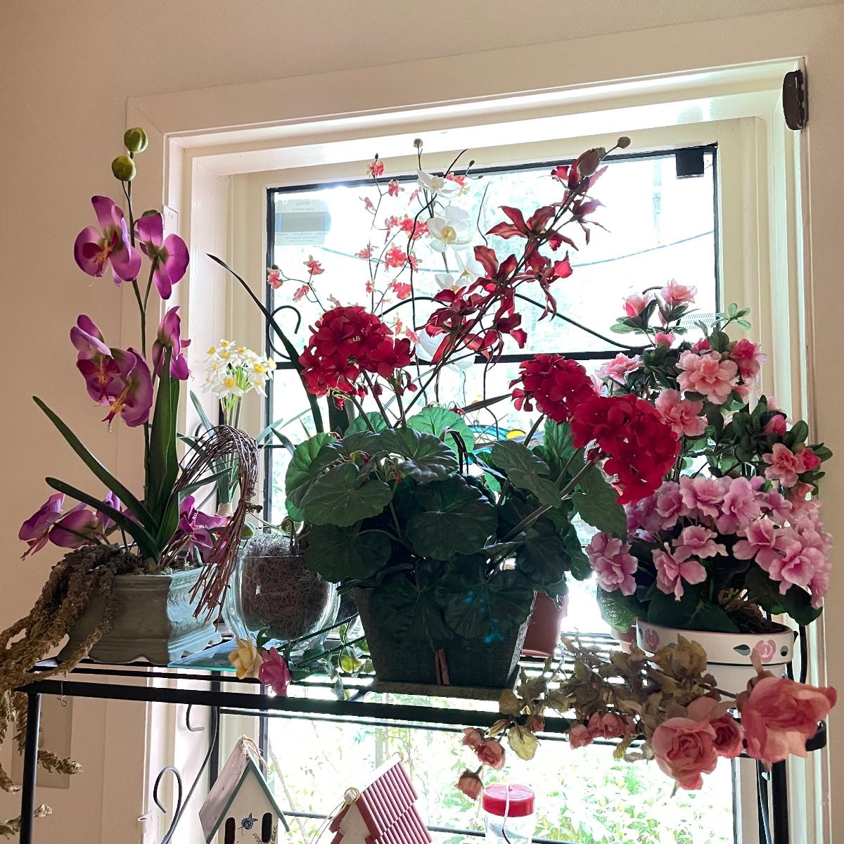 Lovely year round floral decor to brighten up your home or work space. Lot includes three matching 4.5”sq x 4.5” tall glass pots with orchids and more. Lot also features two ceramic roses on faux floral stems, these are lovely, but have some chips you can see if you’re seeking them out, see images. Another set of faux roses look exactly like real dried roses, but these ones won’t fall apart any time soon. The Terracotta pot holding the carnations is about 6” tall. One square emerald marble colored glass tile is included with floral. See images. Local pick up only.