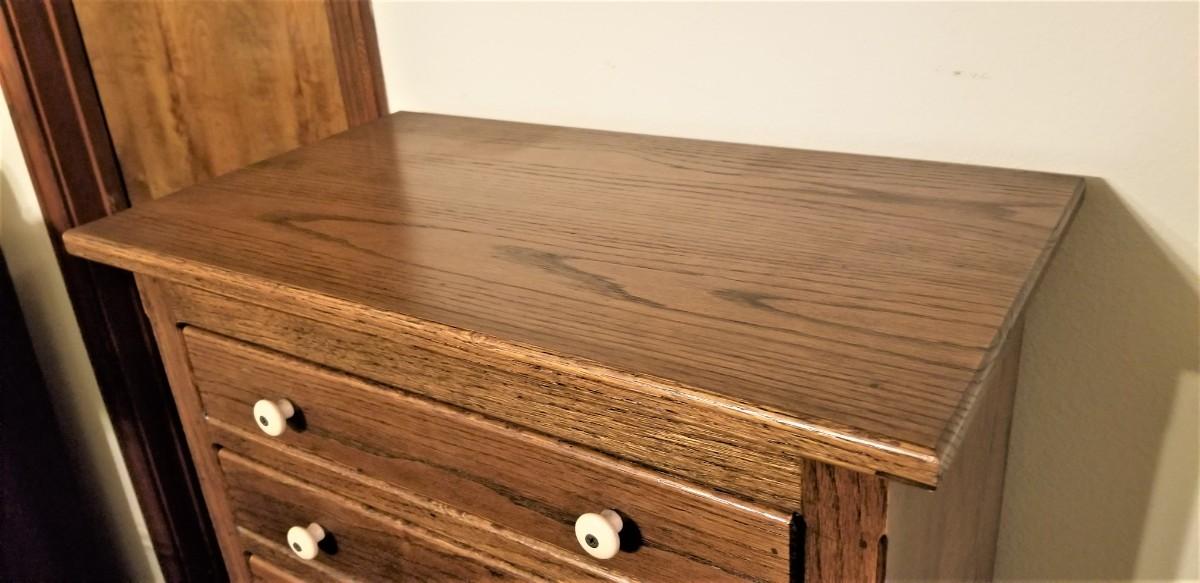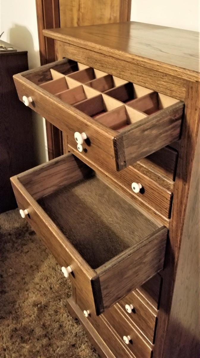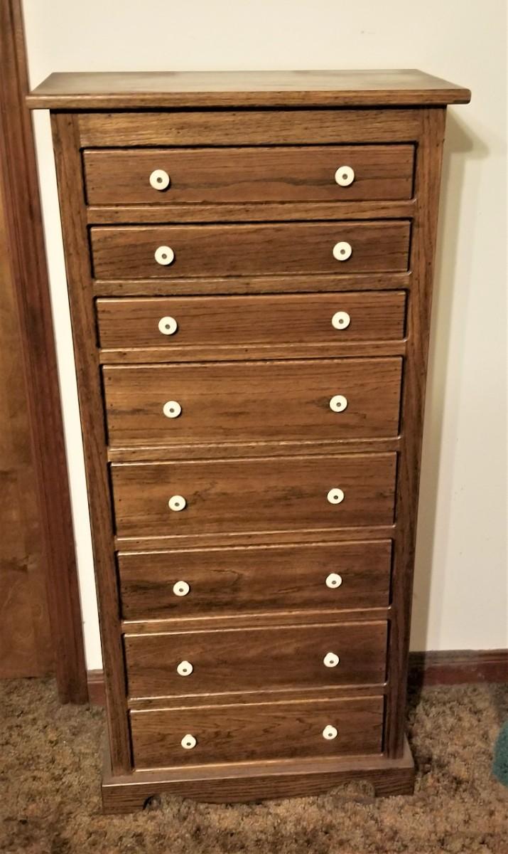 Contemporary solid oak 8 drawer cabinet - perfect for jewelry or flatware - top three drawers divided. 23" across, 13" deep, 48.5" tall. Good condition.
