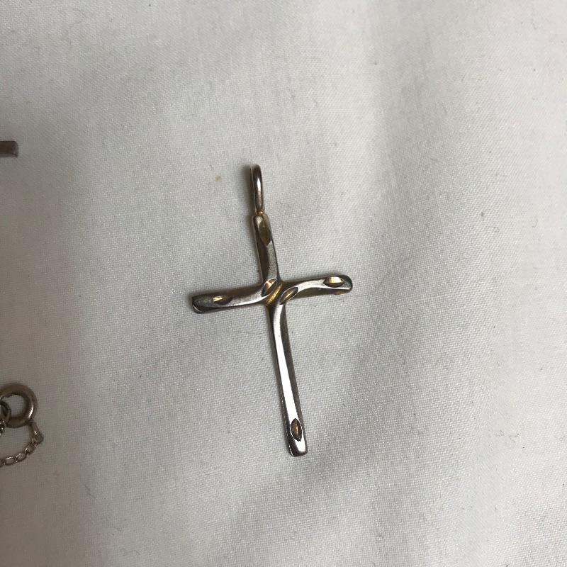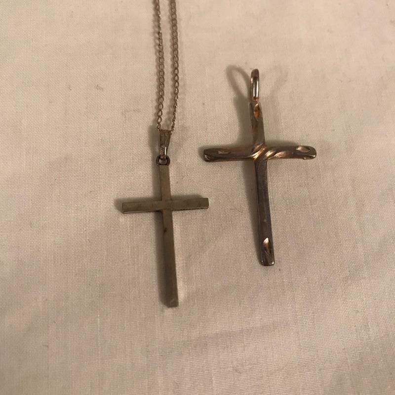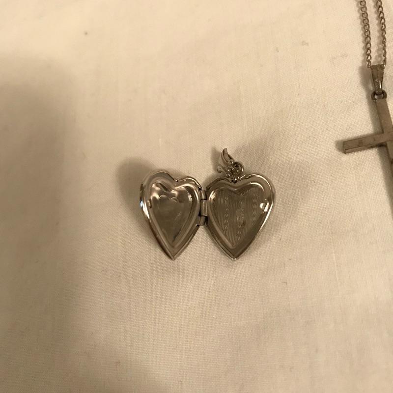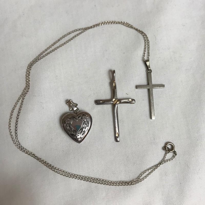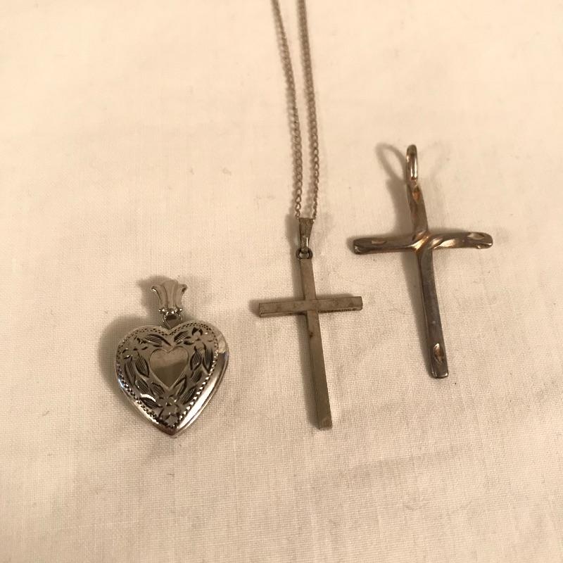 Three pieces (plus a chain) to tug at your heartstrings! Lovely designed small heart locket marked Sterling is roughly .75”. Two simple and elegant sterling/925 crosses with a sterling marked chain. See photos for markings. Chain is 18” long. Shipping available.