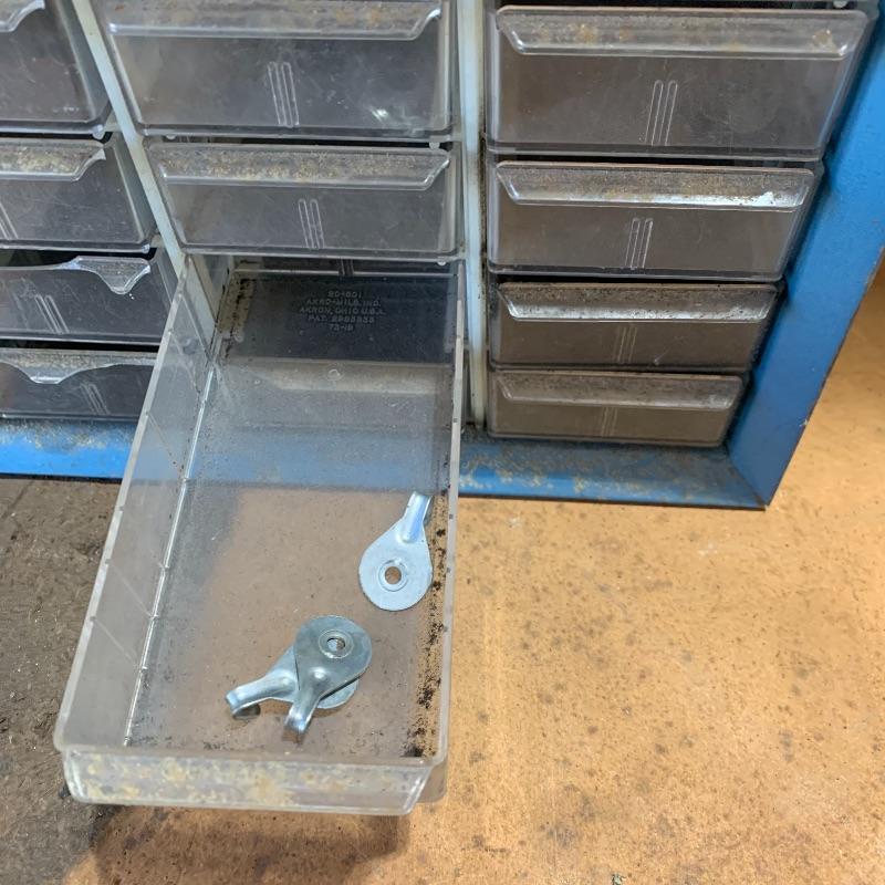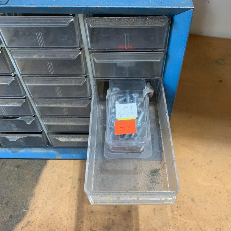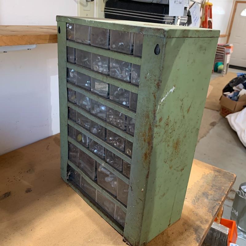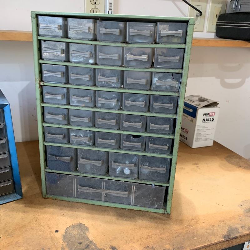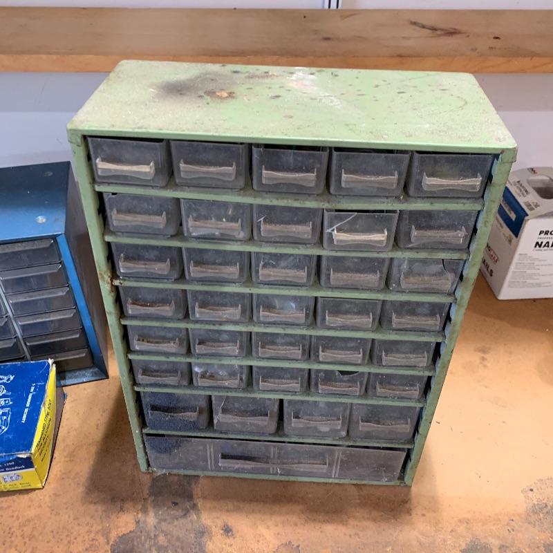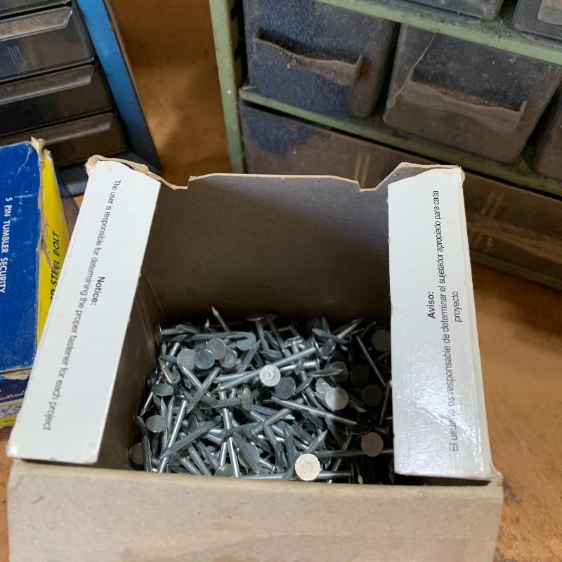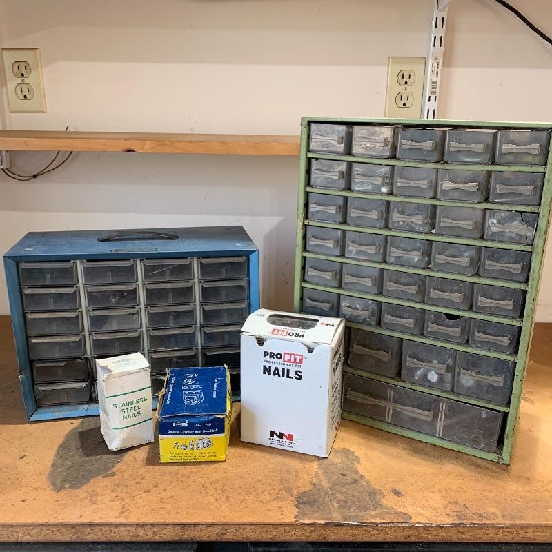 Two hardware bins that are both mountable and one with handle. The green one is the largest, measuring 12” x 6” x 16.5” and is full of mostly bolts of all sizes. The blue bin has very little in it and has a little damage to a few bottom drawer handles (see pix). A brass dead bold and couple extra boxes of nails are included in the lot. Local pick up only.