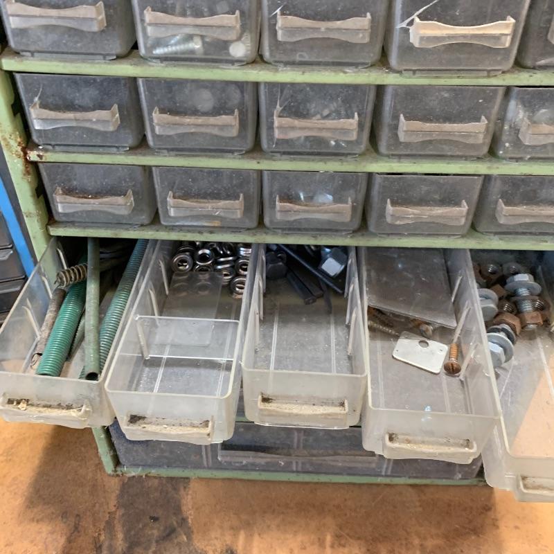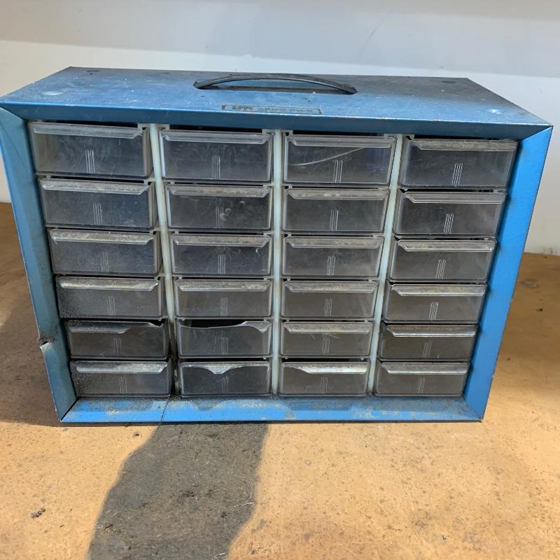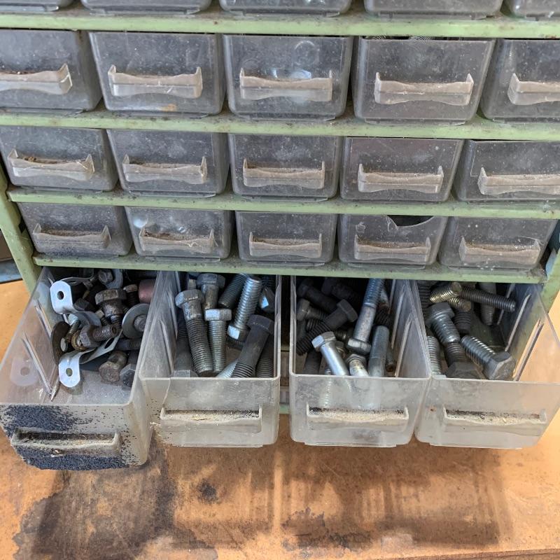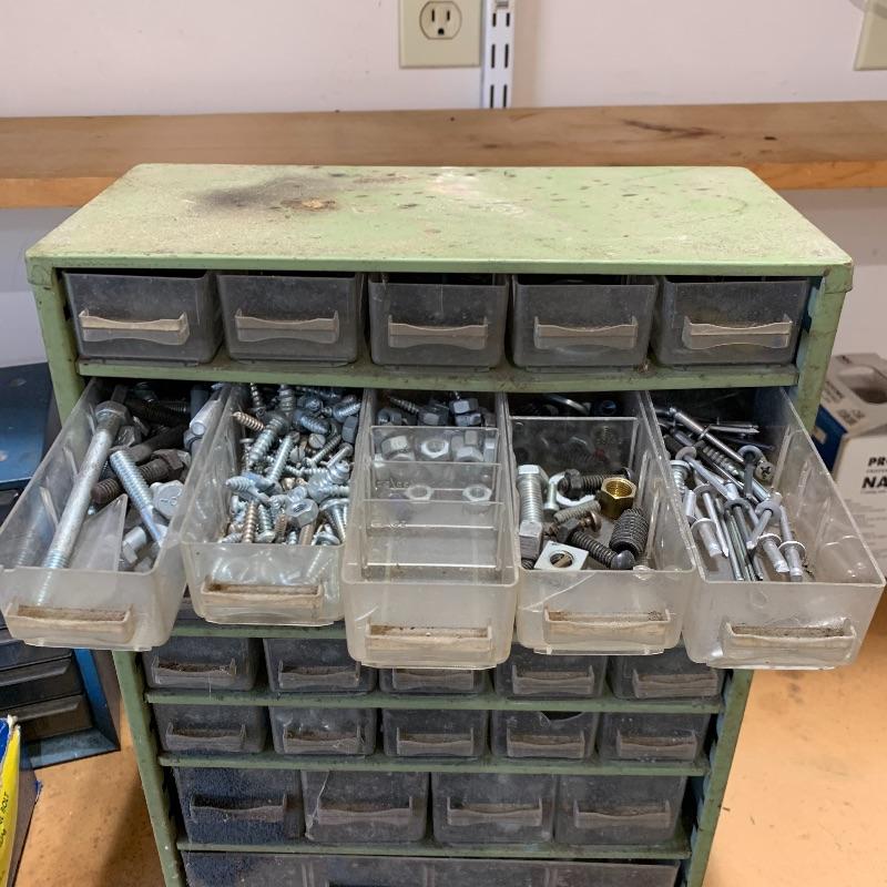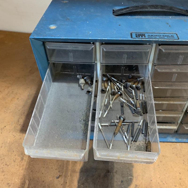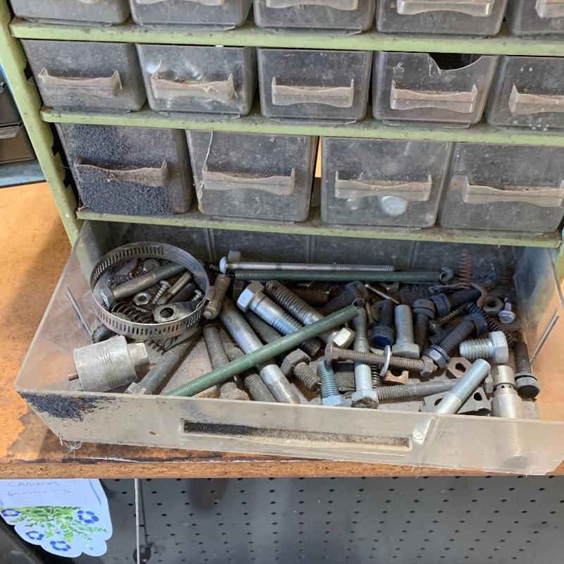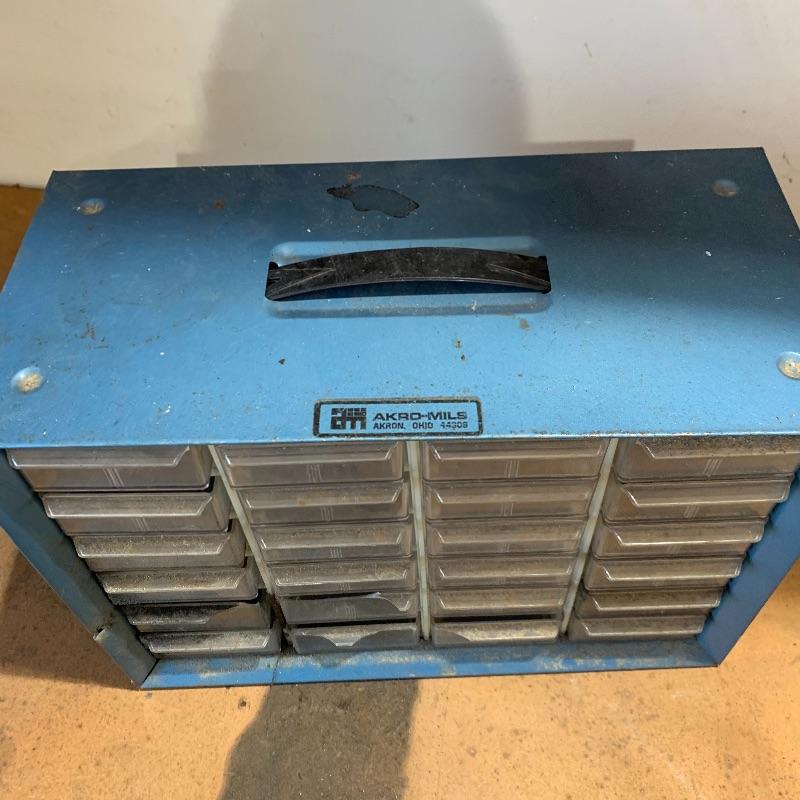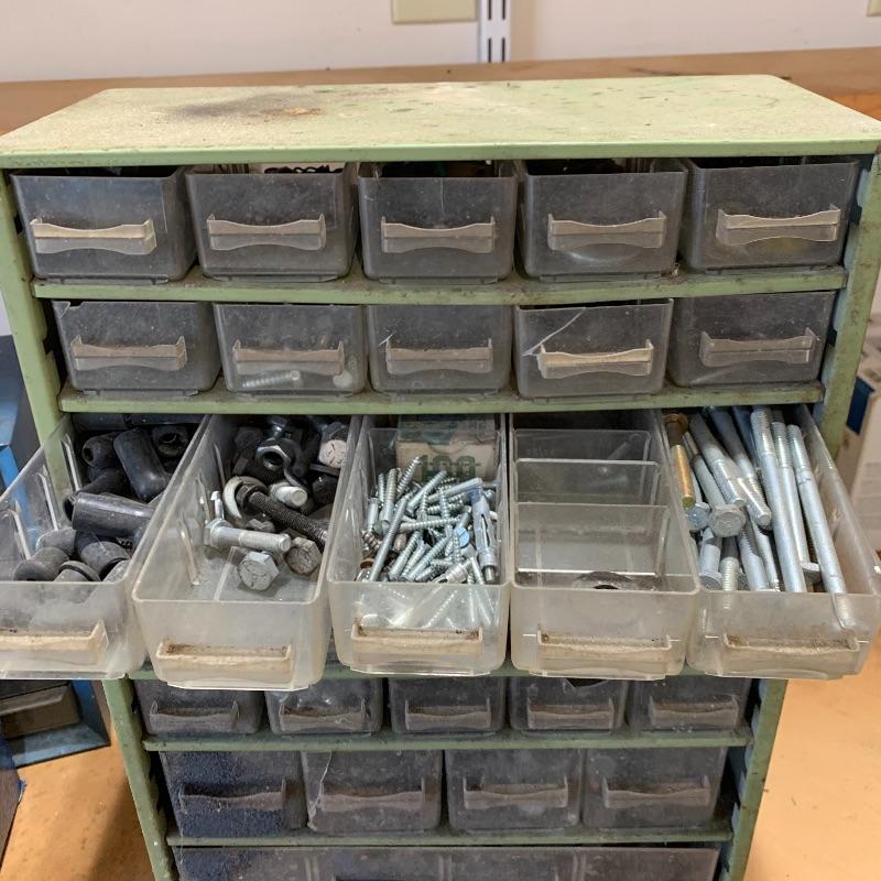 Two hardware bins that are both mountable and one with handle. The green one is the largest, measuring 12” x 6” x 16.5” and is full of mostly bolts of all sizes. The blue bin has very little in it and has a little damage to a few bottom drawer handles (see pix). A brass dead bold and couple extra boxes of nails are included in the lot. Local pick up only.