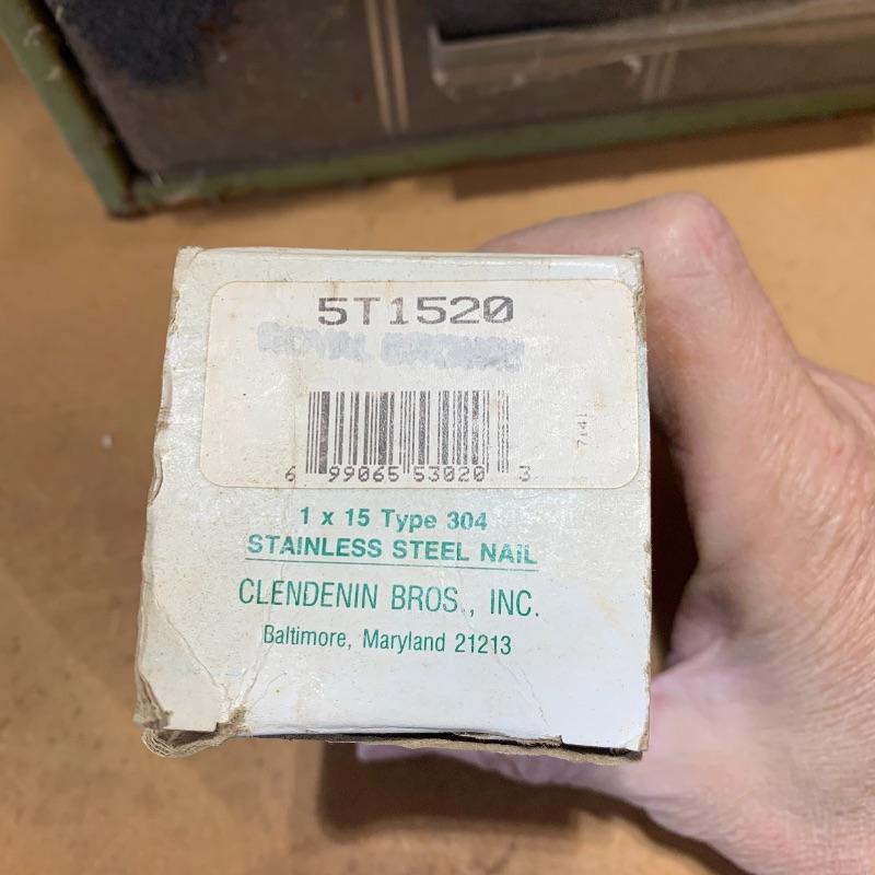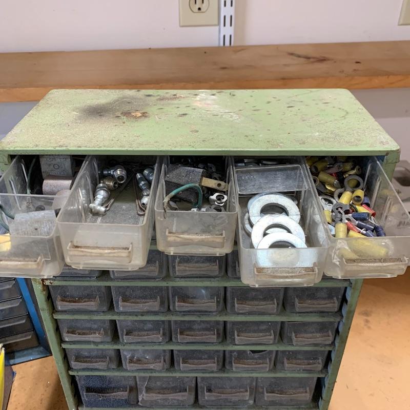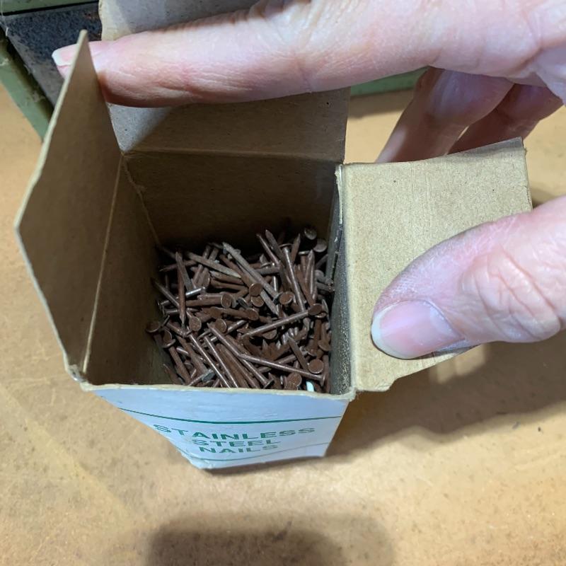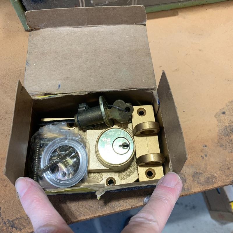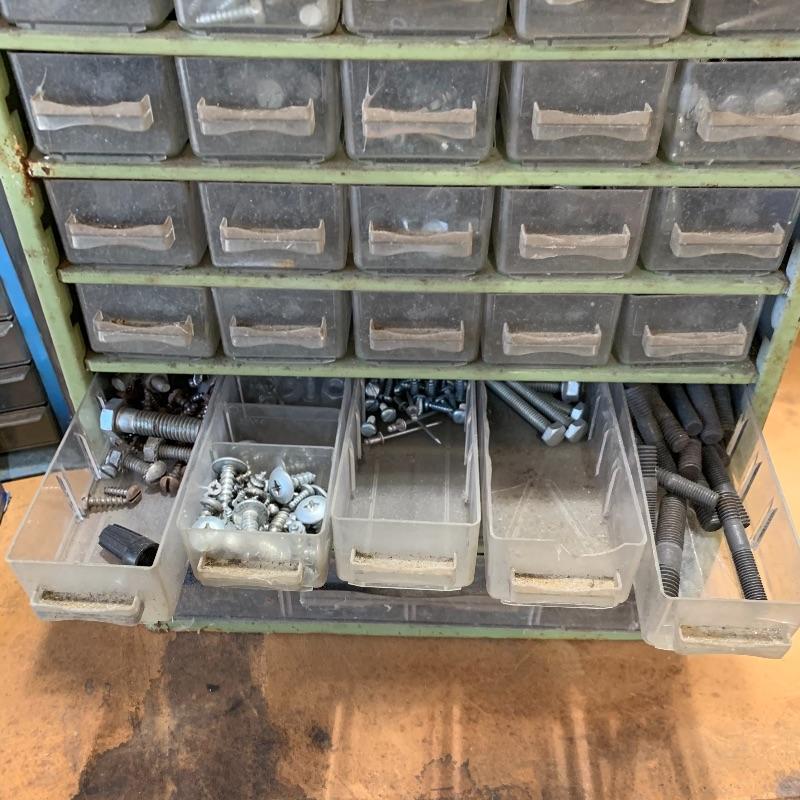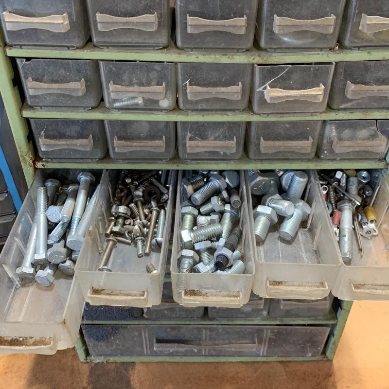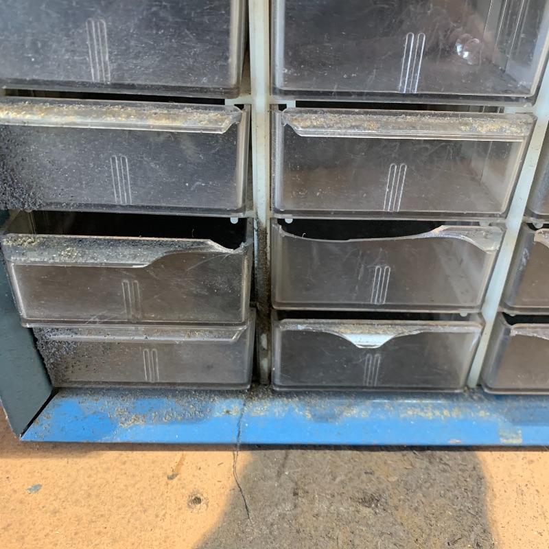 Two hardware bins that are both mountable and one with handle. The green one is the largest, measuring 12” x 6” x 16.5” and is full of mostly bolts of all sizes. The blue bin has very little in it and has a little damage to a few bottom drawer handles (see pix). A brass dead bold and couple extra boxes of nails are included in the lot. Local pick up only.
