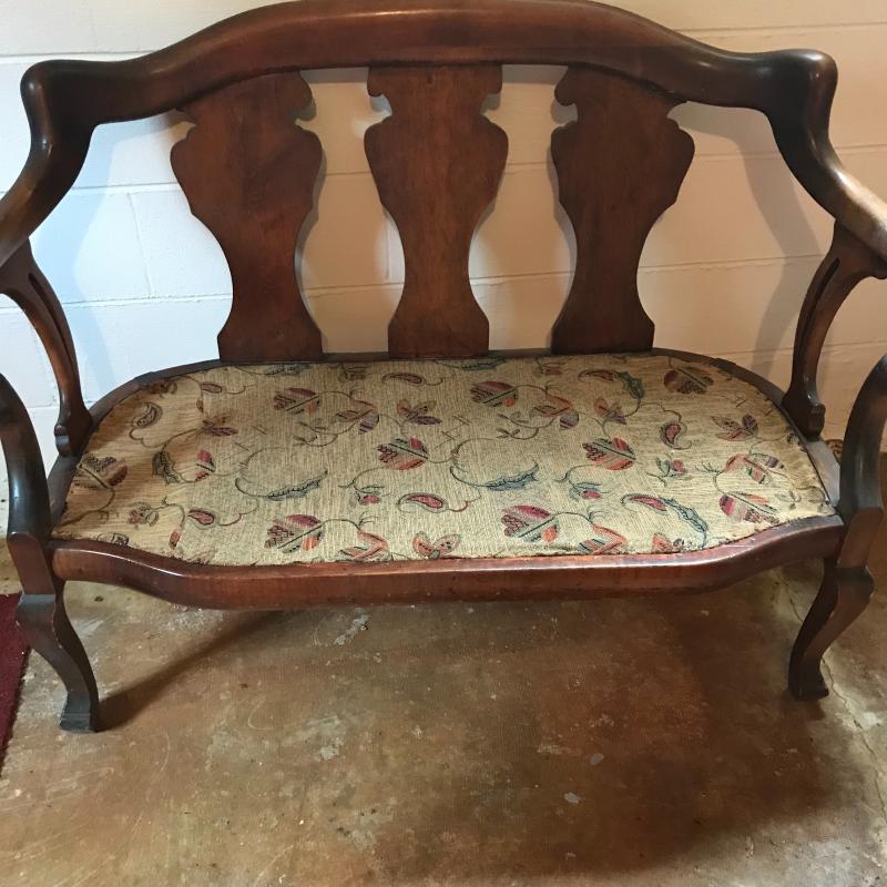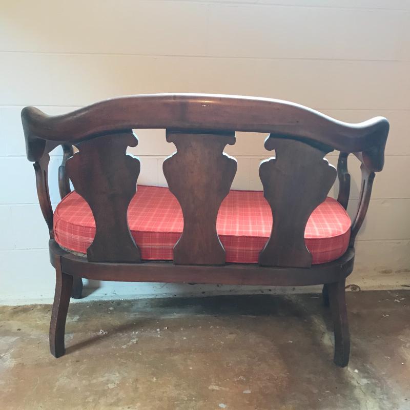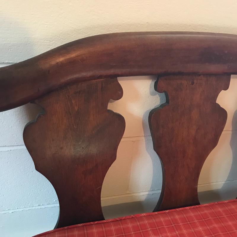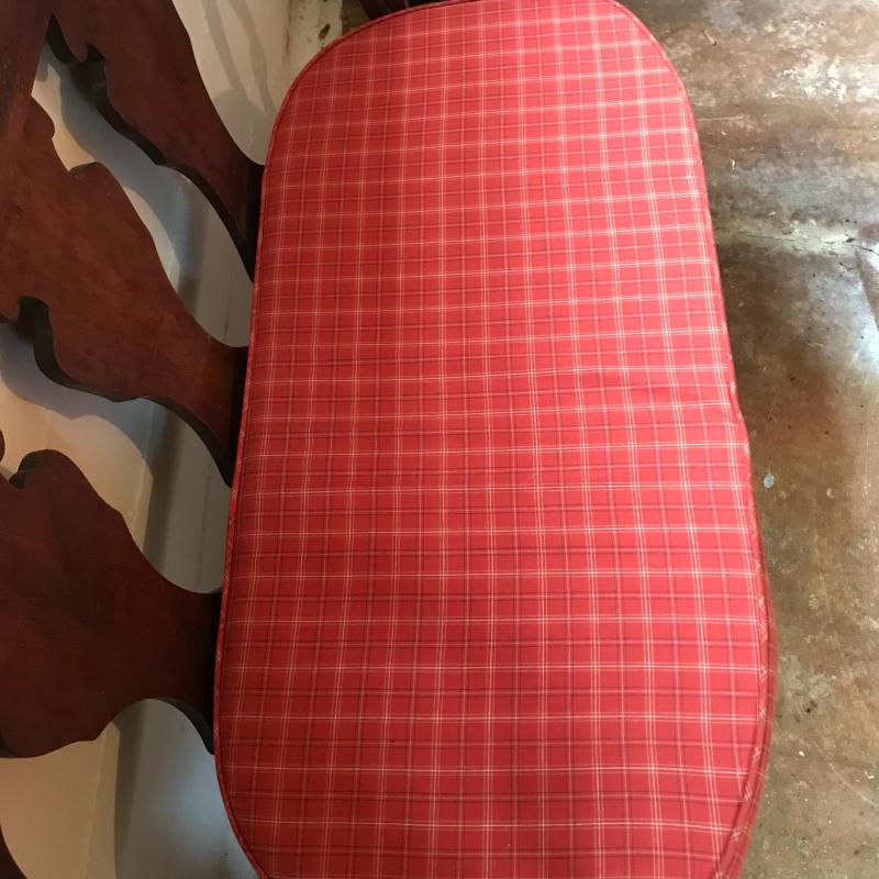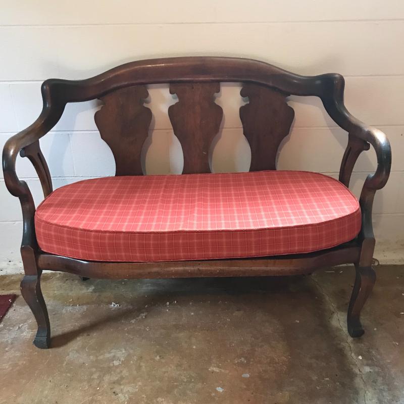 This is a fantastic piece! Solid darker wood seems to be restored with simple yet elegant designs, cloth-lined seat and a newer orange plaid cushion are in terrific shape. The wood has some dust and mildew, but the cushion appears clean and has a zipper to remove cover. Light wear is apparent on legs, see photos. Local pick up only.