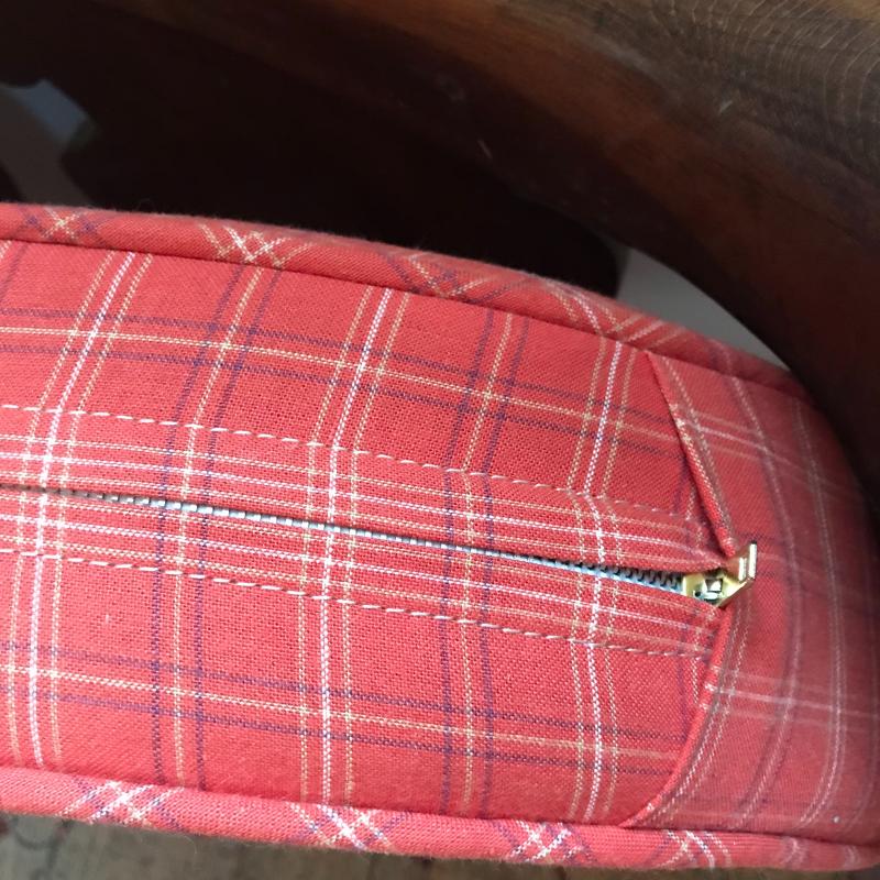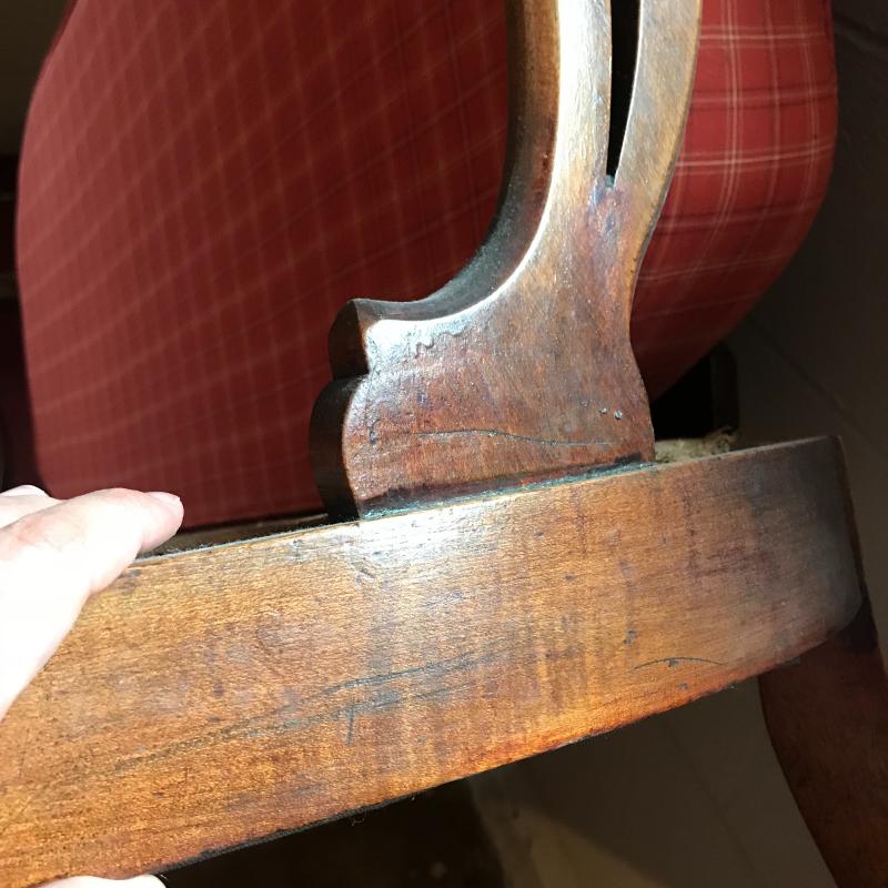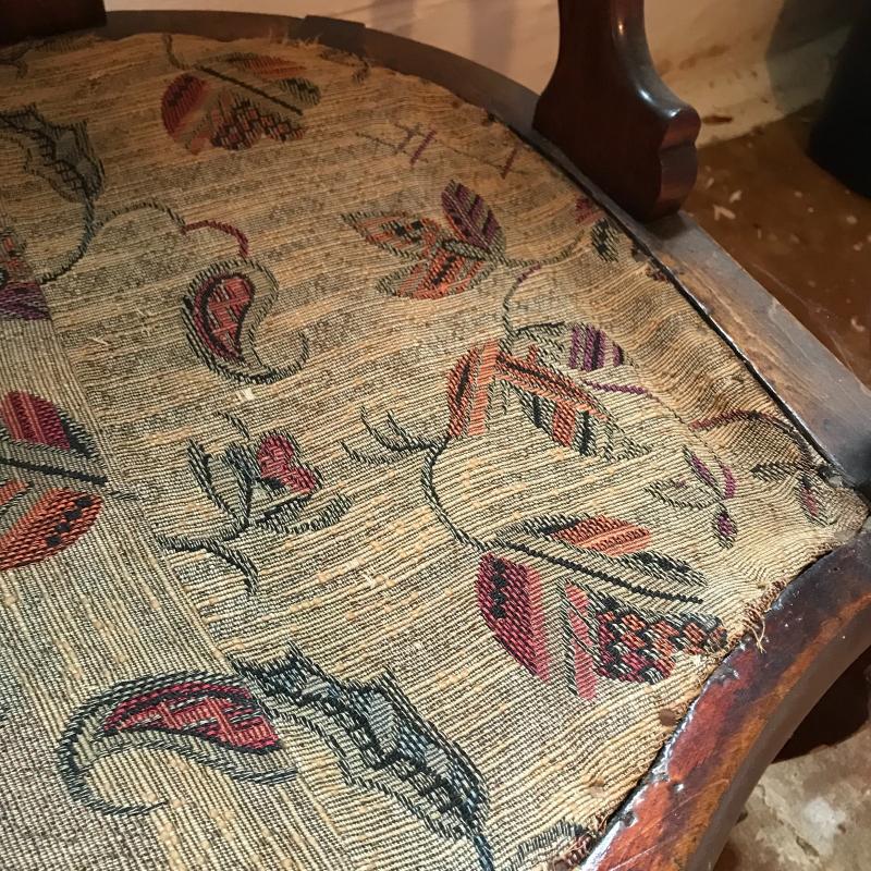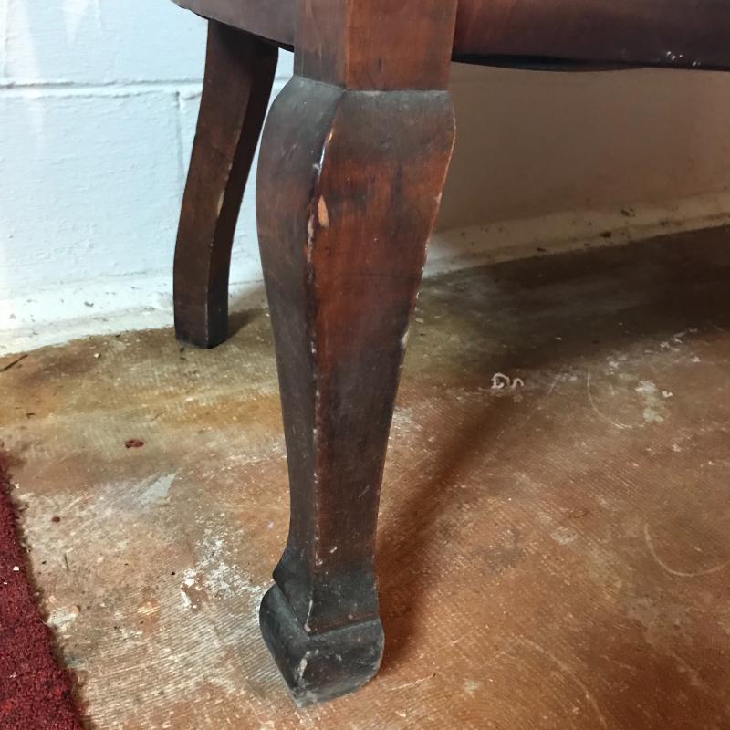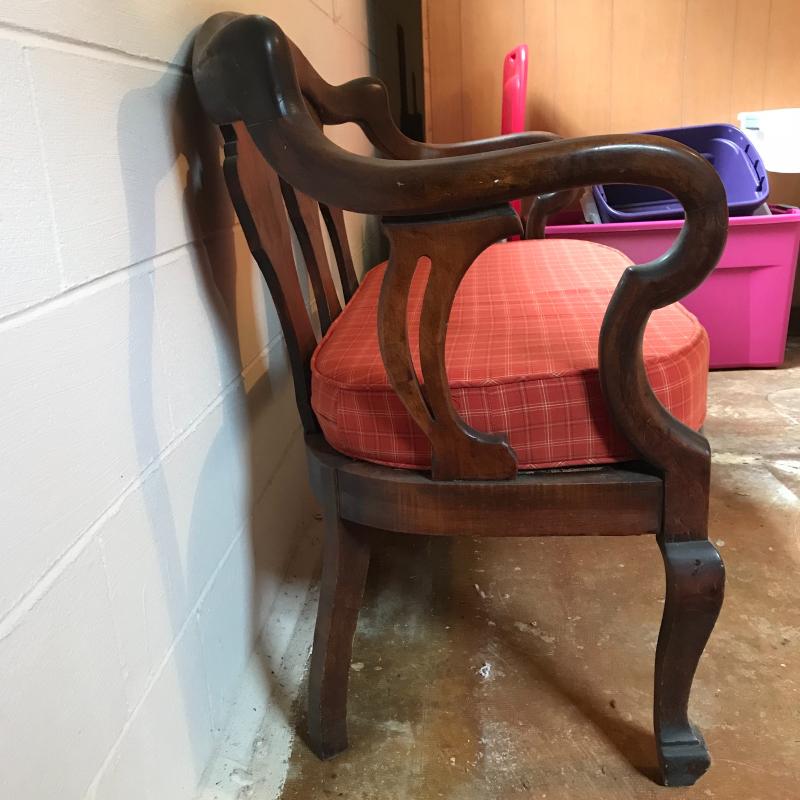 This is a fantastic piece! Solid darker wood seems to be restored with simple yet elegant designs, cloth-lined seat and a newer orange plaid cushion are in terrific shape. The wood has some dust and mildew, but the cushion appears clean and has a zipper to remove cover. Light wear is apparent on legs, see photos. Local pick up only.