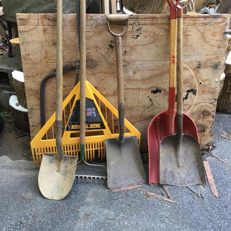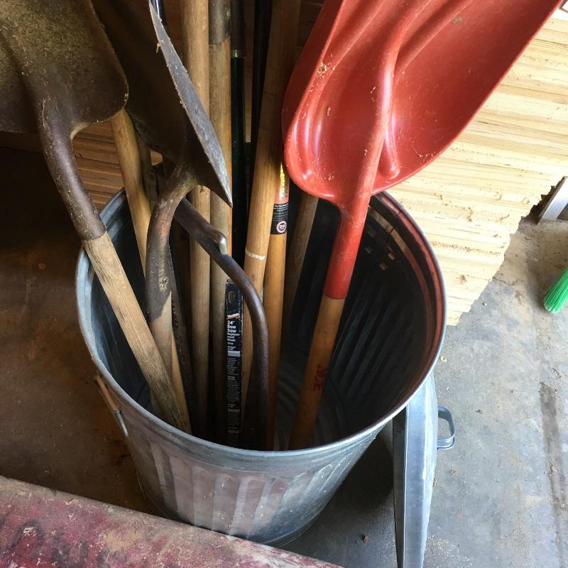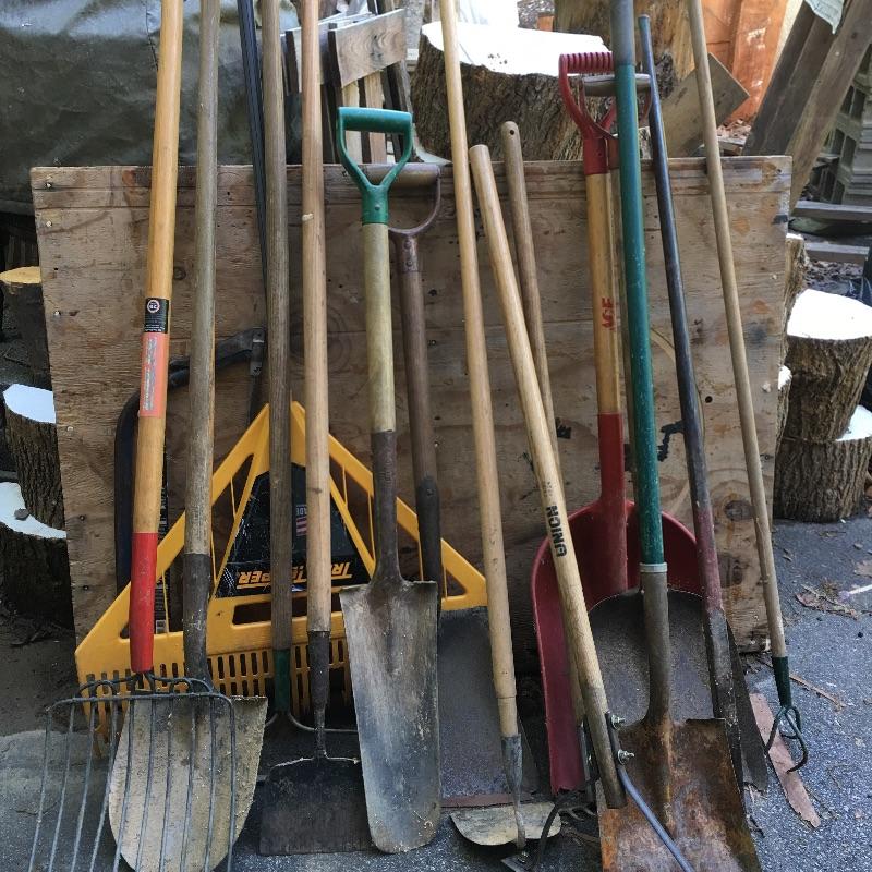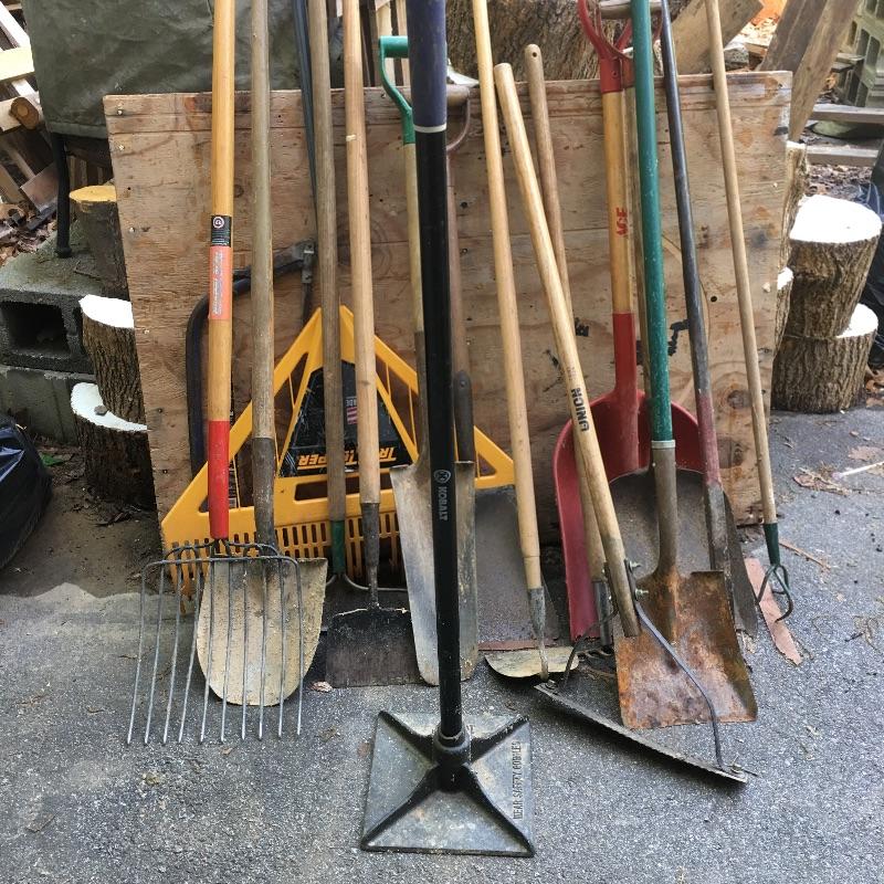 Large assortment of yard tools including tamper,pitchfork,hoe,shovel and more.