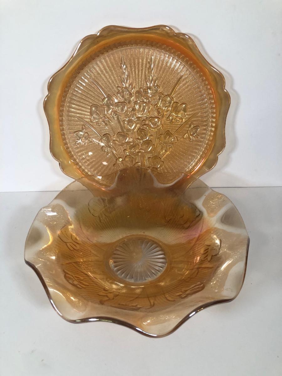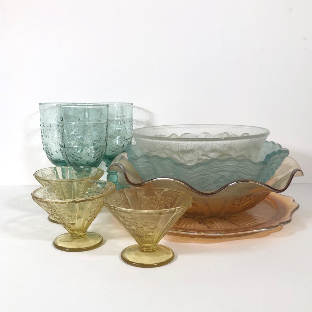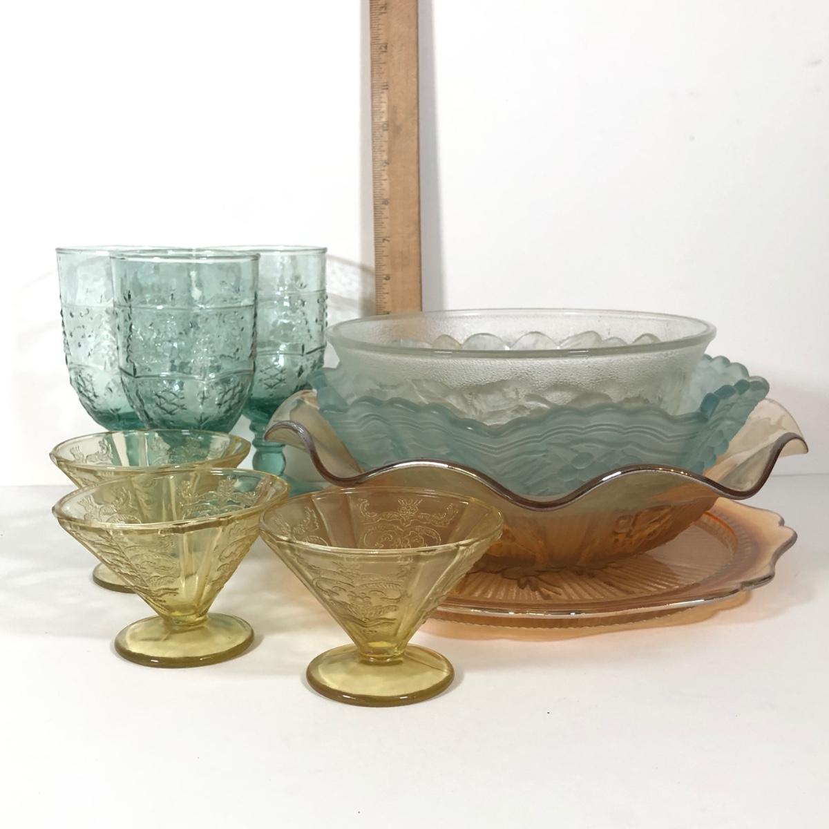 LOT 263L: Vintage Glass - Carnival Marigold Bowl & Plate, Tinted Tree Glasses, Frosted Bowls & Vaseline Cocktail Glasses