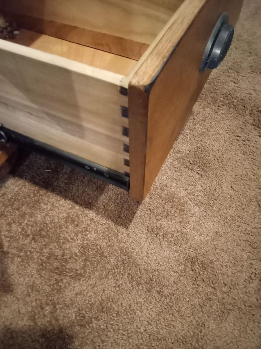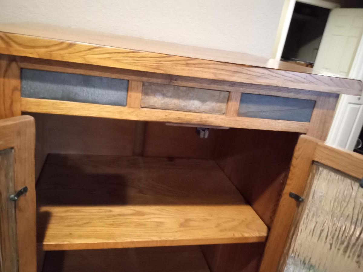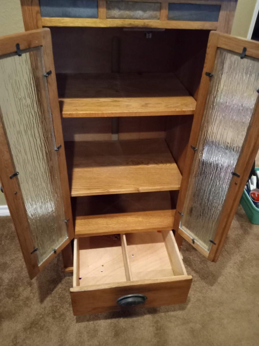 THE DRAWER IS DOVE TAILED, 3 ADJUSTABLE SHELVES, VERY GOOD SHAPE, 24" X 18" X 47.5"