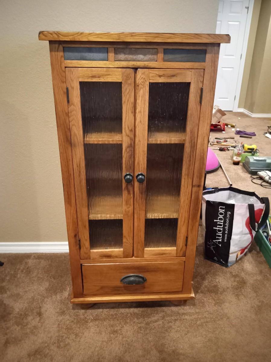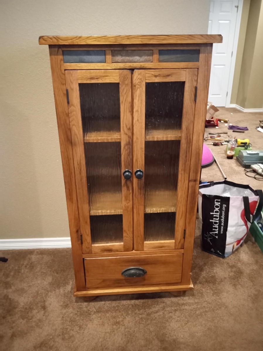 LOT 264  SOLID WOOD GLASS FRONT CABINET WITH DRAWER AAND TRAVERTINE ACCENTS