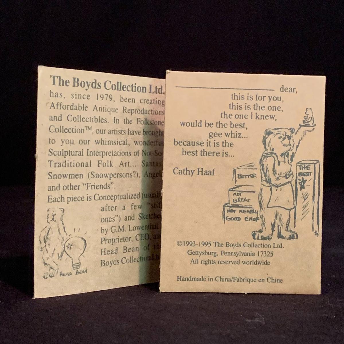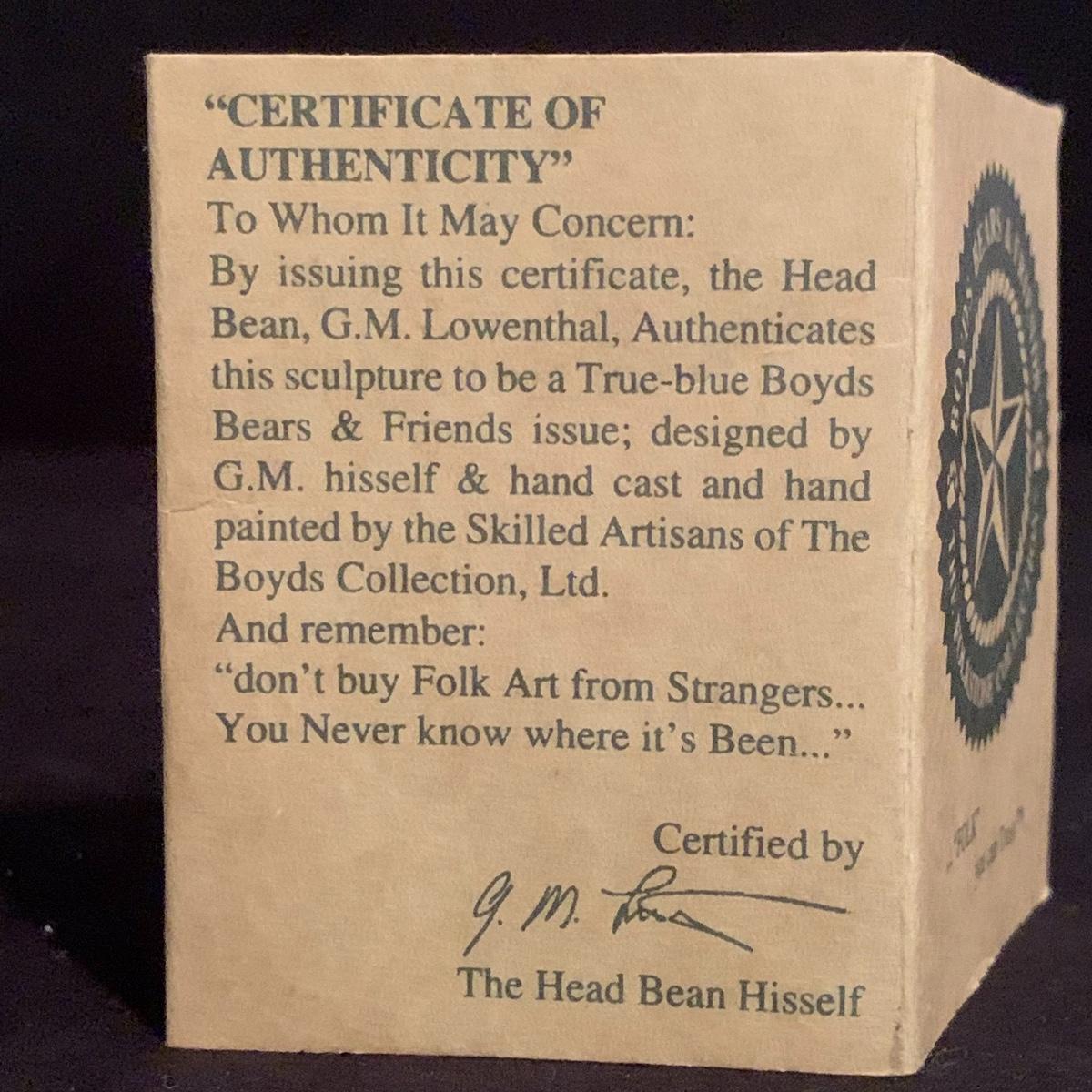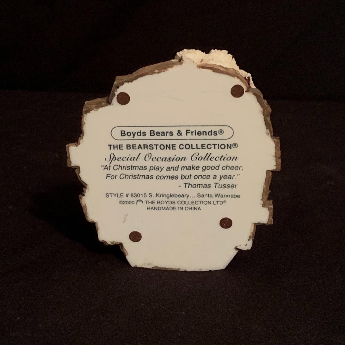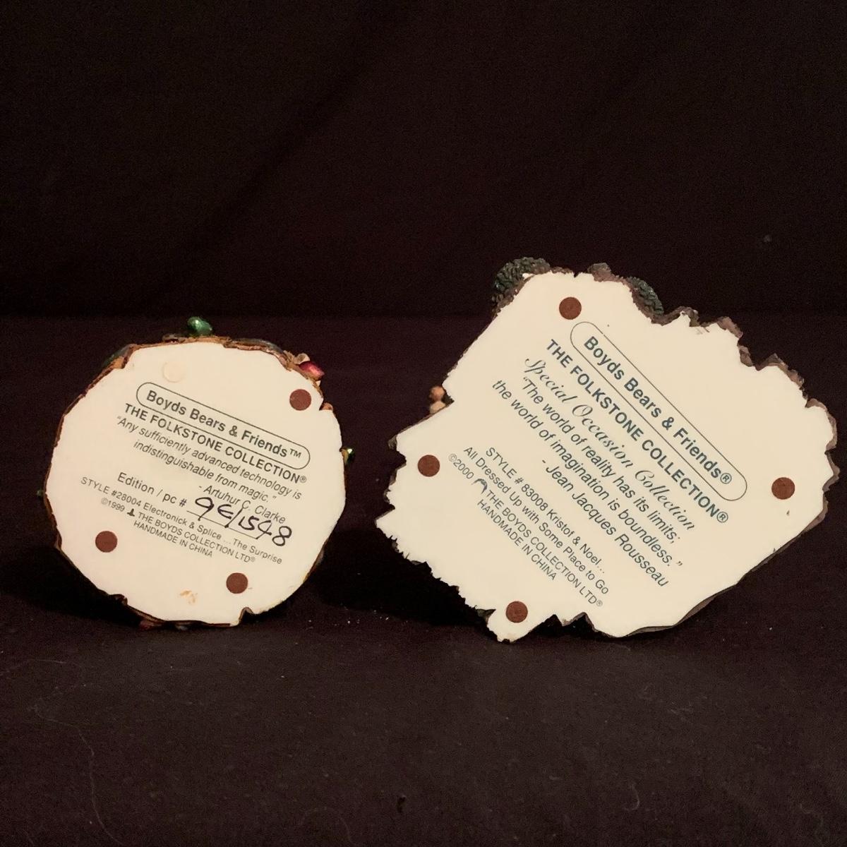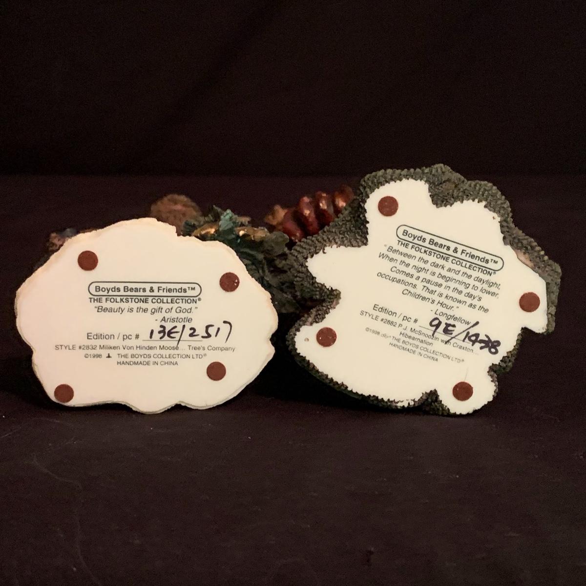 This lot contains seven Boyd’s Bears & Friends Christmas themed figurines. Six are from the Folkstone Collection and one is from the Bearstone Collection. There are four Santas, two bears, and one moose. Once figurine has a broken tip of its Santa hat that could easily be glued back on. The tallest figurine stands at about 8.5” and the smallest is 4” tall. One certificate of authenticity is included from the Folkstone Collection. Shipping available.