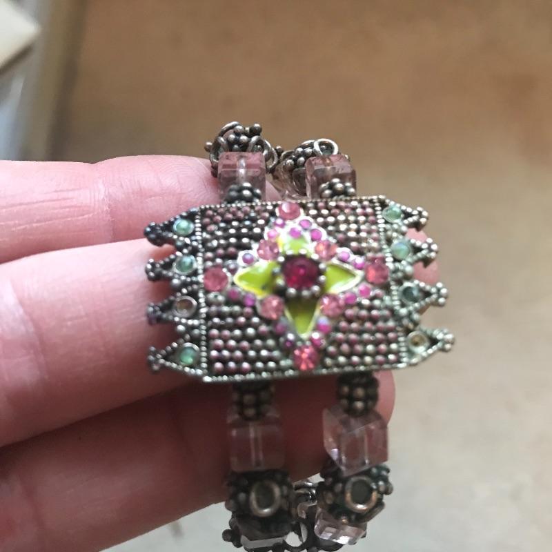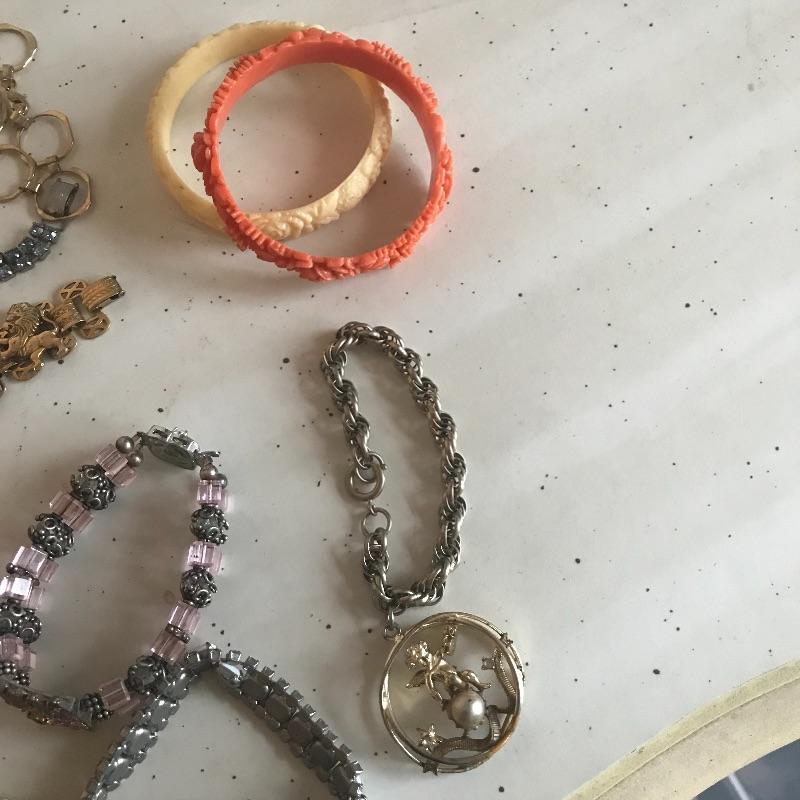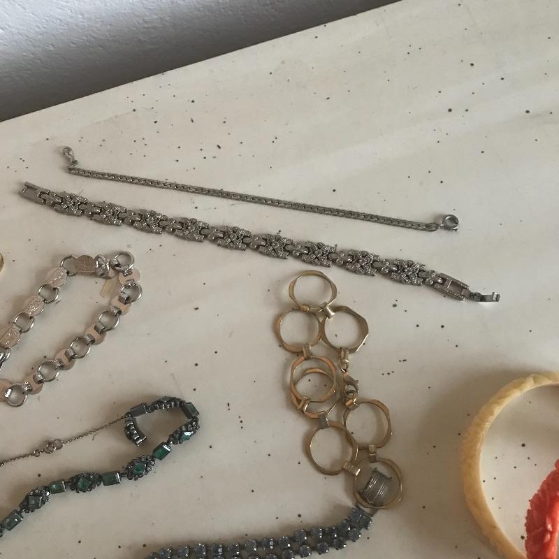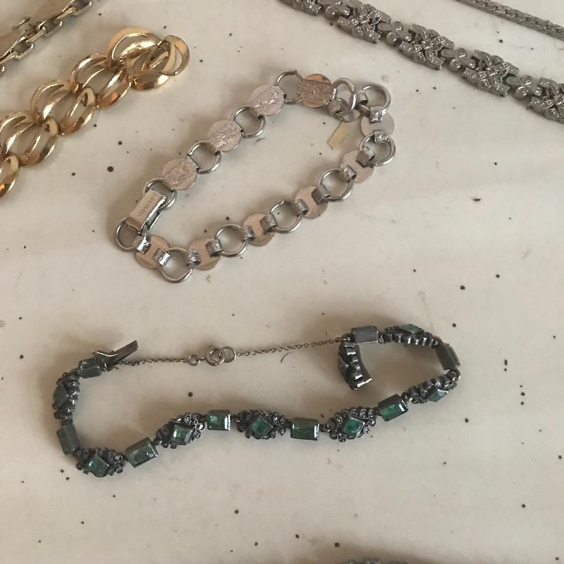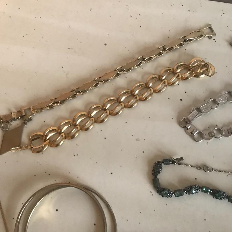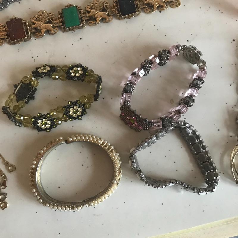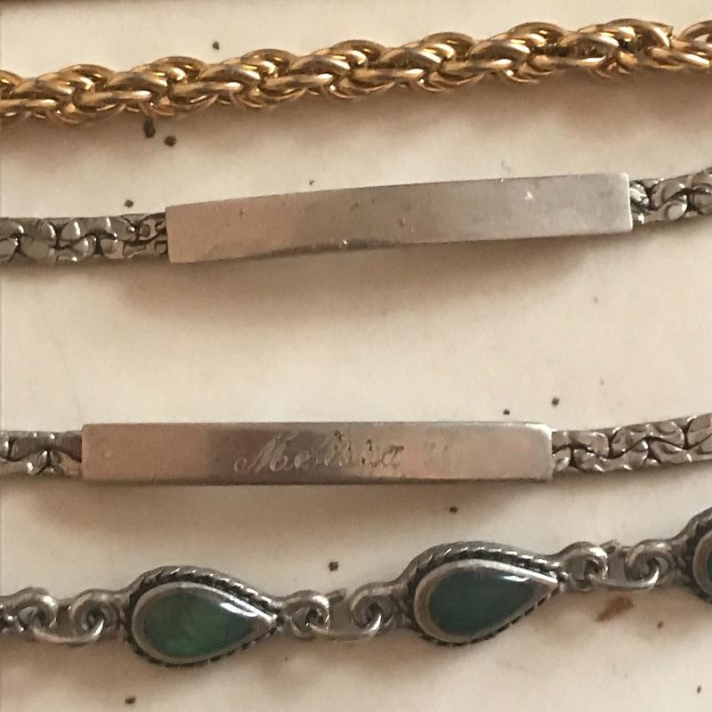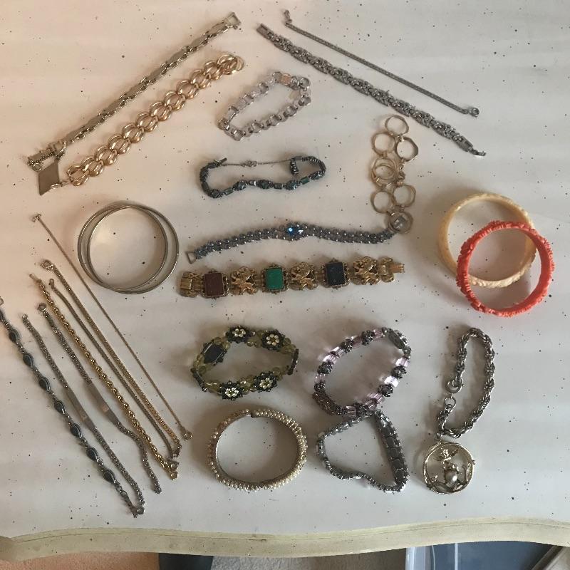 Twenty four bracelets and an anklet. These pieces vary from bangles to gem stones on elastic which one is in need of repair. ID bracelets with one reading Melissa. Shipping available.