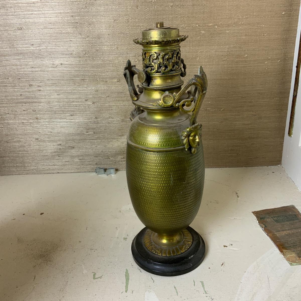 Brass and Marble Lamp Base. Needs requiring. //::\\ Please see photos for details and condition. No attempt has been made to hide any imperfections. All items listed in this auction are warehouse items, and need to be cleaned. A majority of the items need restoration as well. All items are sold AS IS and WITHOUT GUARANTEE. If you are uncertain about an item, DO NOT BID. Due to the nature of this online auction in-person inspection is HIGHLY recommended. All Sales are FINAL. Pick Up Times are FIRM. Please confirm with your own schedule that you can pick up in the scheduled times listed in the Terms and Conditions. Any questions please message the auctioneer. DO NOT Contact The Harp Gallery.