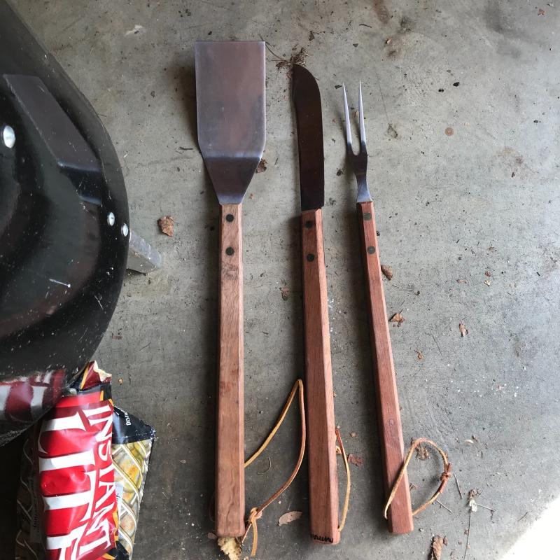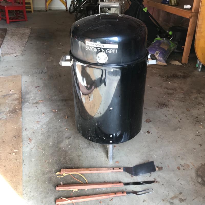 Brinkman Smoke “˜N Grill with barbecue utensils appears barely used! It’s been stored in a garage and needs some cleaning. Three long grill utensils with wooden handles also appear to be lightly used, the are labeled with “Mattison”. A few leftover charcoals included to sweeten the deal! No shipping.
