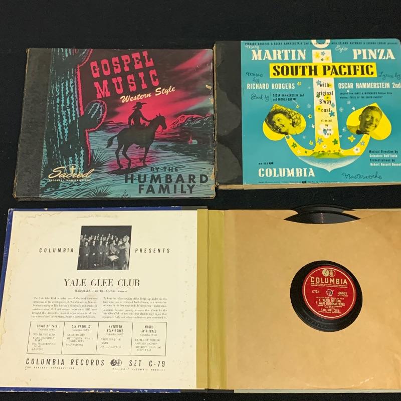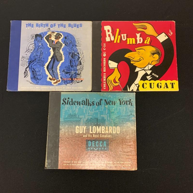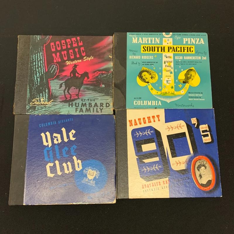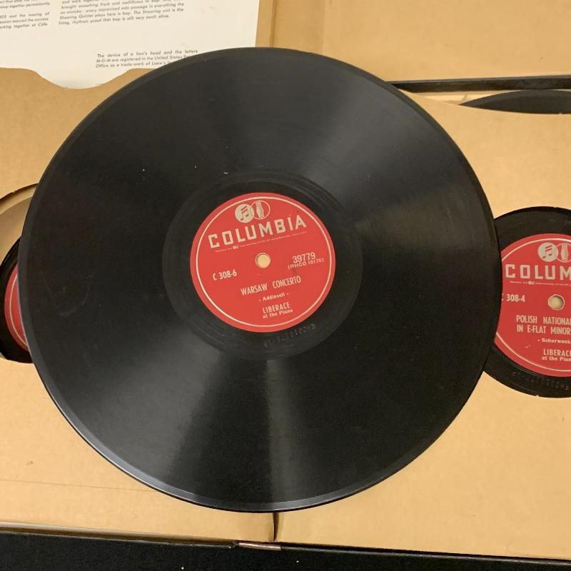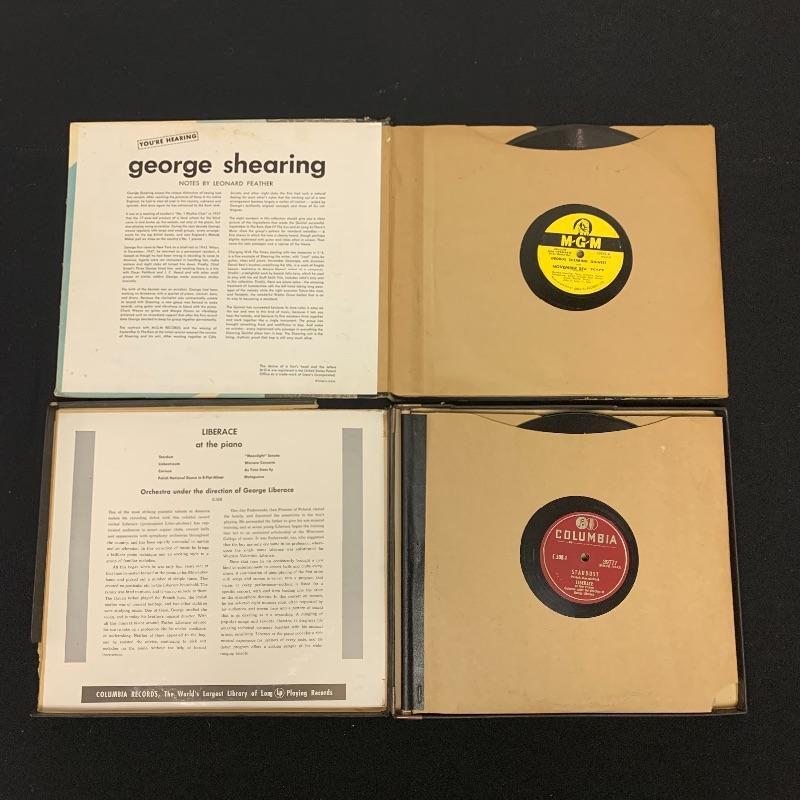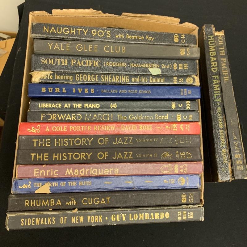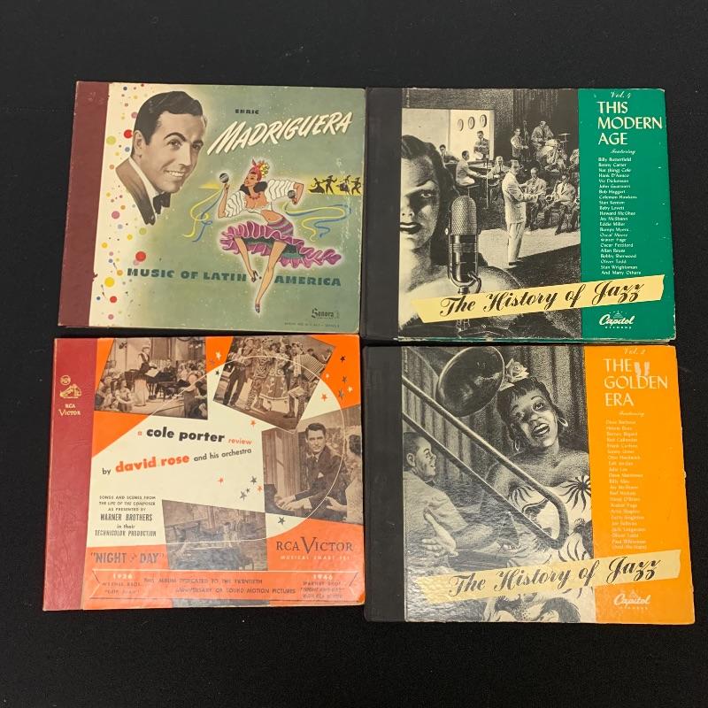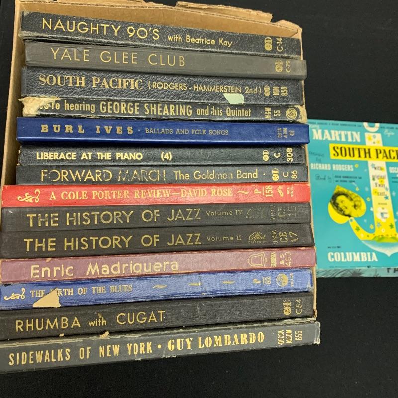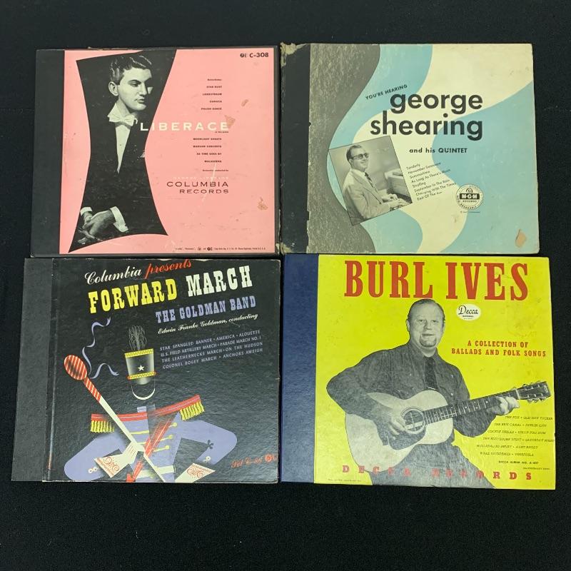 All are 10” 78 vinyl record sets. Examples of sets include: Rhumba with Cugat, Naughty 90’s with Beatrice Kay, Liberace at the Piano, The History of Jazz, and more! See photos to see all sets that are included.