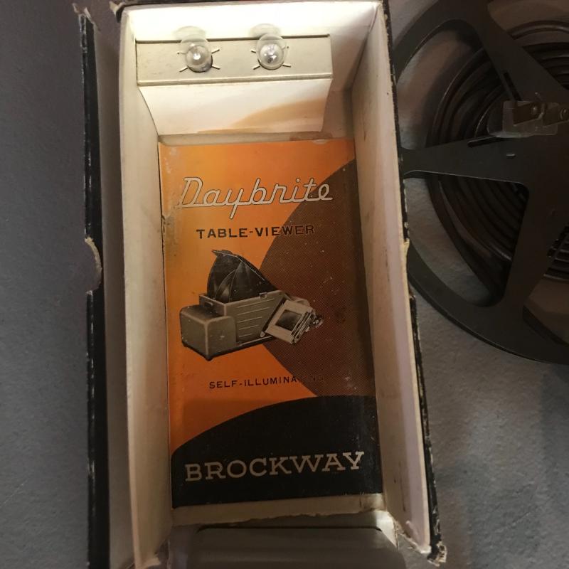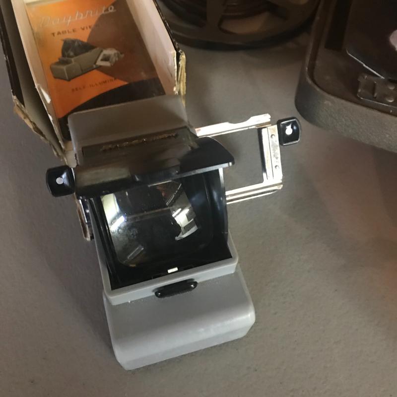 8mm automatic threading projector appears to work but bulb may be burnt out. Brockway Daybrite Table viewer for slides has extra bulbs. Local pick up only.
