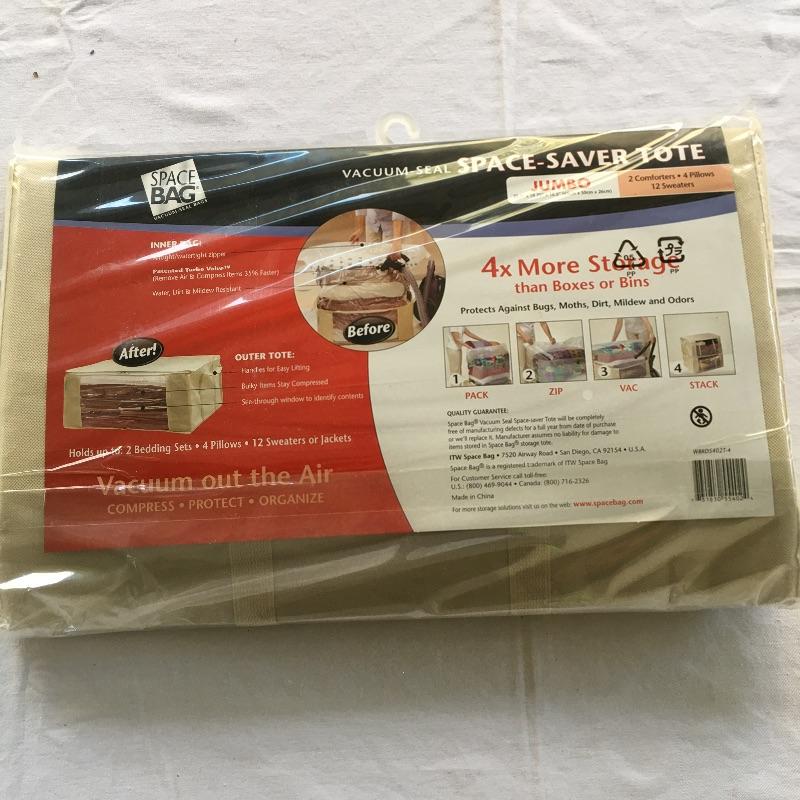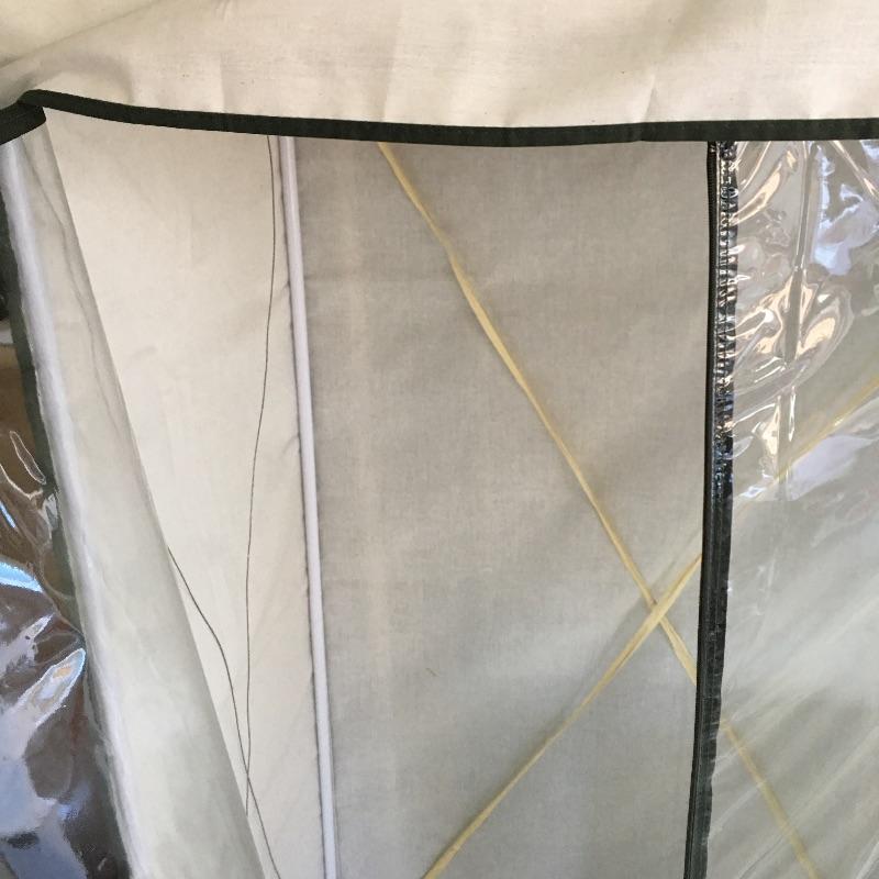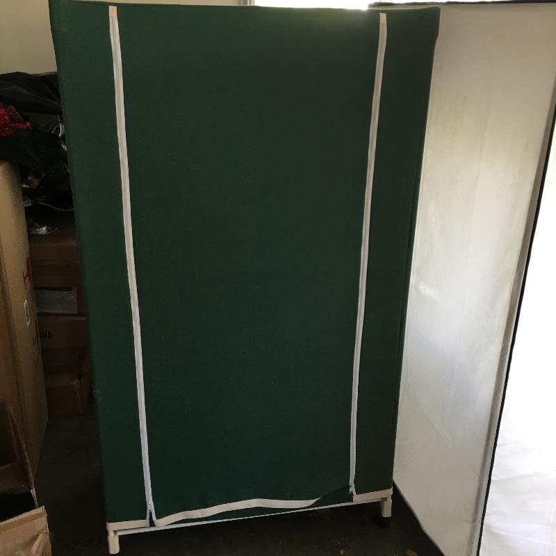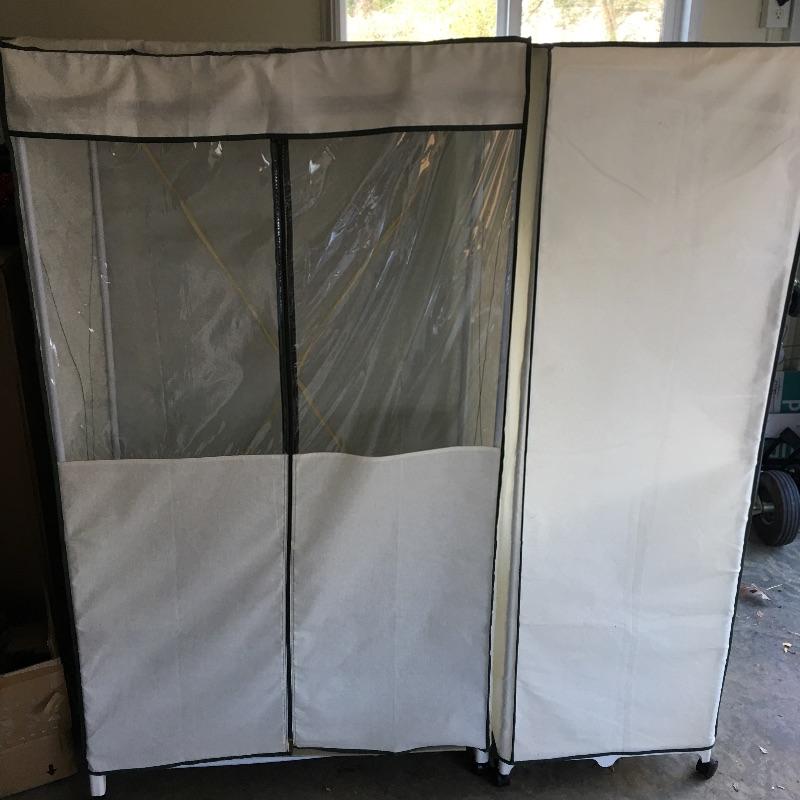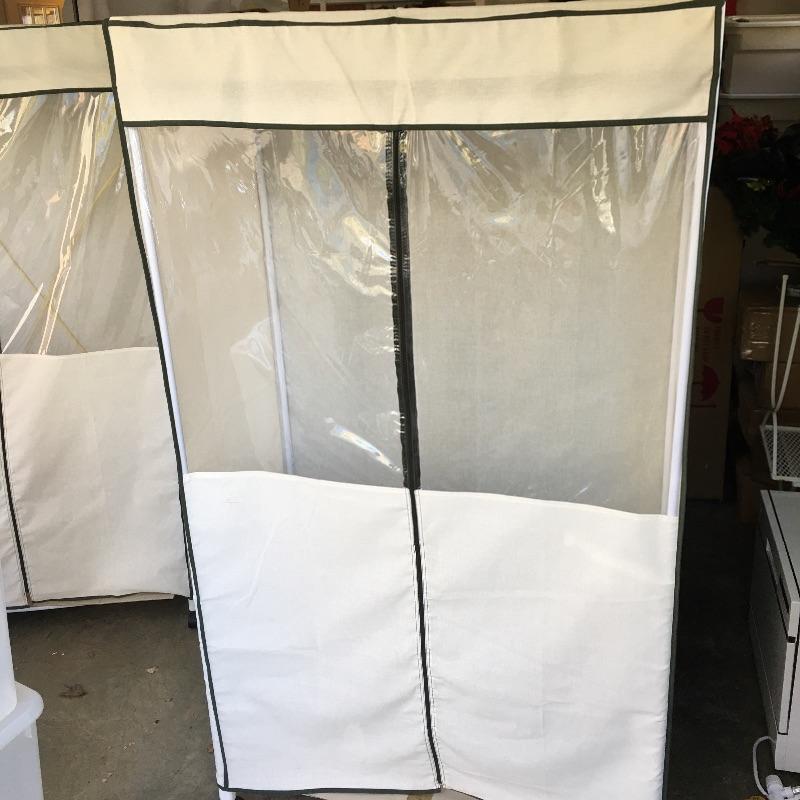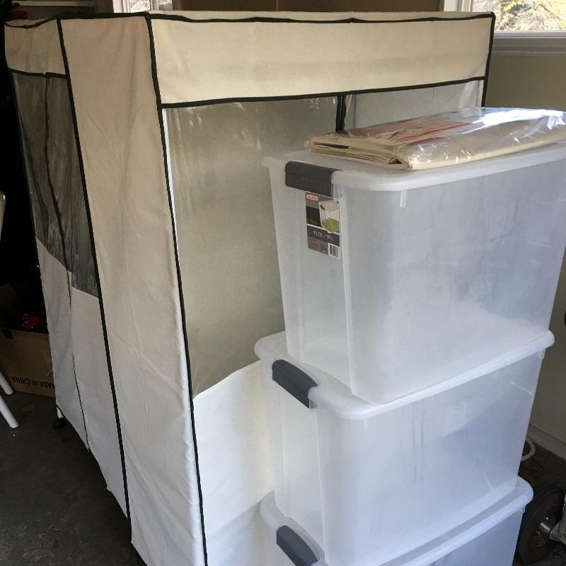 Three rolling wardrobes, three plastic bins with tops and a space saver tote. A great way to store your clothes so you can see them, but they stay clean. Wardrobes each measure 19” x 35” x 63.5”.
