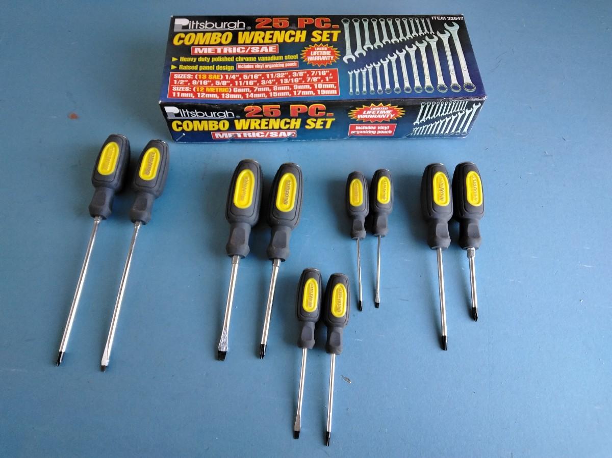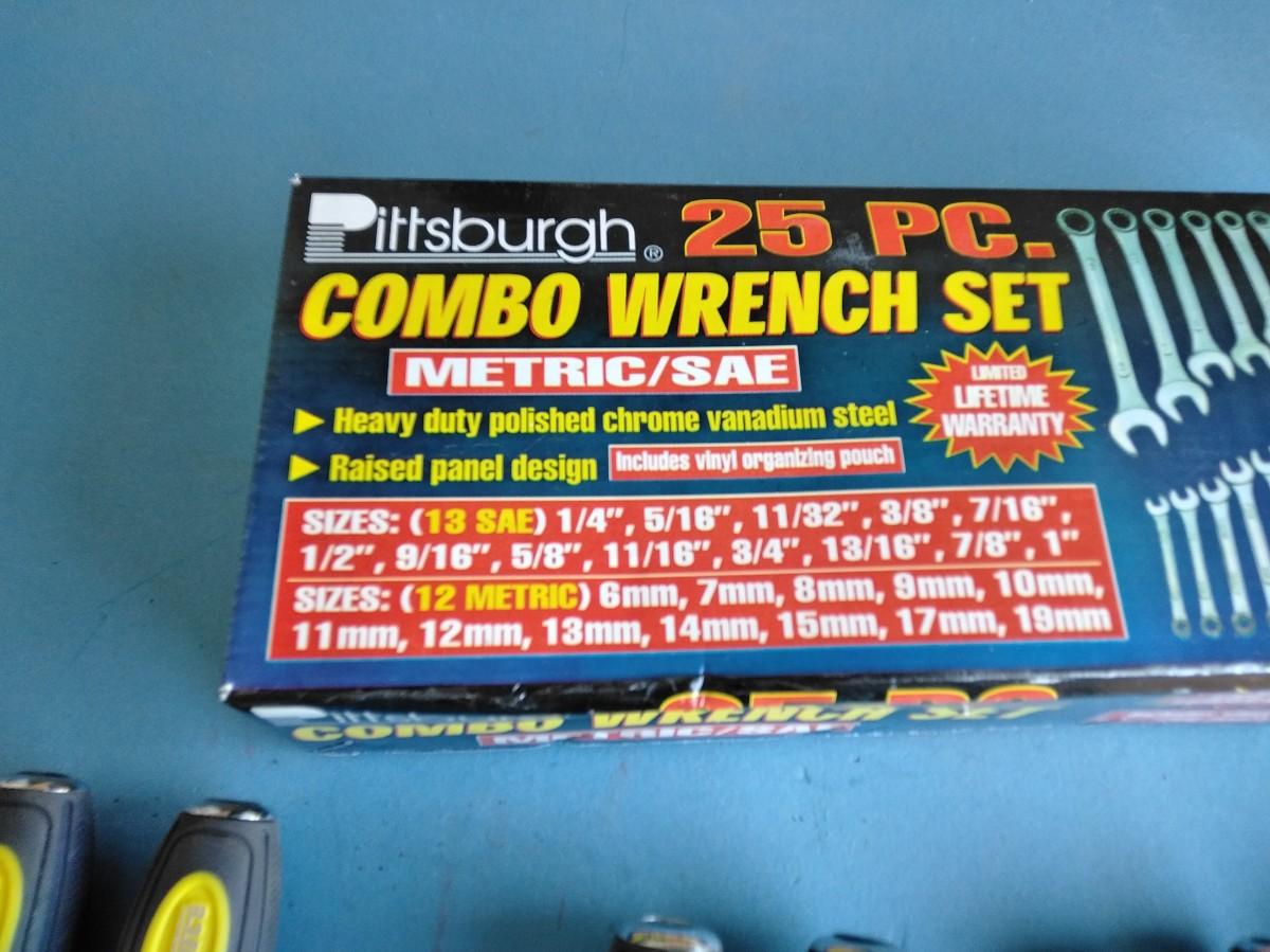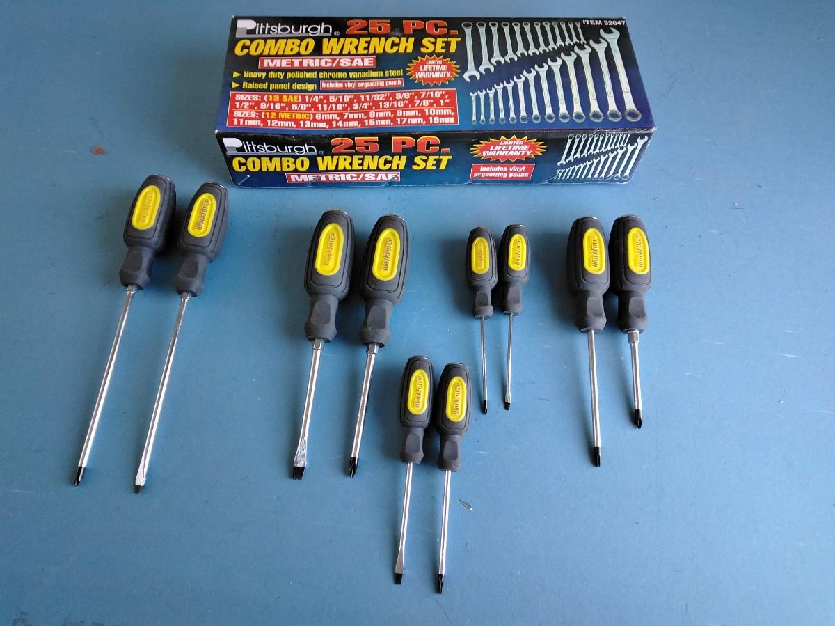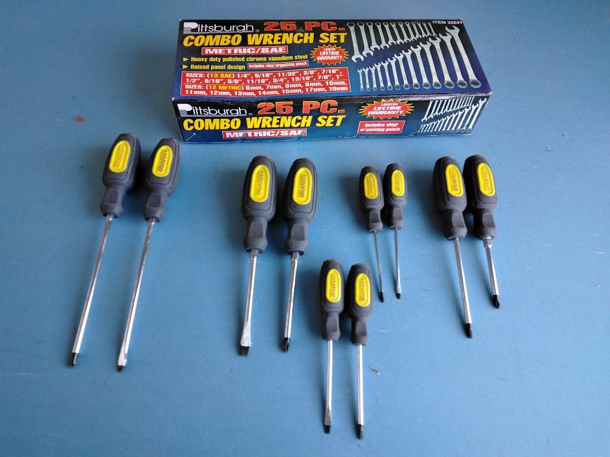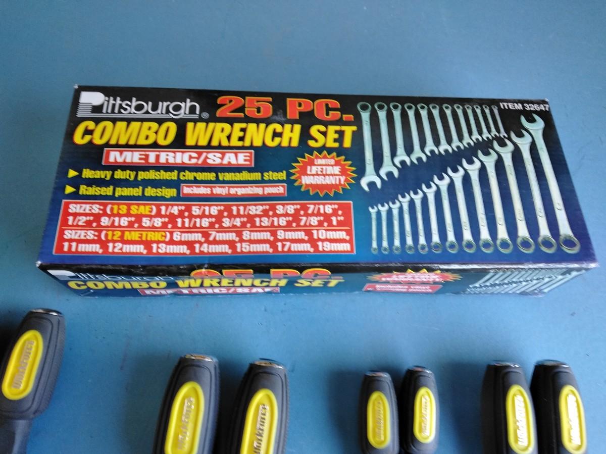 SCREWDRIVERS WITH A NEW PITSBURGH 25 PIECE COMBO WRENCH SET.