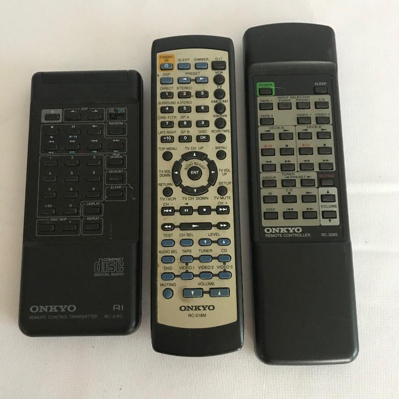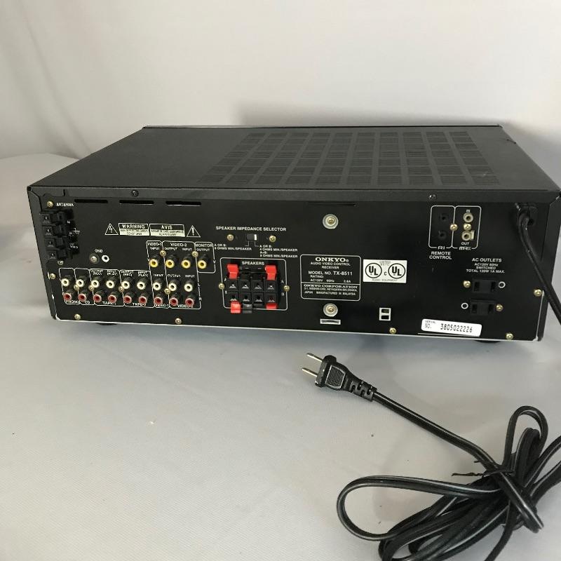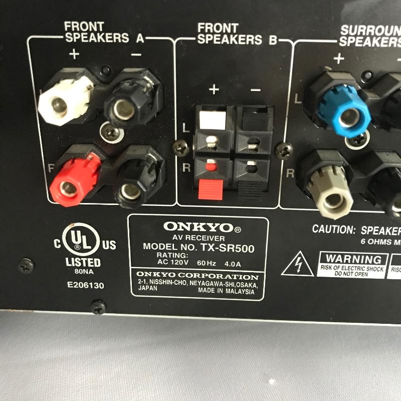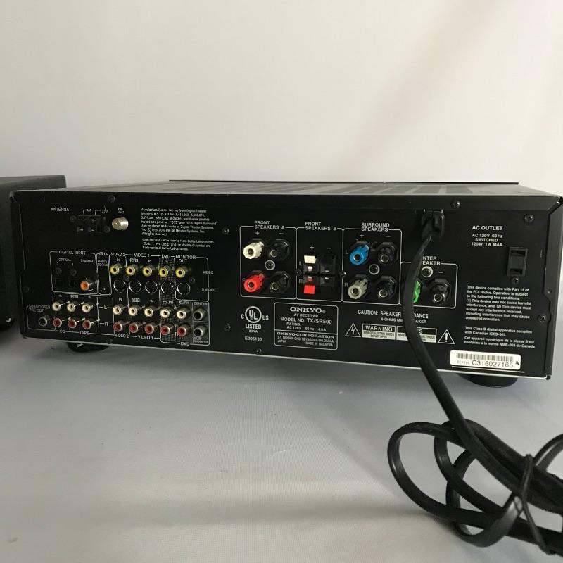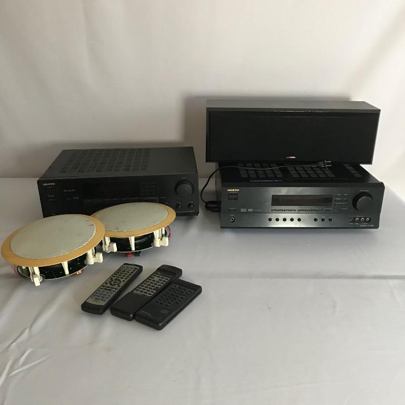 Two high quality Onkyo A/V receivers with three companion speakers and remotes. AV Receiver TX-SR500 and the Audio Video Control Receiver TX-8511 both turn on when plugged in. Two Polkaudio RC60i ceiling speakers and one Polkaudio 6.5” x 7.5” x 20” speaker included. Lot is complete with three Onkyo remote controls. We are unable to test working conditions for speakers and remotes. All electronics have a substantial weight and appear in good shape. See photos.