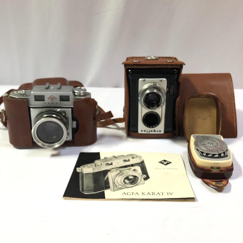 A superb assortment of vintage cameras and more in this lot. The Agfa Karat IV comes with original leather carry case, manual and box. See images for all lens information. The Argus Argoflex also comes with its original leather case that appears to be ripped, see images. Also included is a Horvex light meter with original case.